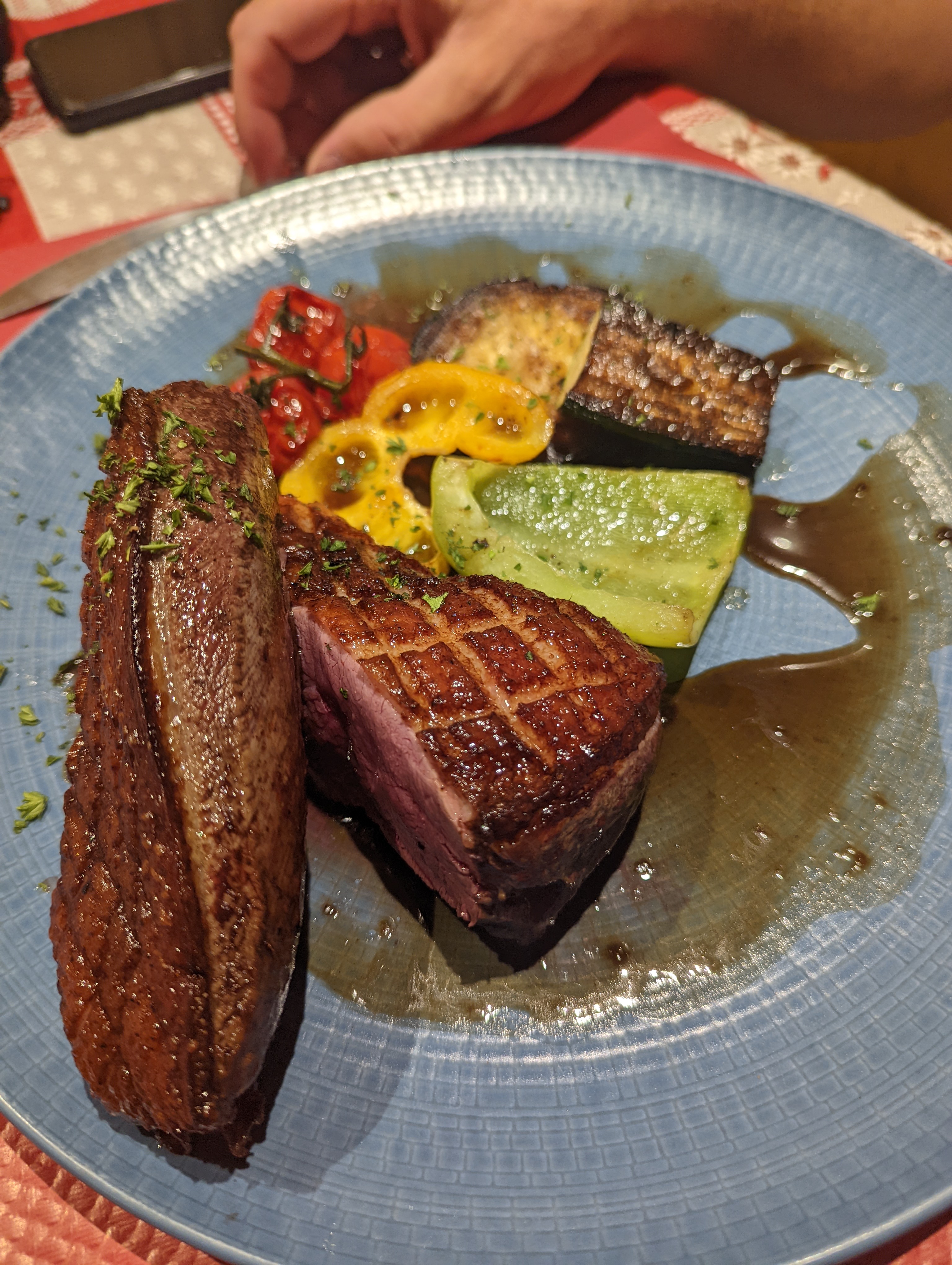 La soupe aux asperges était savoureuse et délicieuse. Nous avons sans doute fait le mauvais choix pour le plat principal : un carpaccio, standard, sans particularité, au prix de 23 €. Et une tête de veau composée principalement de graisse, malheureusement peu comestible.