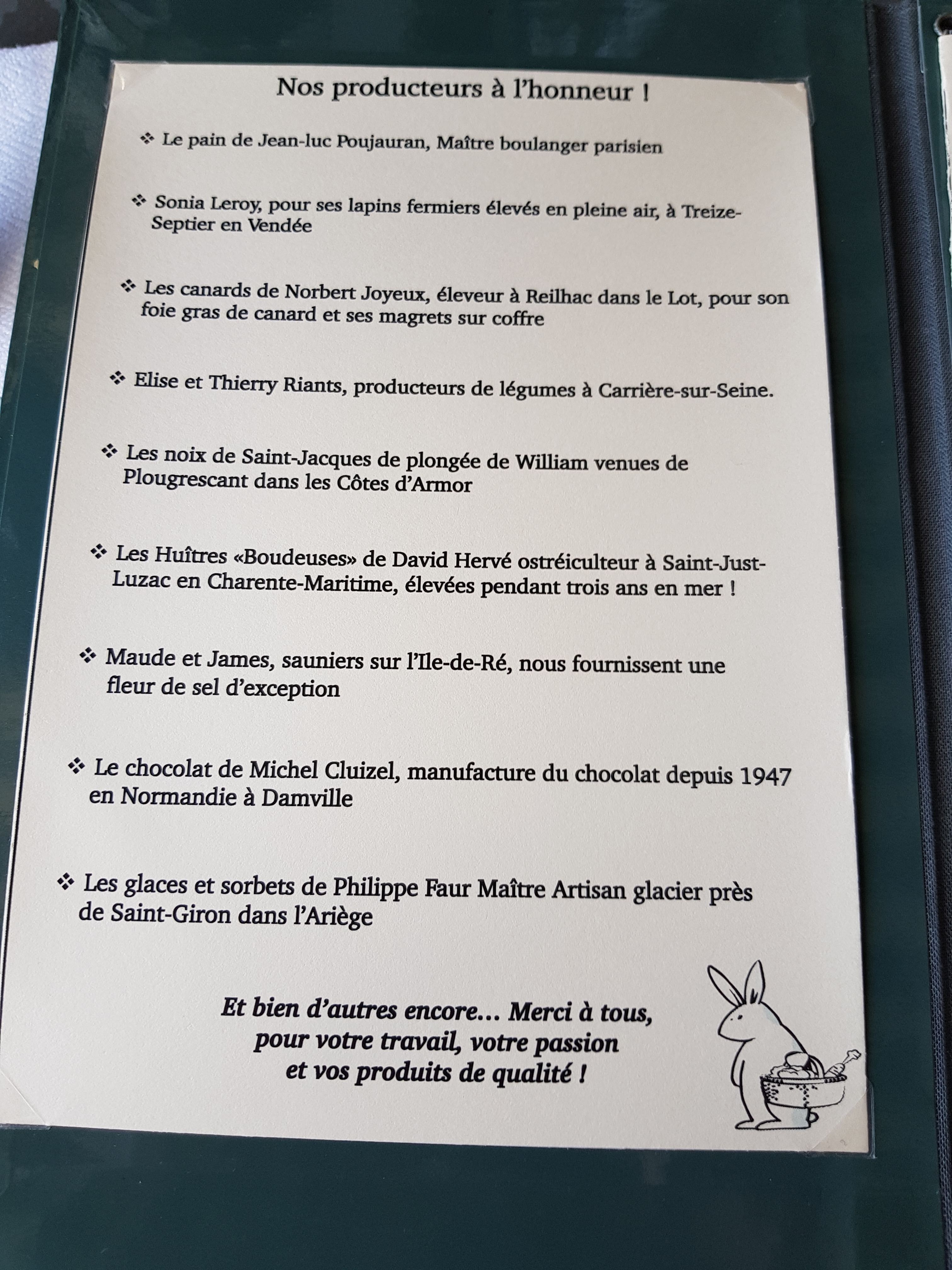 Un peu déçue par le lapin cette fois-ci alors que je gardais un très bon souvenir de cette adresse. Par contre, je salue la qualité du service et l'atmosphère onirique du lieu toujours au rdv. J'y retournerai, bien entendu, cette une institution familiale que d'y aller dîner ;)