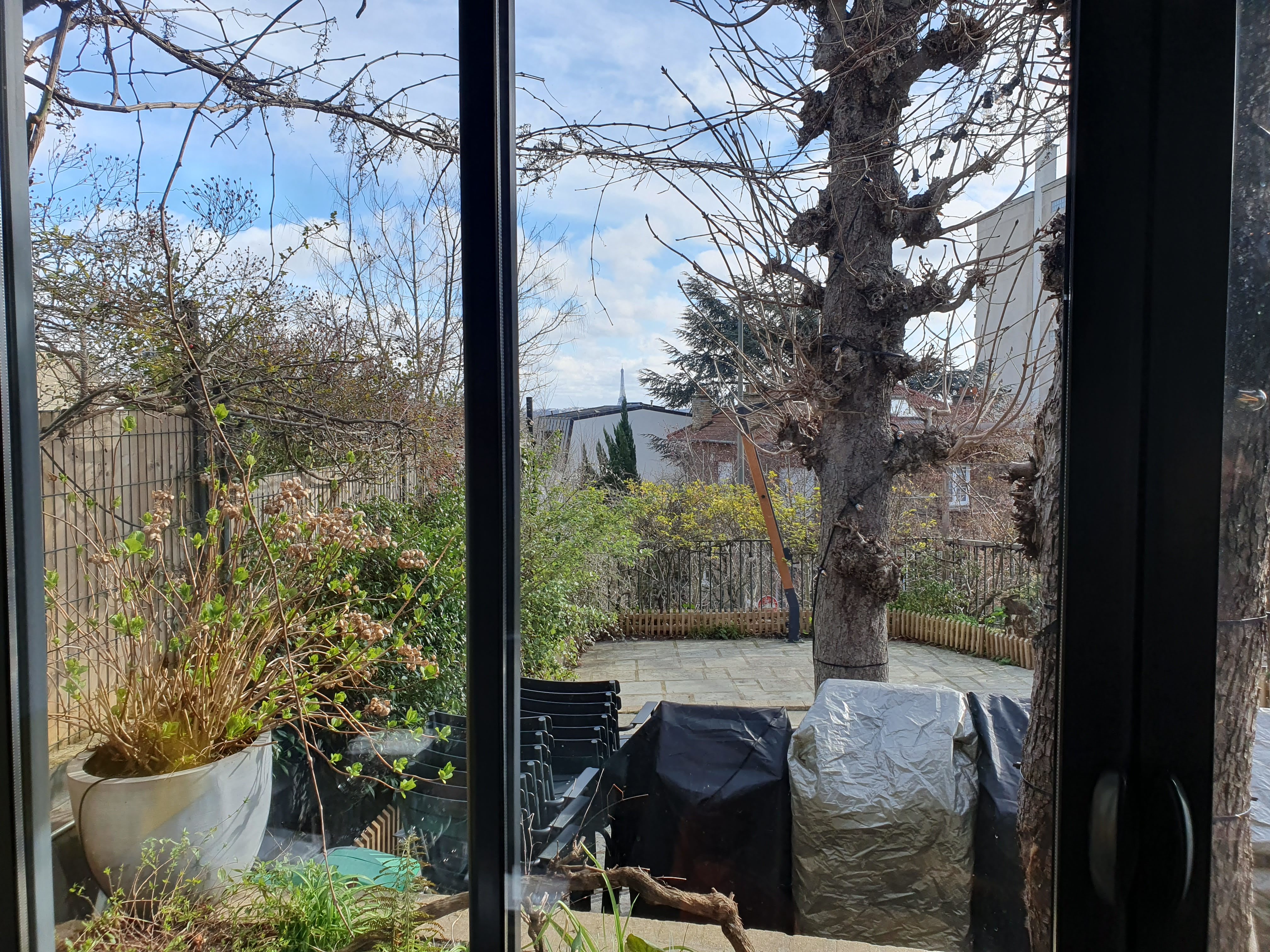 Très beau cadre (extérieur tout comme intérieur), excellents mets. Rien à dire à part un grand bravo. J'ai mis 5 étoiles, mais une toute petite amélioration du service pourrait être une piste de réflexion (attention des serveurs et façon de poser les assiettes sur la table) . Je dis ça, je dis rien.... Photo prise de la terrasse. On peut aussi y voir la Tour Eiffel. Encore une fois, bravo !