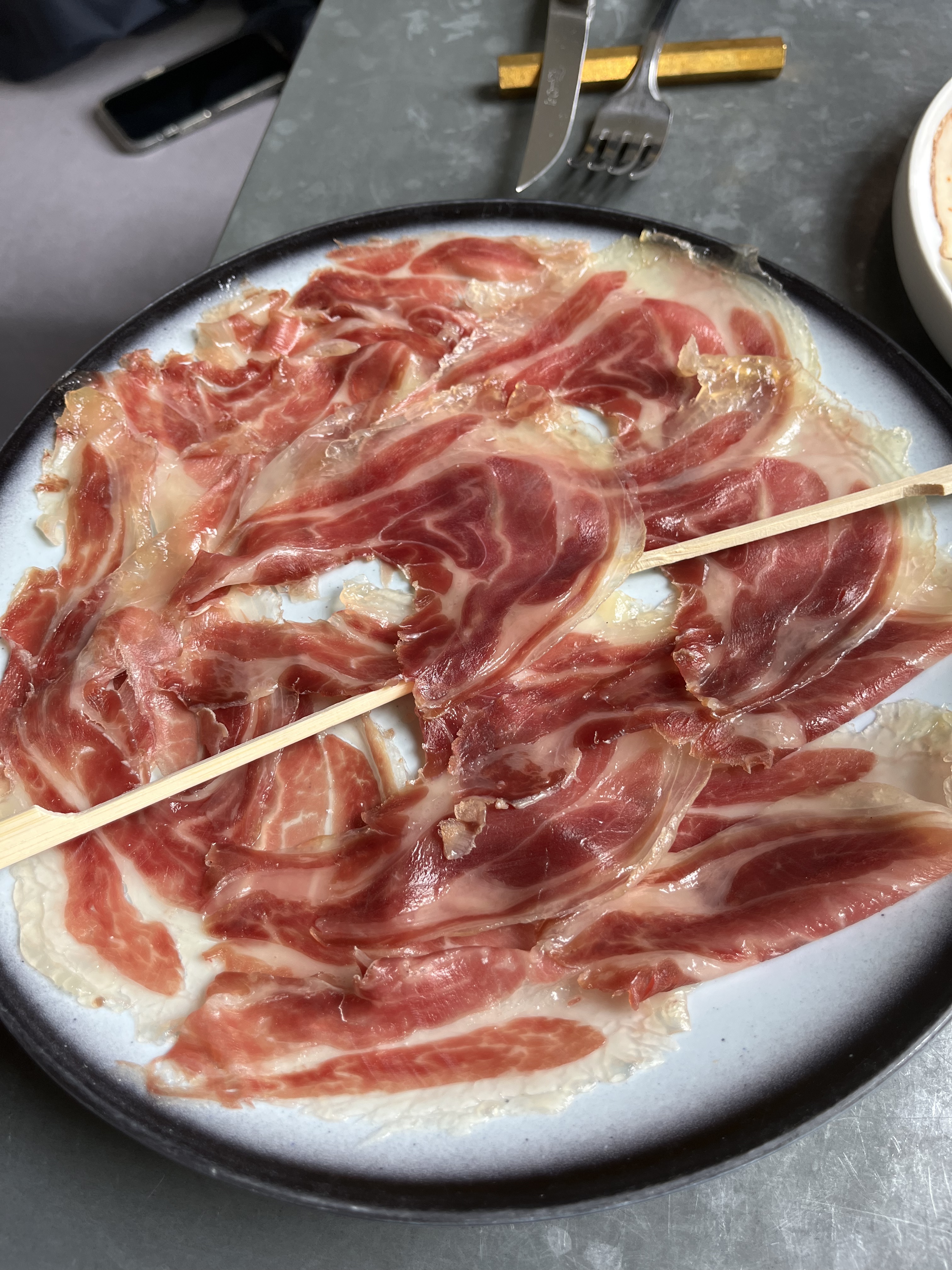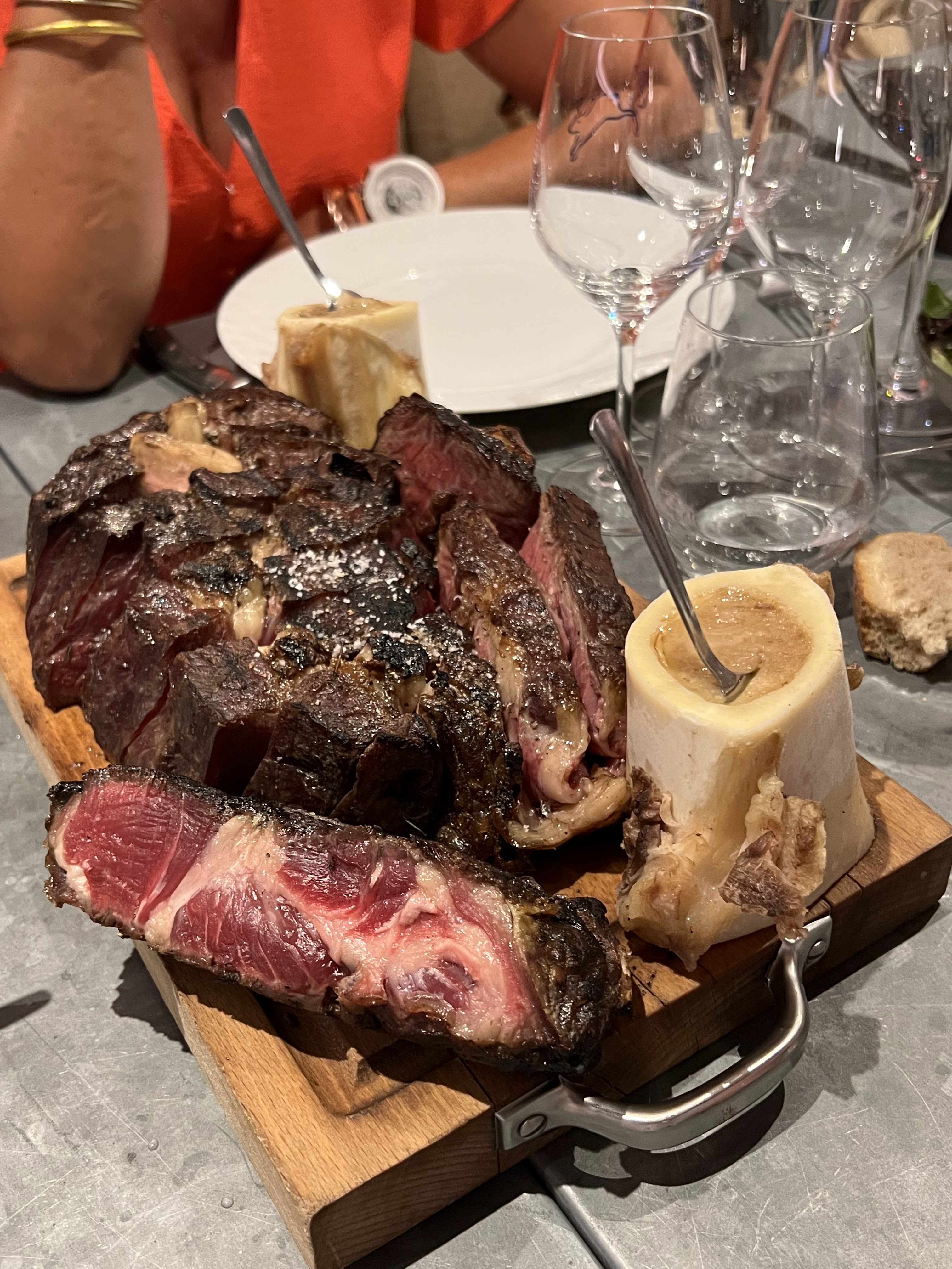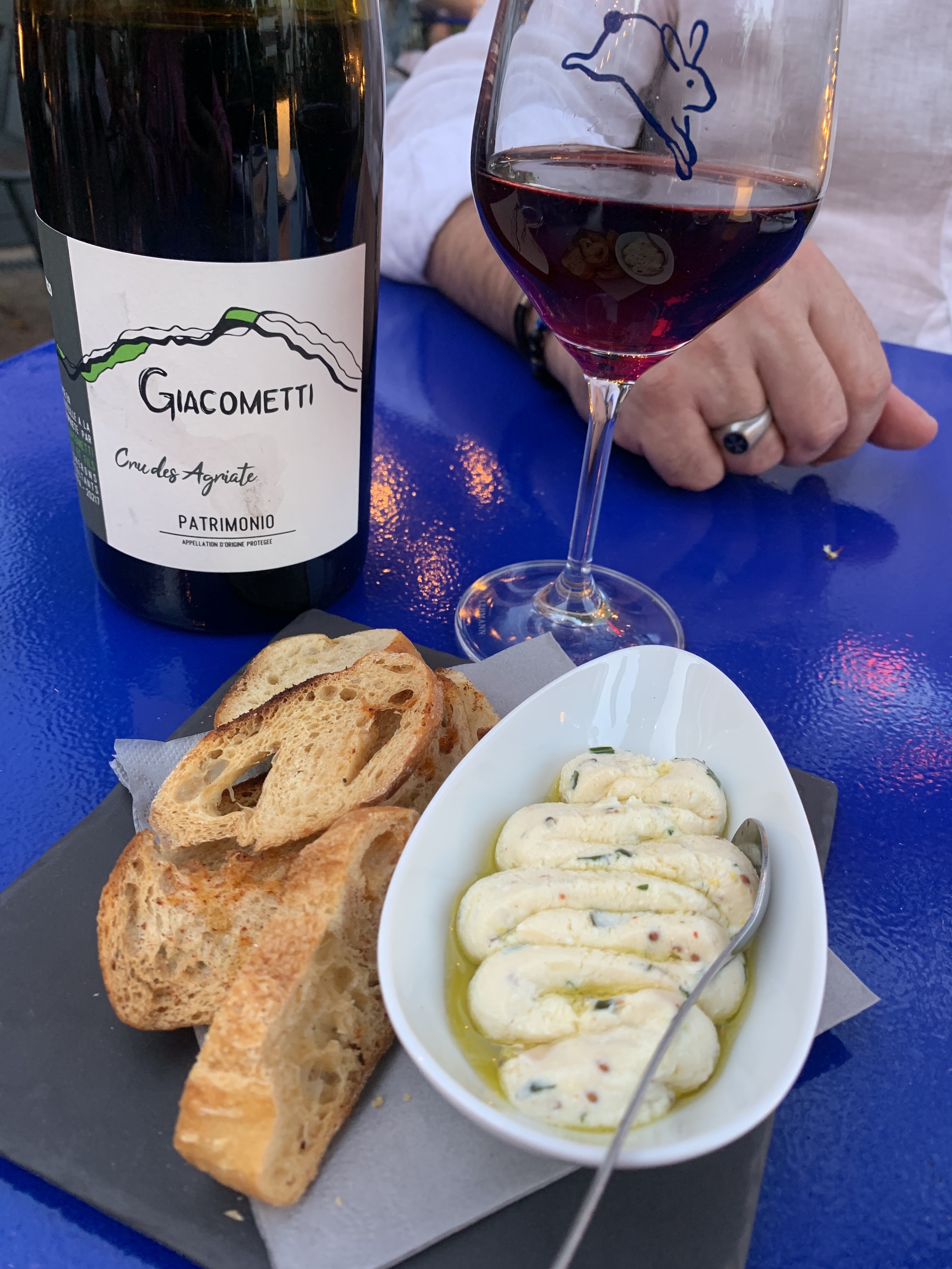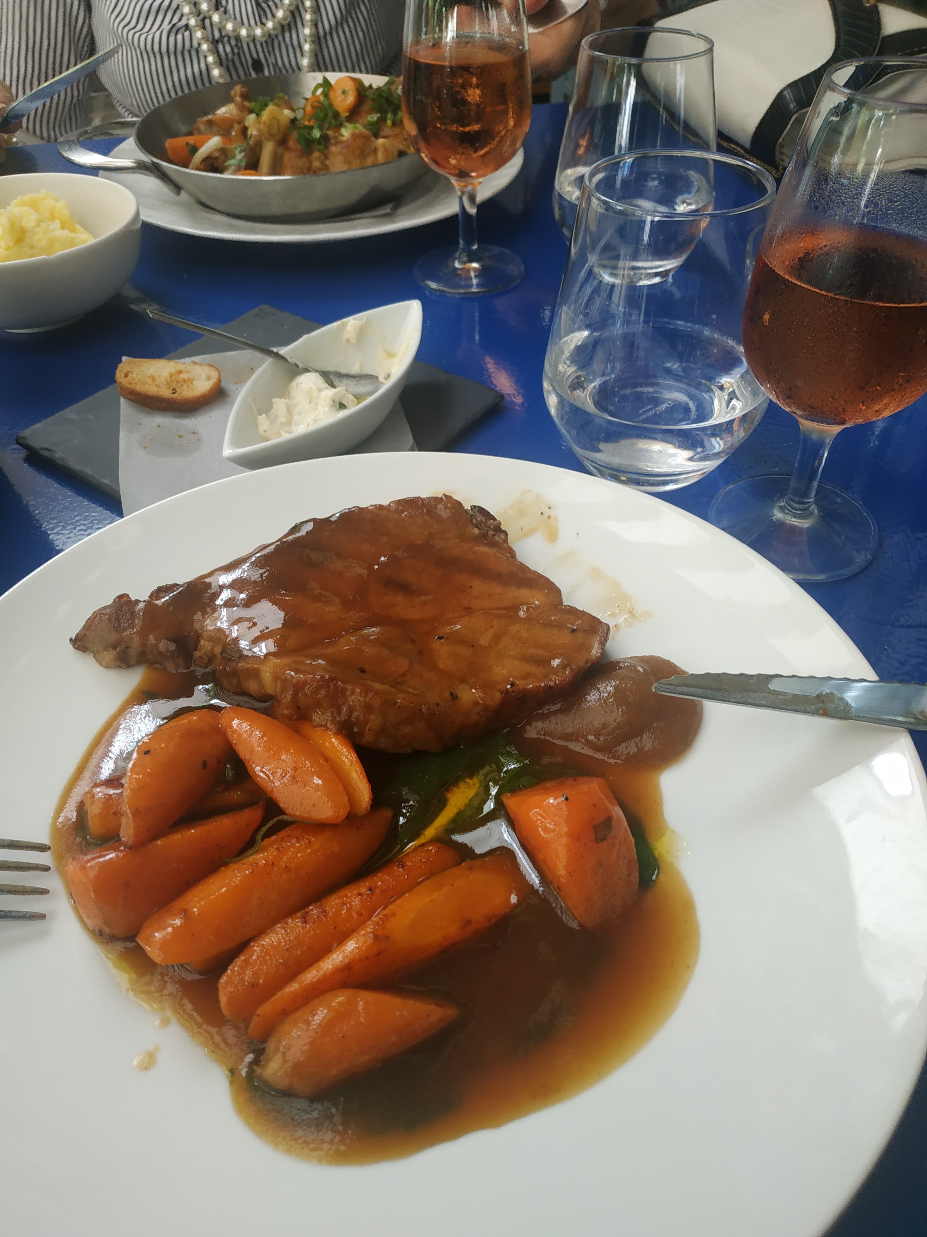 Encore un dîner délicieux hier soir au Père Lapin ;-) Apéritif à l’extérieur puis dîner à l’intérieur en raison du risque d’orage mais cela ne nous a pas empêché de passer un très bon moment grâce à Johann et son équipe. Des entrées à partager, Œuf dur mayonnaise, picanha de poitrine de bœuf comme un pastrami, Carpaccio de Daurade royale, pastèque et oeufs de poisson volant, Assiette de de Coppa et Chorizo, suivis d’une Côte bœuf pour trois et d’une joue de bœuf braisée fondante à souhait accompagné de carottes glacées le tout arrosé d’un Fixin 1er cru Clos de la Perrière de chez Joliet vue tout était réuni pour que nous passions une très belle soirée. Et de notre table nous avions la Dame de Fer en perspective… Le bonheur. Je recommande et rerecommande ;-)