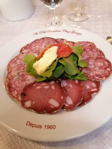 Après 650 kms depuis Nantes, je voulais faire découvrir les authentiques bouchons Lyonnais à ma fille. Avec, ce nom, chez Georges, je pensais que le lieu souhaitait conserver ses amis... Un peu surpris par les premières remarques rugueuses du tenancier envers les clients, je me disais que cela faisait partie du folklore. En fait, au fil du temps, on se rends compte que ce Monsieur rembarre ses clients pour se faciliter le service. Arrivés en 2nd, nous nous sommes aperçus que quelques choses clochait dans le service au bout de 30 mns. Les 4 groupes arrivés après furent servis avant nous. J'en fais la remarque au tenancier qui me retorque qu'il faut du temps pour faire de la bonne cuisine... En fait, il s'agissait de la fameuse assiette de charcuterie lyonnaise, 15 tranches de saucisson qui nous furent servies au bout de 50 mns, ce qui fait 3 mns par tranche de saucisson...sans la moindre excuses, Sans une feuille de salade ou un bout de cornichon. Une honte pour la gastronomie lyonnaise... Le couple d'anciens à la table à côté qui venait depuis 45 ans étaient également très déçu de la nouvelle carte. Seul le jeune serveur tire son épingle du jeu par sa serviabilité et sa gentillesse. A la fin du repas, l'ancien a essayé de se racheter avec un coup de gnole mais désolé, le mal est fait. En bref, soirée découverte gâchée par un olibrius qui devrait changer de métier. Mais lequel?