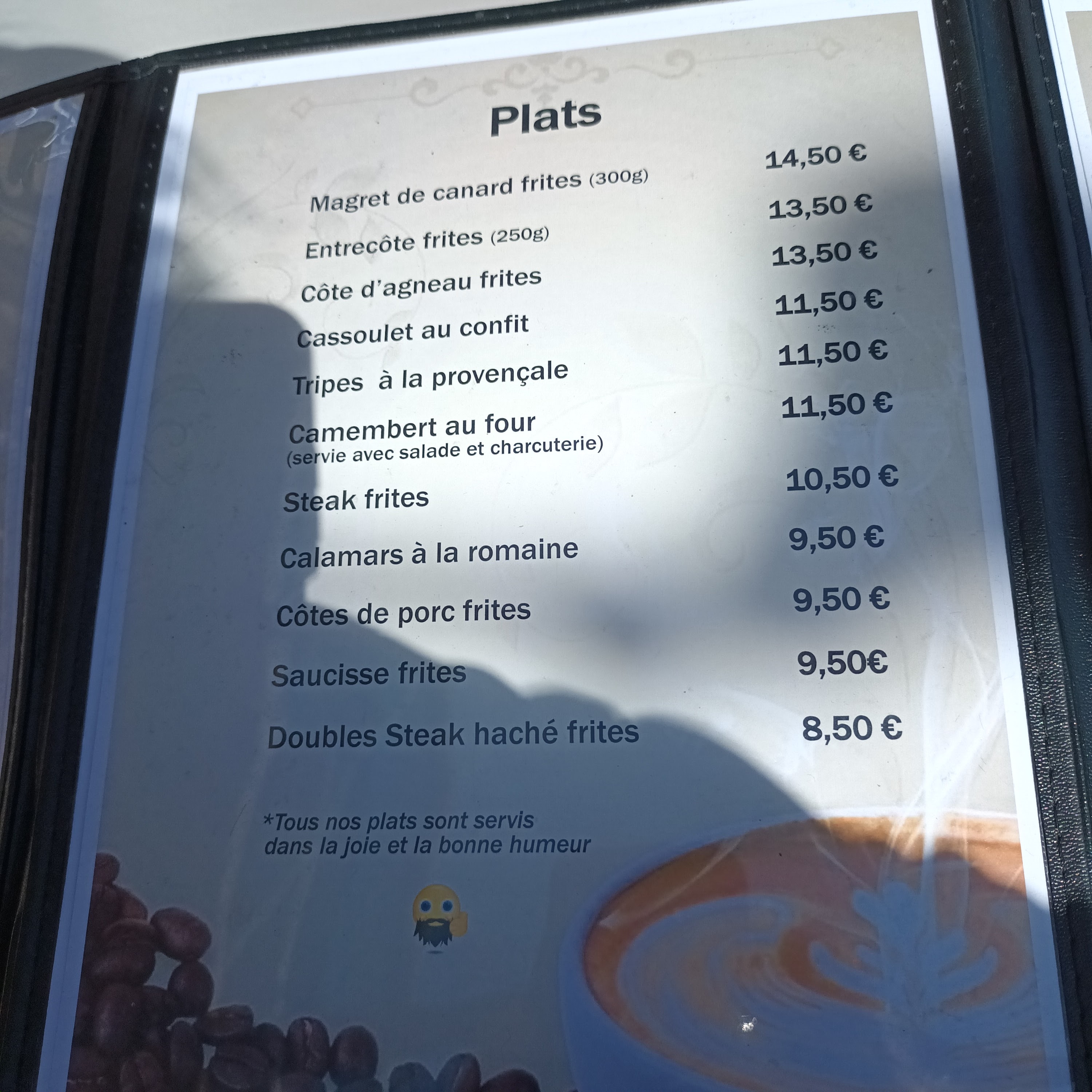 Surtout passer votre chemin . Repas merguez grosses comme saucisse que du colorant.frites congelees très sèches salade à un peu passée.Mais le prix pour cela surprenant avec un demi de rosé 38€30. Juste le plat pas d'entrée pas de dessert.