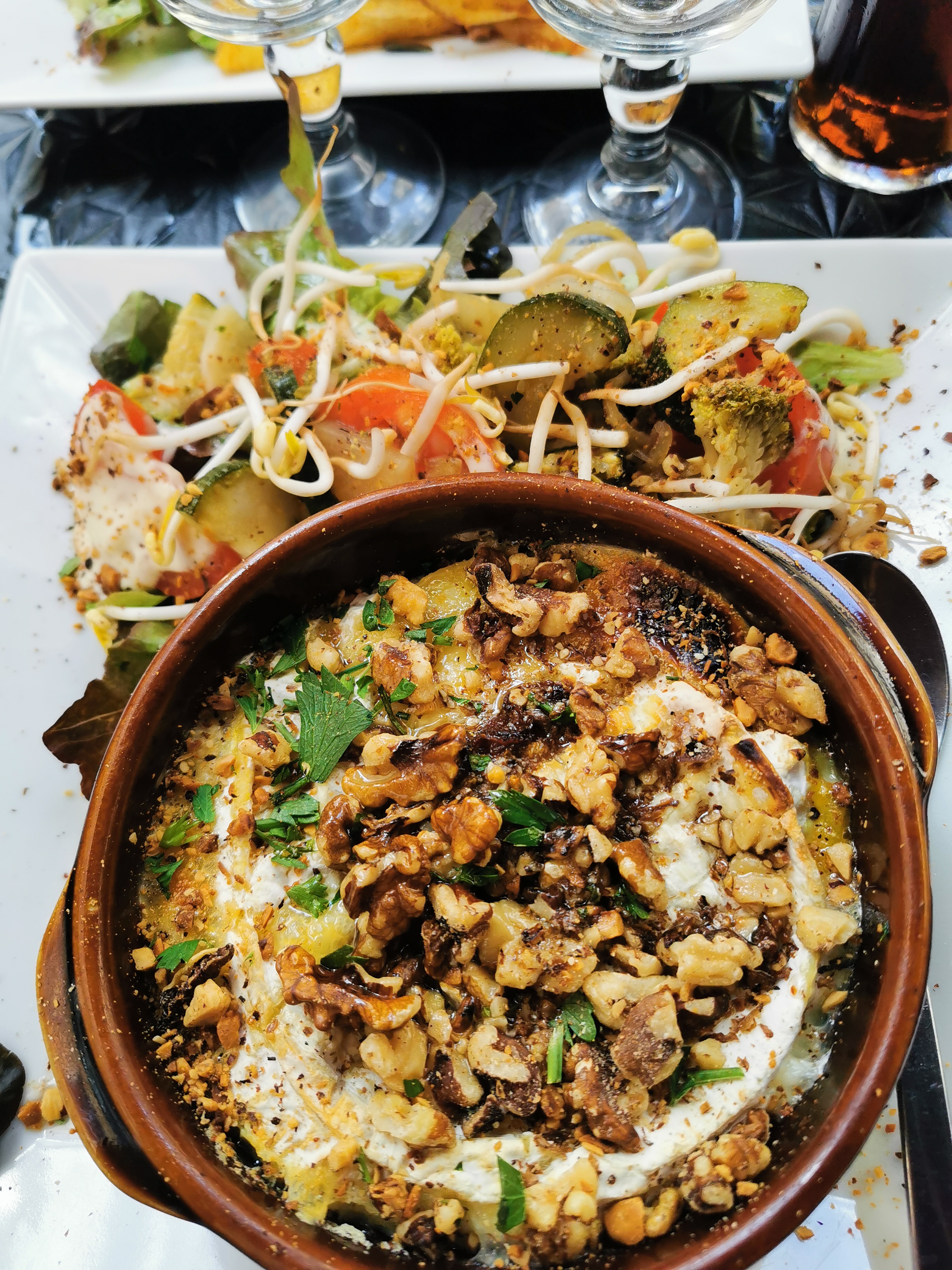 Outre la carte qui propose de belles suggestions (pour ma part le camembert rôti), on passe un moment fort agréable sous les parasols humidificateurs et l'accueil et le service sont au top 🔝.