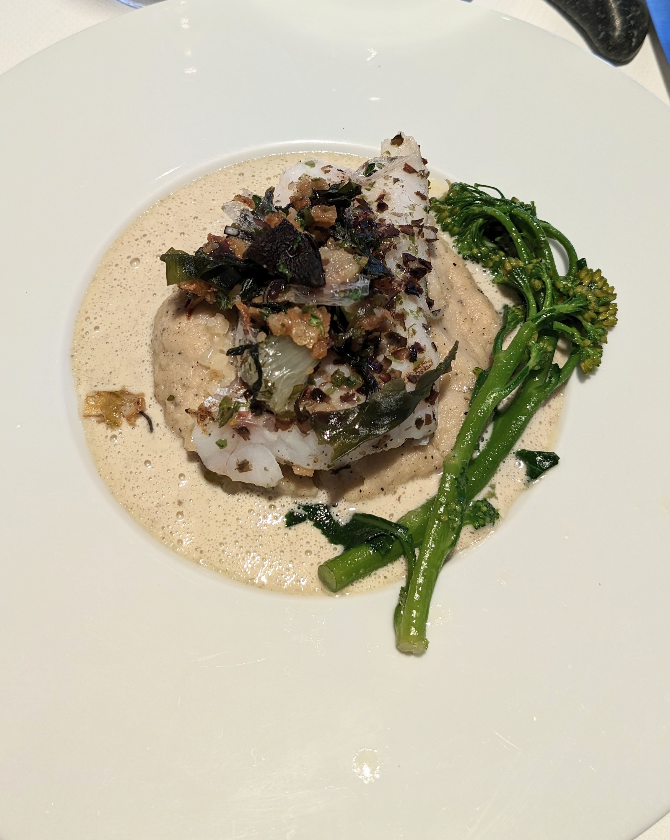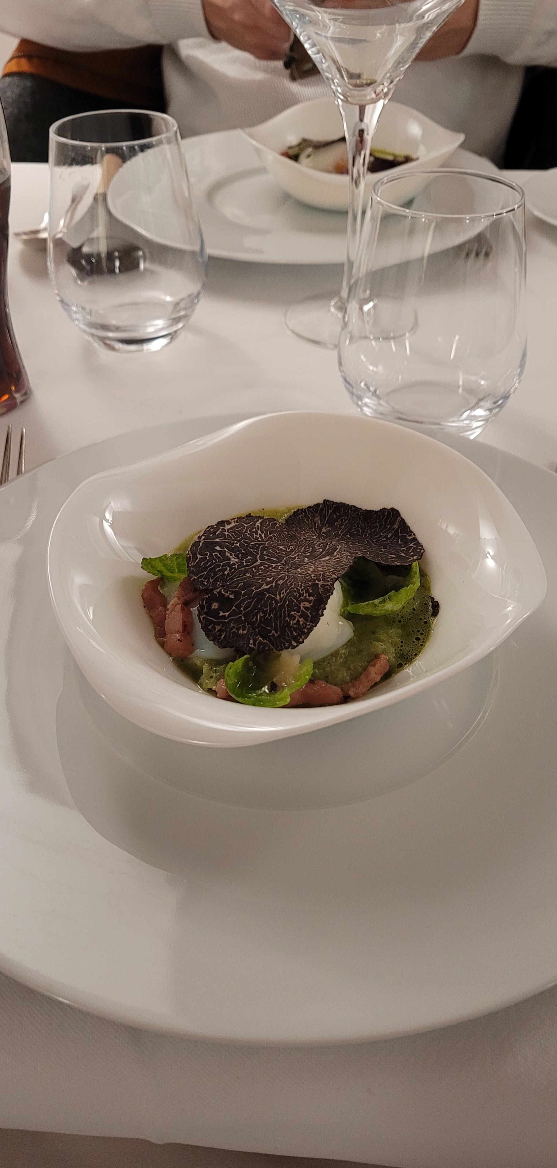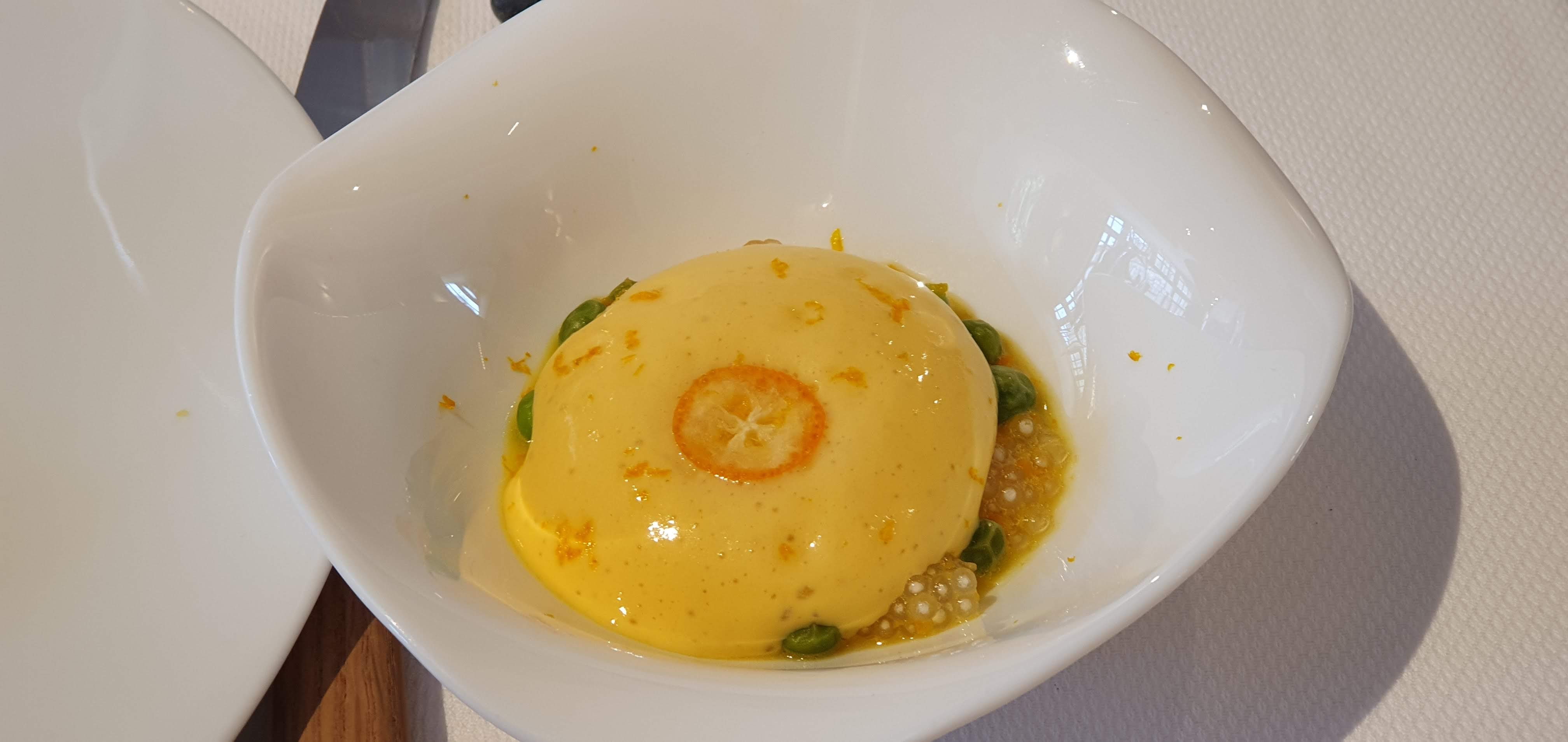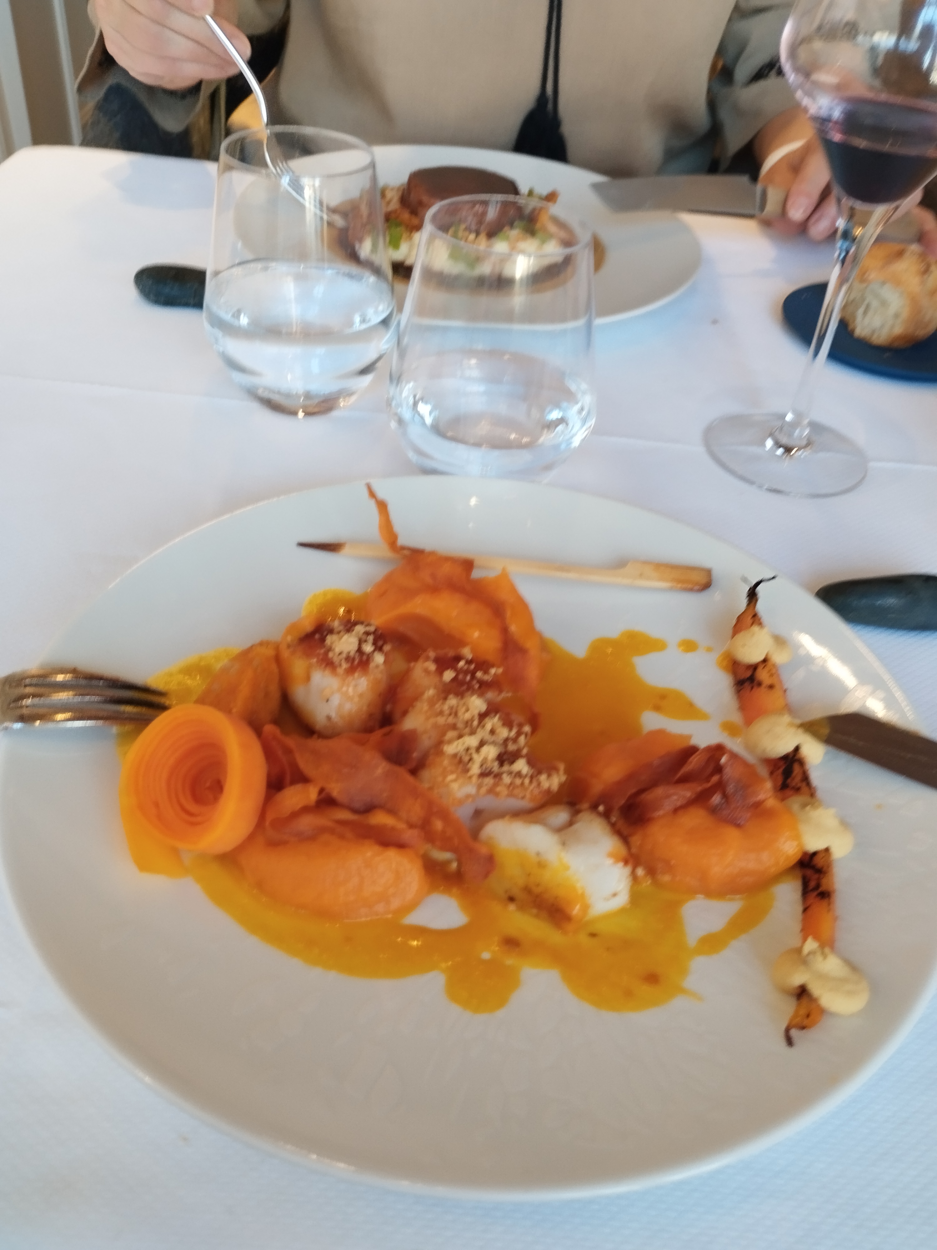 reçu dans un cadre très épuré, trop....menu ne correspond pas à celui affiché sur internet, cependant menu gastronomique, le trio de saint-jacques excellent quand au dessert trop lourd pour terminer un repas.