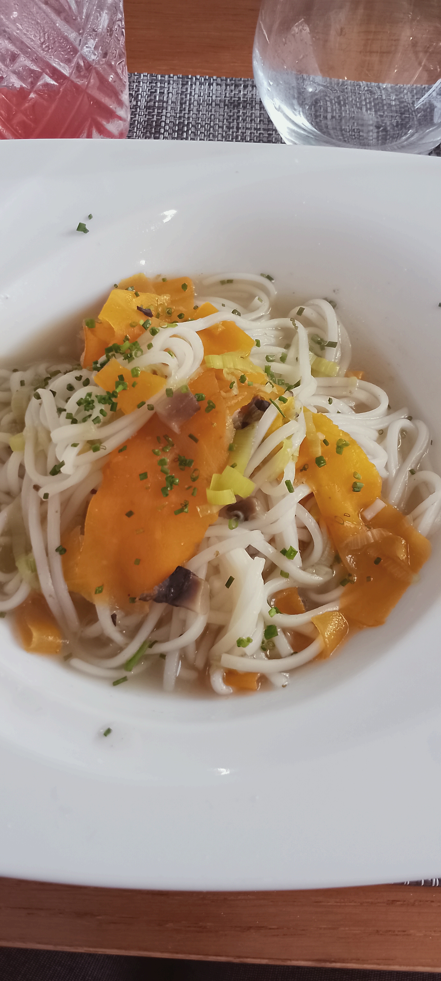 Repas le soir nous étions 3, du vrai maison, plat de tagliatelles fraîches au gambas ,une merveille, le dessert une pêche Melba avec de la glace et chantilly maison et des pêches de vignes, excellentissime et avec très peu de sucre, le vin au verre blanc et rosé en équation avec les plats, réservé en avance, Bonne suite et à bientôt.
