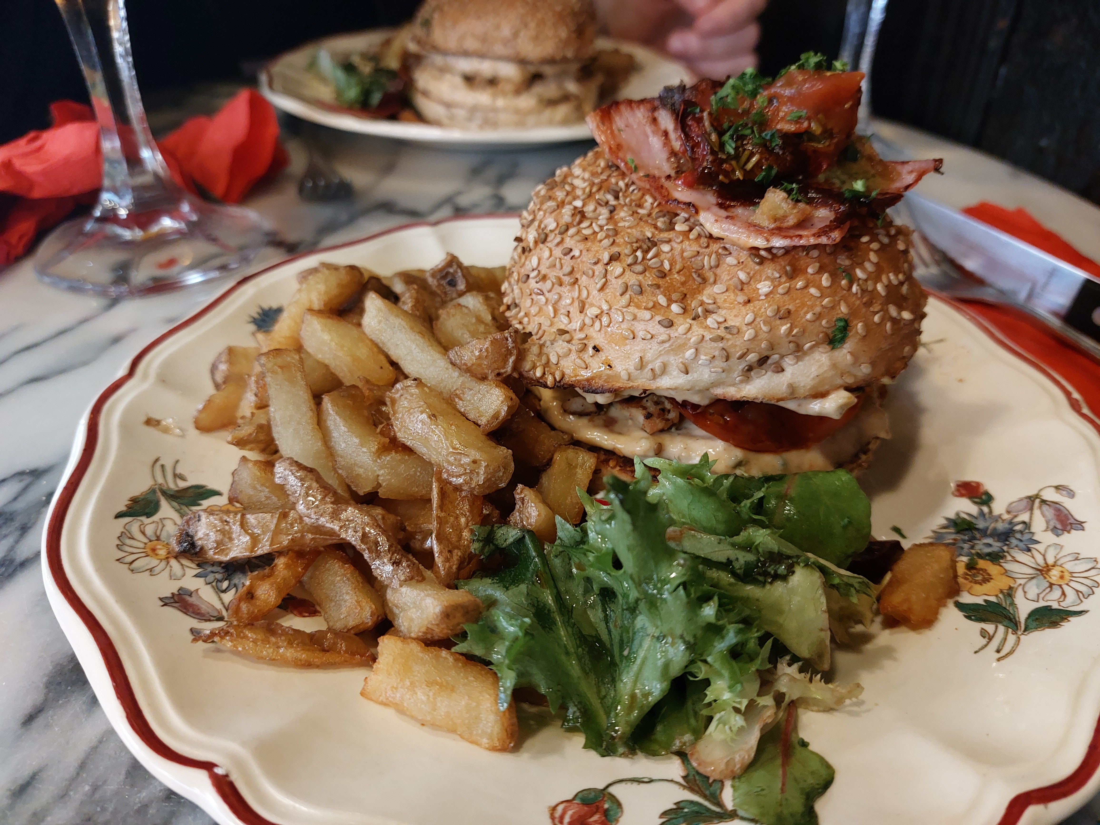 Première fois que nous goûtons un burger maison au porc (filet mignon et bacon + sauce délicieuse dedans dont j'ai malheureusement oublié le nom) et franchement quel régal! L'entrée de salade au fromage de burrata était excellente aussi !