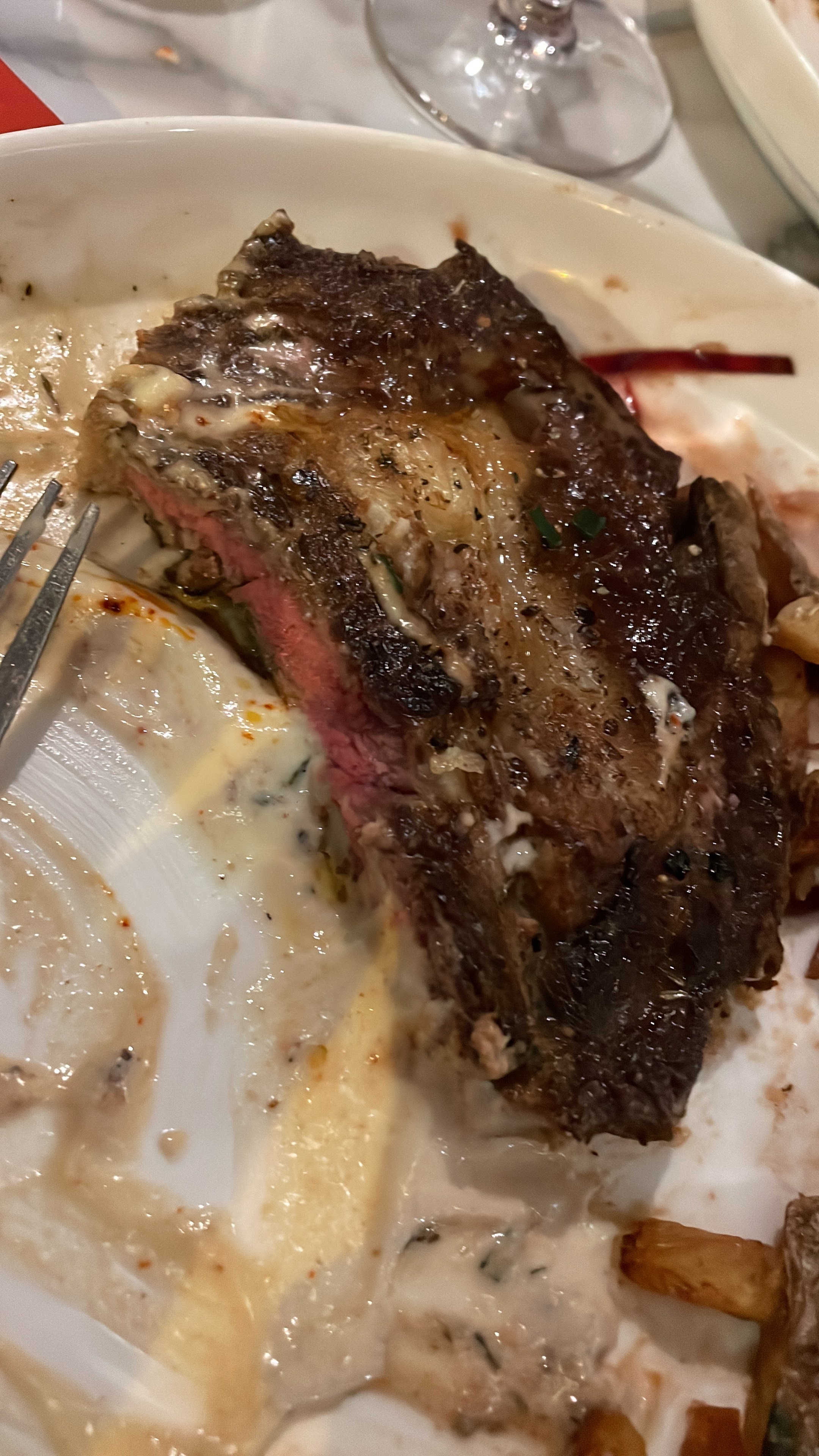 Entrecôte “bien cuit” pas vraiment bien cuit (voir photo), et trop trop gras ☹️ Le service était au top et on a aimé le pain perdu