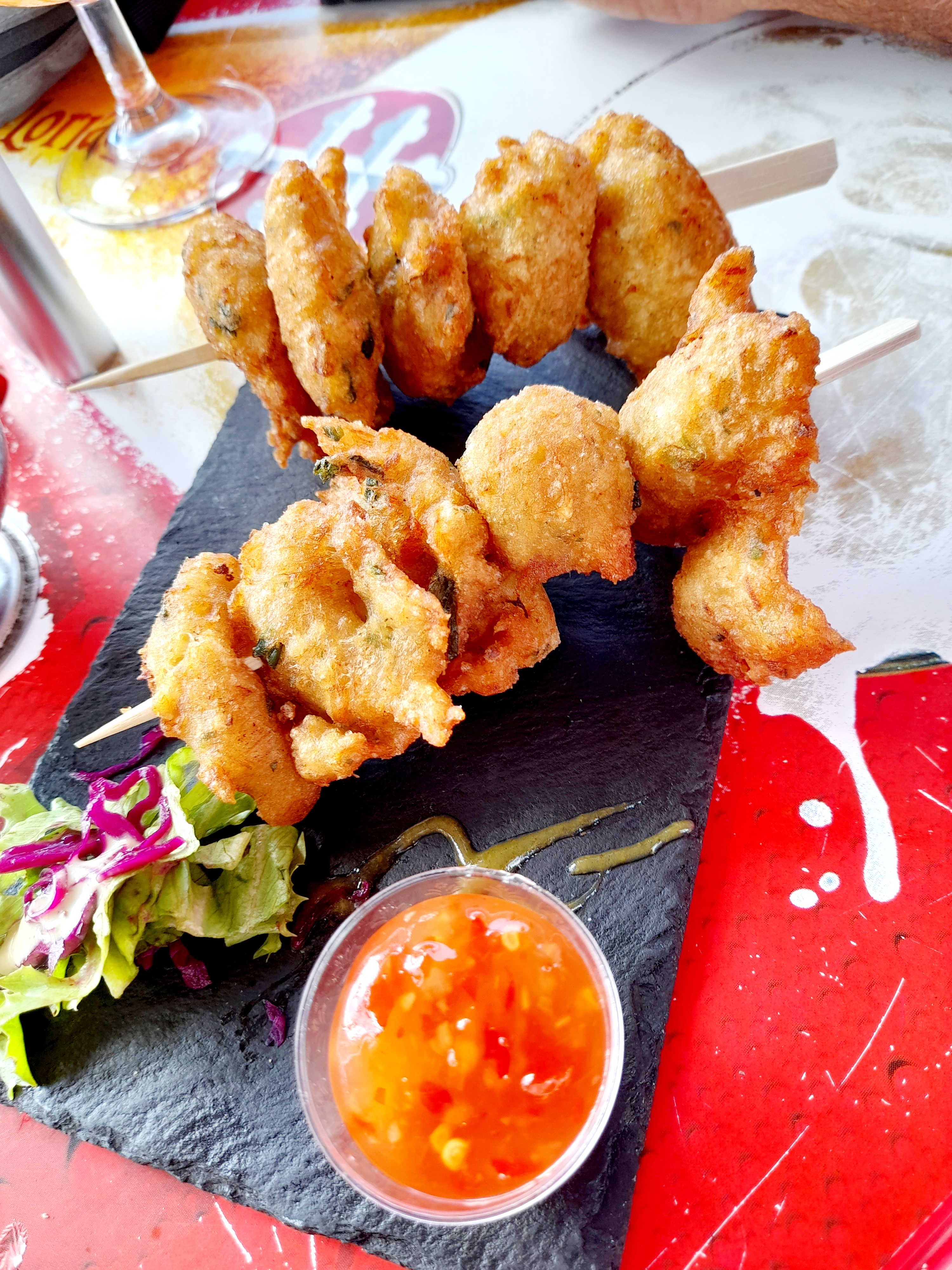 Repas de midi au pied levé (il était 14h) personnels un peut débordé mais service pas mauvais 20€ un menu à base d’acras (moyens) et de petits poissons frits bien bon endroit sympa avec son morceau de plage et cocotiers 🤩