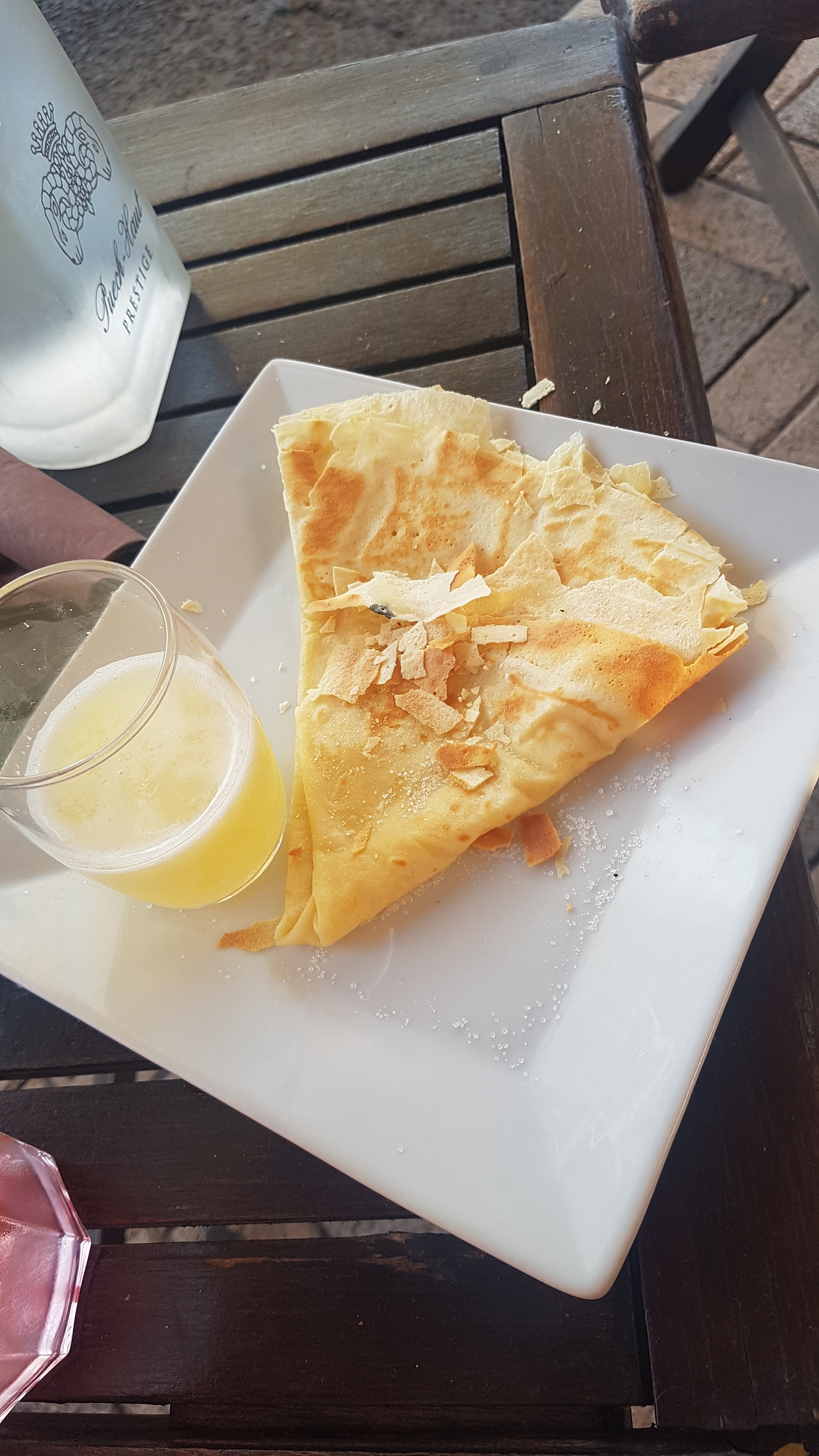 La terrasse est sympa, elle donne directement sur le grand canal de Sète, les chaises sont confortables, on s’est arrêté pour une crêpe et un « VRAI citron pressé », j’ai insisté pour cela. Ma crêpe Grand Marnier était sèche avec une vaporisation d’essence de Grand Marnier, et les citrons pour jus de Pulco ou similaire, la crêpe confiture de ma compagne était acceptable, mais les verres d’acide n’ont pas pu être absorbés. Pour moi , c’est une adresse où je ne mettrai plus les pieds. Il y’a bien d’autres endroits sympa sur Sète où consommer. Pour 23,50€ les deux crêpes et les deux tord boyaux.