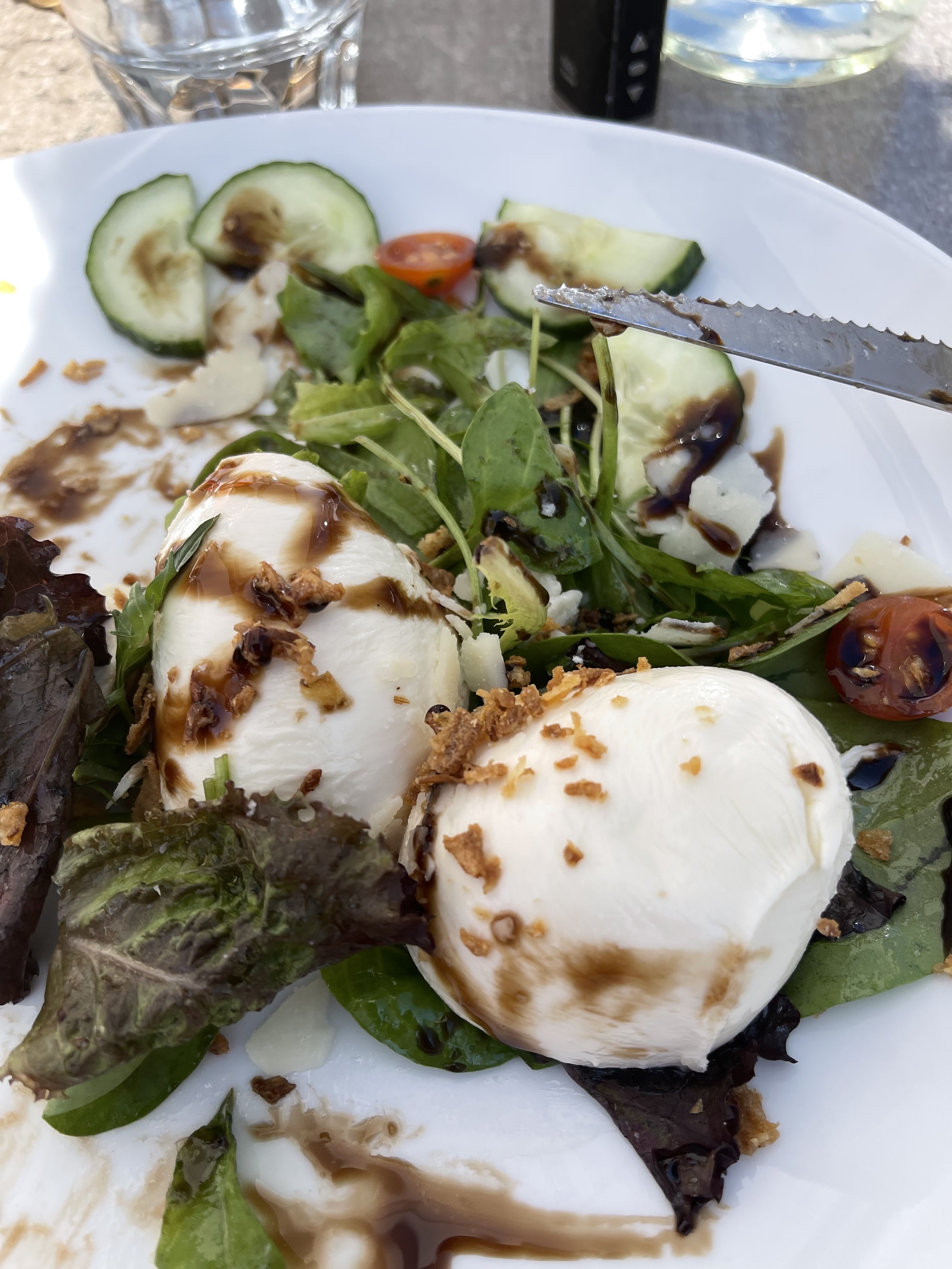 Passez votre chemin, c’est une catastrophe ! Salade mozzarella sans tomate mais avec des concombres rances, salade César avec des œufs cuits durs en boîte, verres d’une saleté répugnante…