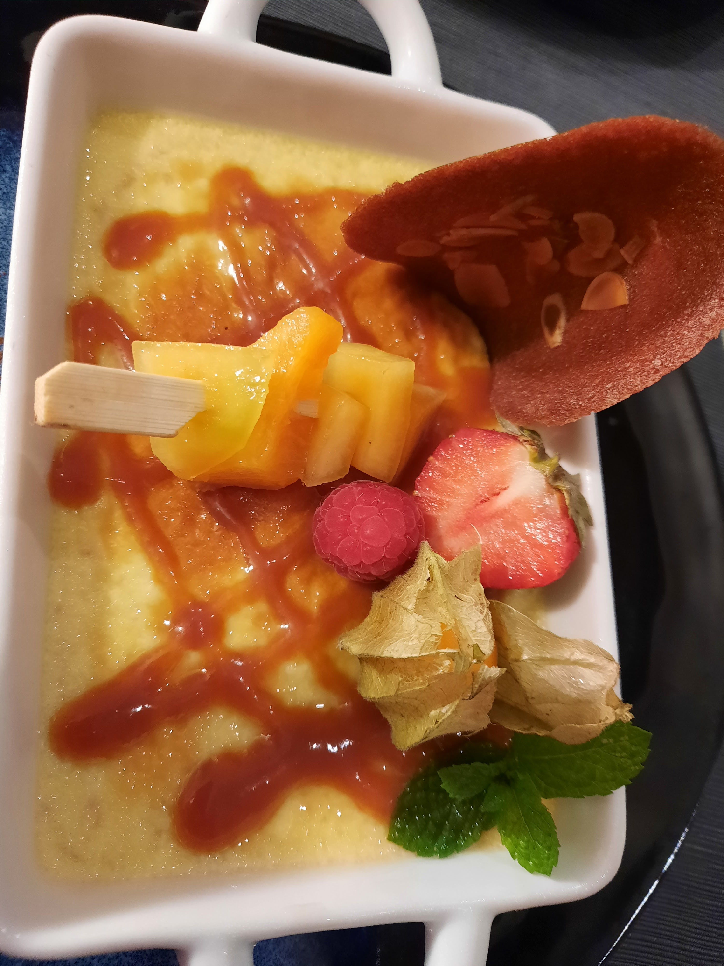 Un bon pavé de rumsteack un poil trop salé mais une superbe crème brûlée pour compenser ! Je recommande !
