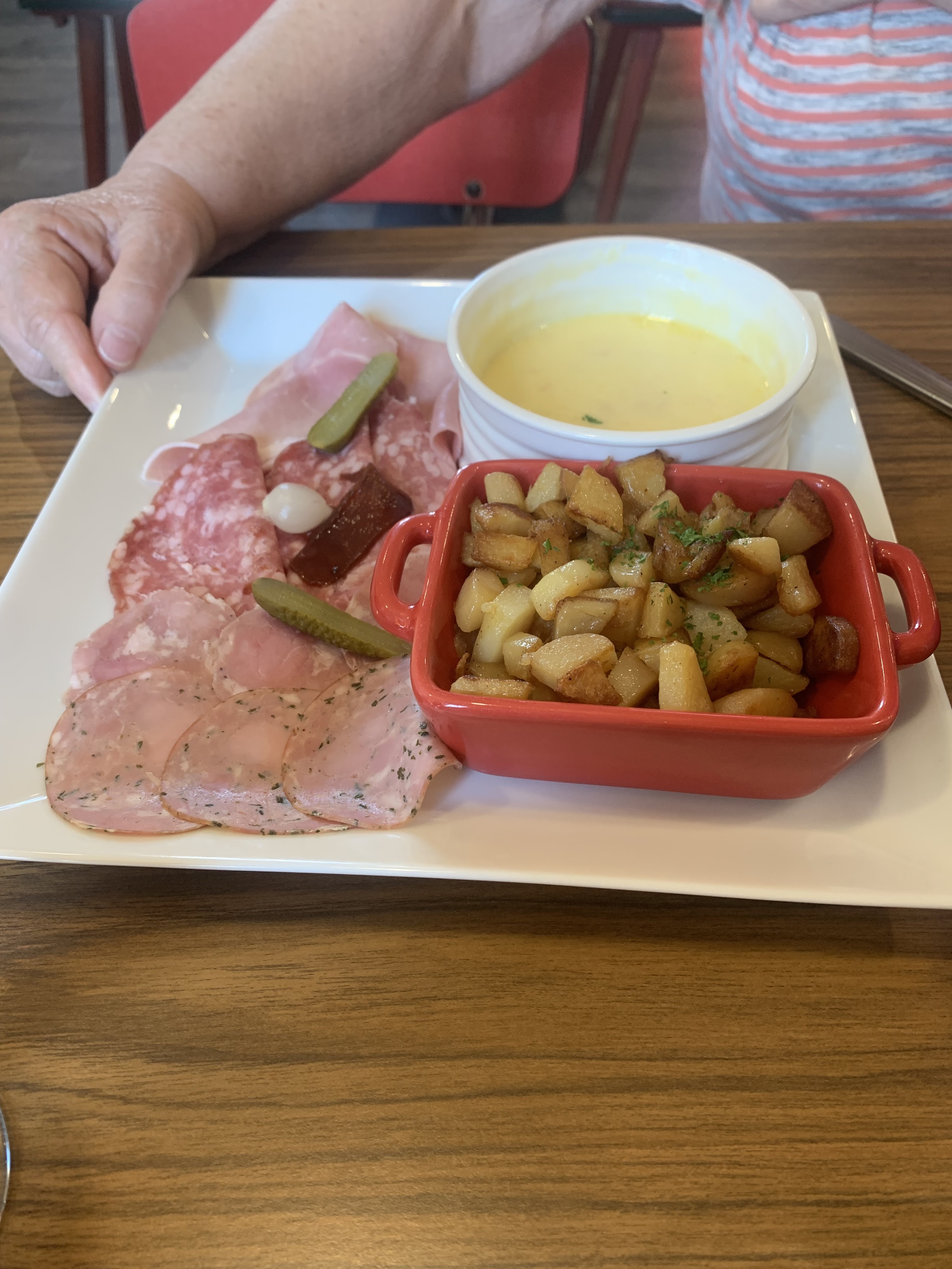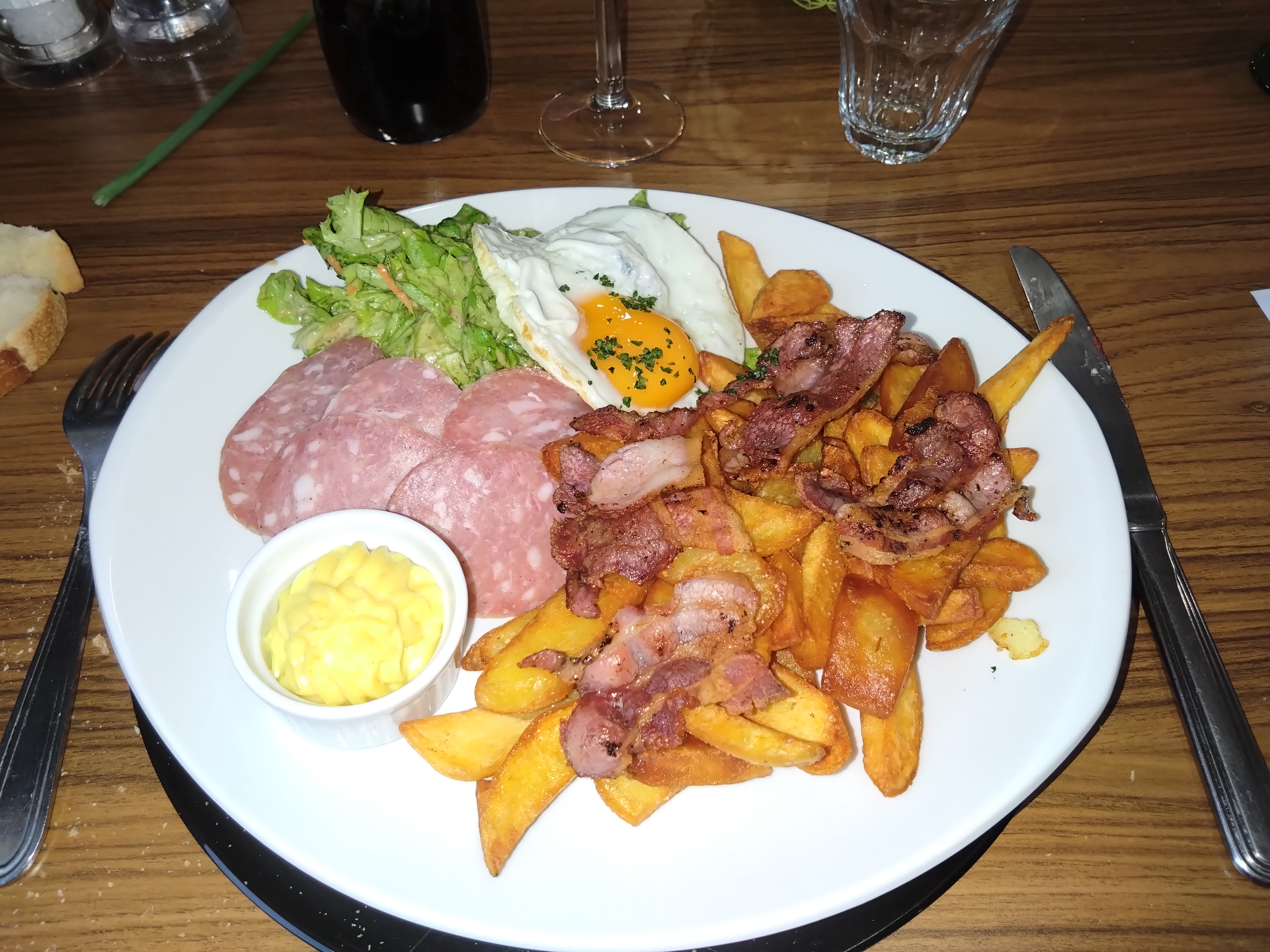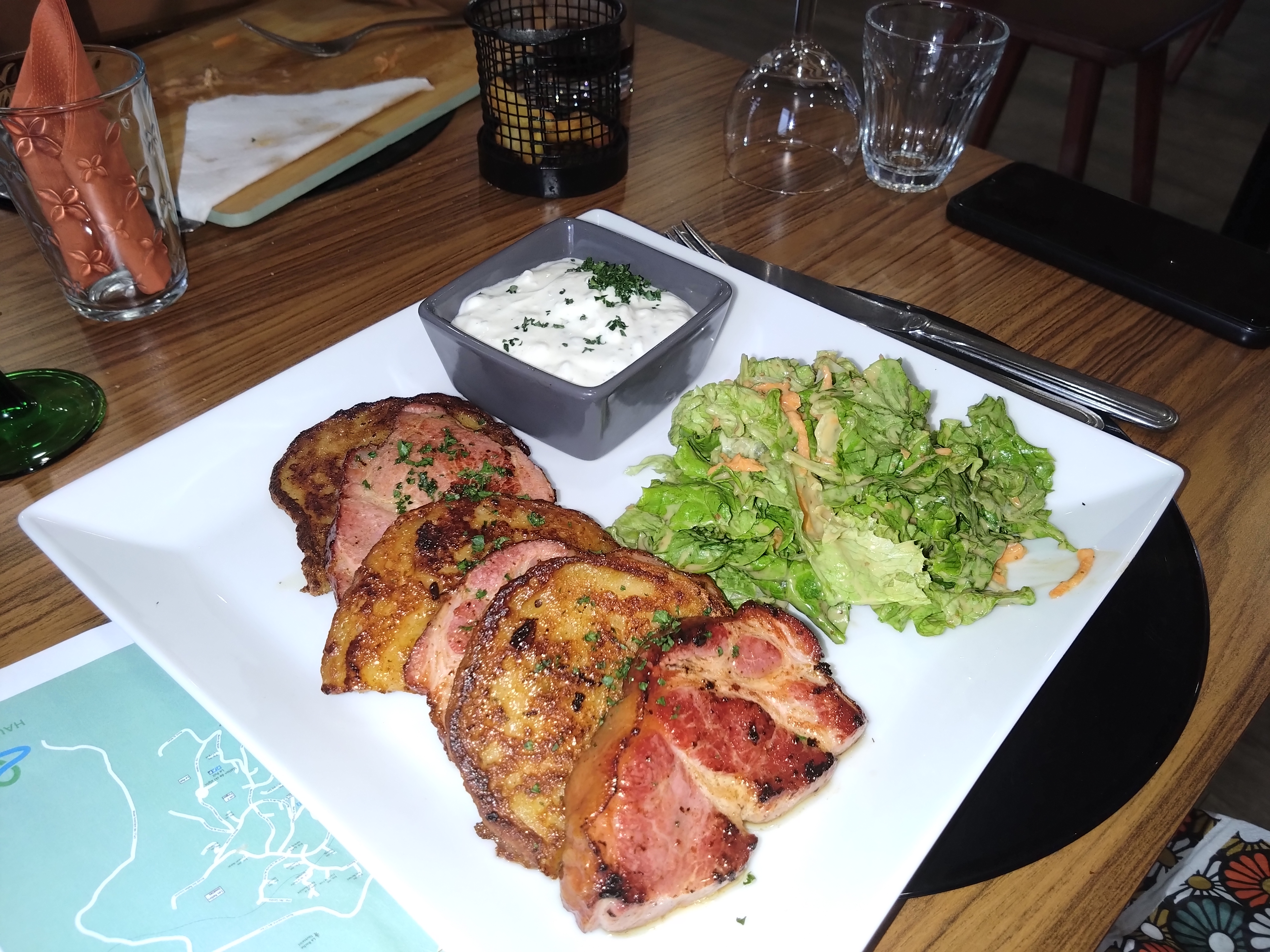 Nous y sommes aller a 4, le menu du jour a 14,90€ pour entrée, plat, dessert et café, plus que correct au niveau prix, repas bon, en entrée assiette de charcuterie, plusieurs rondelles 4 types de saucisson et une pointe de beurre. Une demande de salade a la place de charcuterie et accepté sans supplément, Plat 1 blanc de poulet coupé sur la longueur avec une petite sauce champignons et un peu sucré, et une poignée de frites, dessert une glace ou autre et une demande de fromage a la place d'un dessert accepté sans supplément et café. 2 cruches de pinot noir 50 cl et apéro pour un total de 114€ a 4. Tarif au top. Point a amélioré : nous avons reçu l'entrée avant l'arrivée de notre apéritif, quantité de frite un peu légère, sauce un peu juste mais en avons demande en plus et on nous en a gentiment ramené. Dans l'ensemble repas du midi bien, service correcte, Patricia toujours au top. J'y retournerai dans quelques temps pour voir l'évolution. Je n'ai pas fait de photo ayant oublier mon téléphone.
