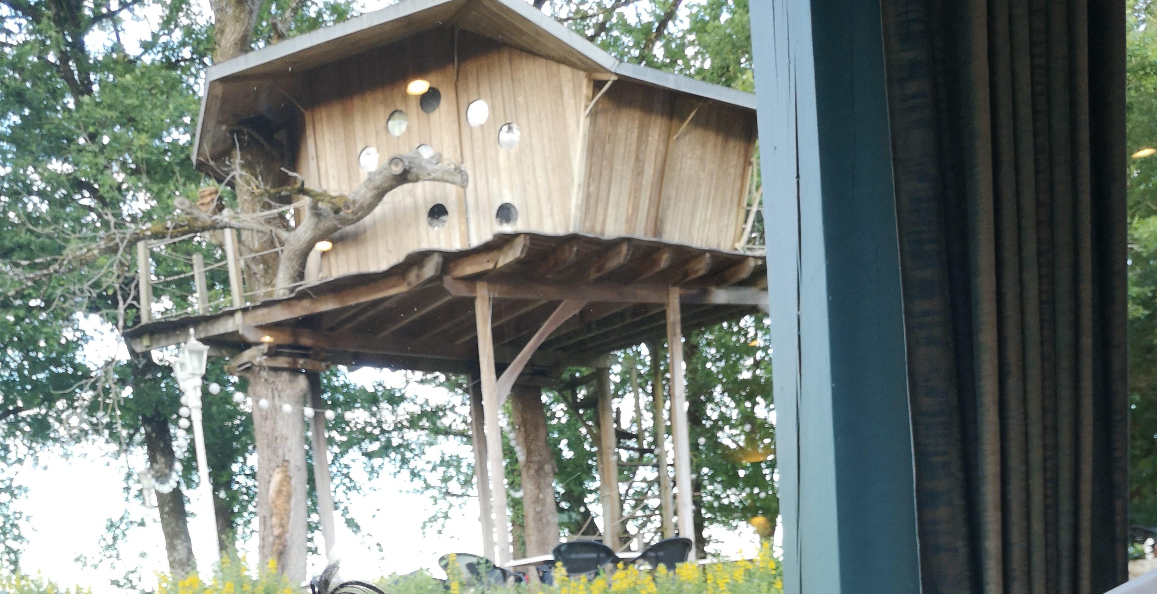 Belle cabane originale. Domage qu elle soit située au dessus de la terrasse. Vu la météo, il n y avait pas de monde en terrasse, mais si le temps avait été meilleur, il n aurait pas été agréable d avoir du monde en dessous qui, certainement nous observerait. Nous pensions que la cabane était plus tôt situé dans un bois.