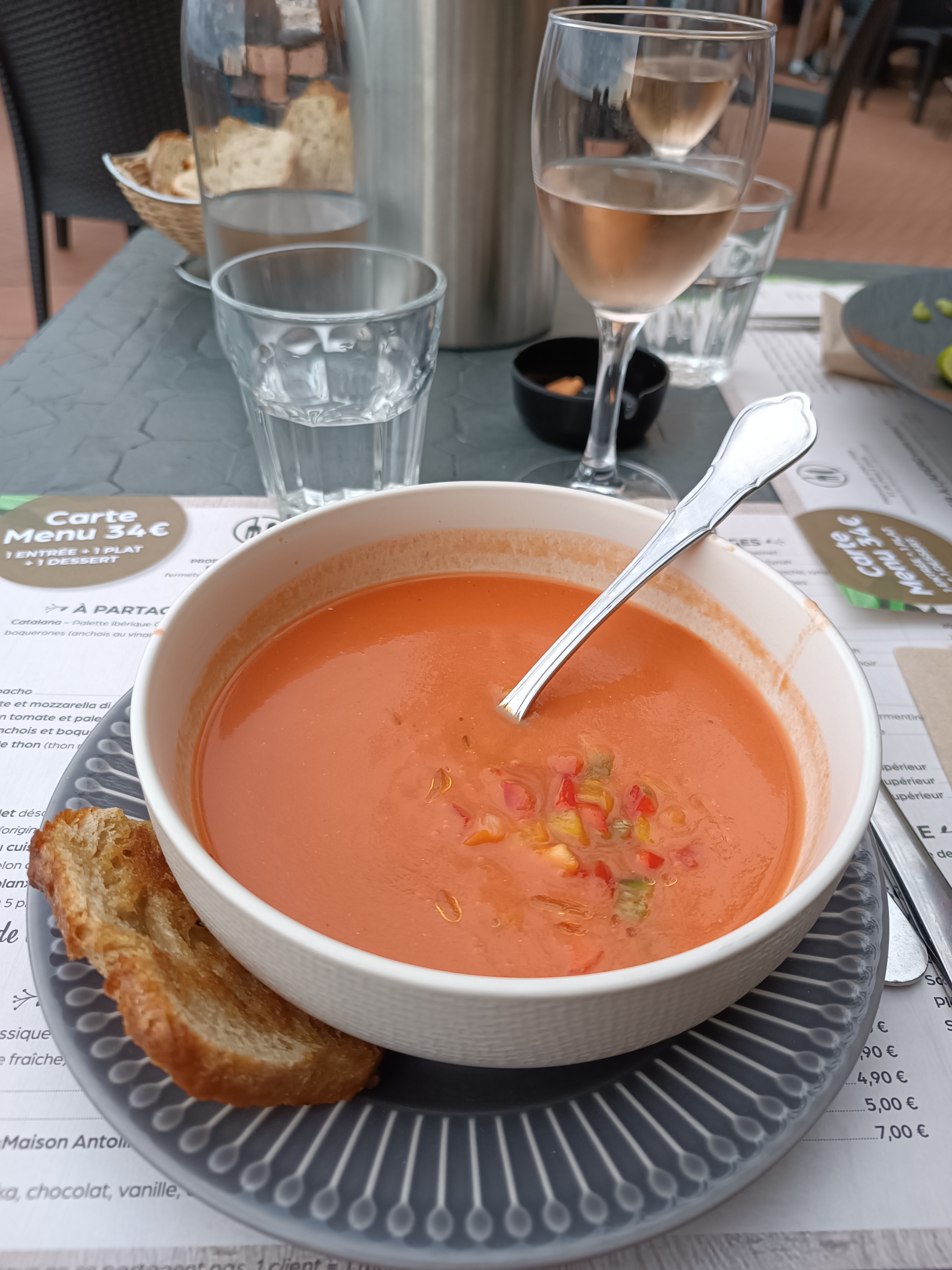 Le restaurant se situe dans un cadre très sympathique au milieu des petites ruelles des remparts d'Elne. La terrasse est ombragée par un couvert végétal ce qui est très agréable. Le personnel est à l'écoute et tous les plats sont faits maison. J'ai adoré le gaspacho en entrée, vraiment très bon. Le quasi de veau était également très bon, bien qu'un peu sec à mon goût.