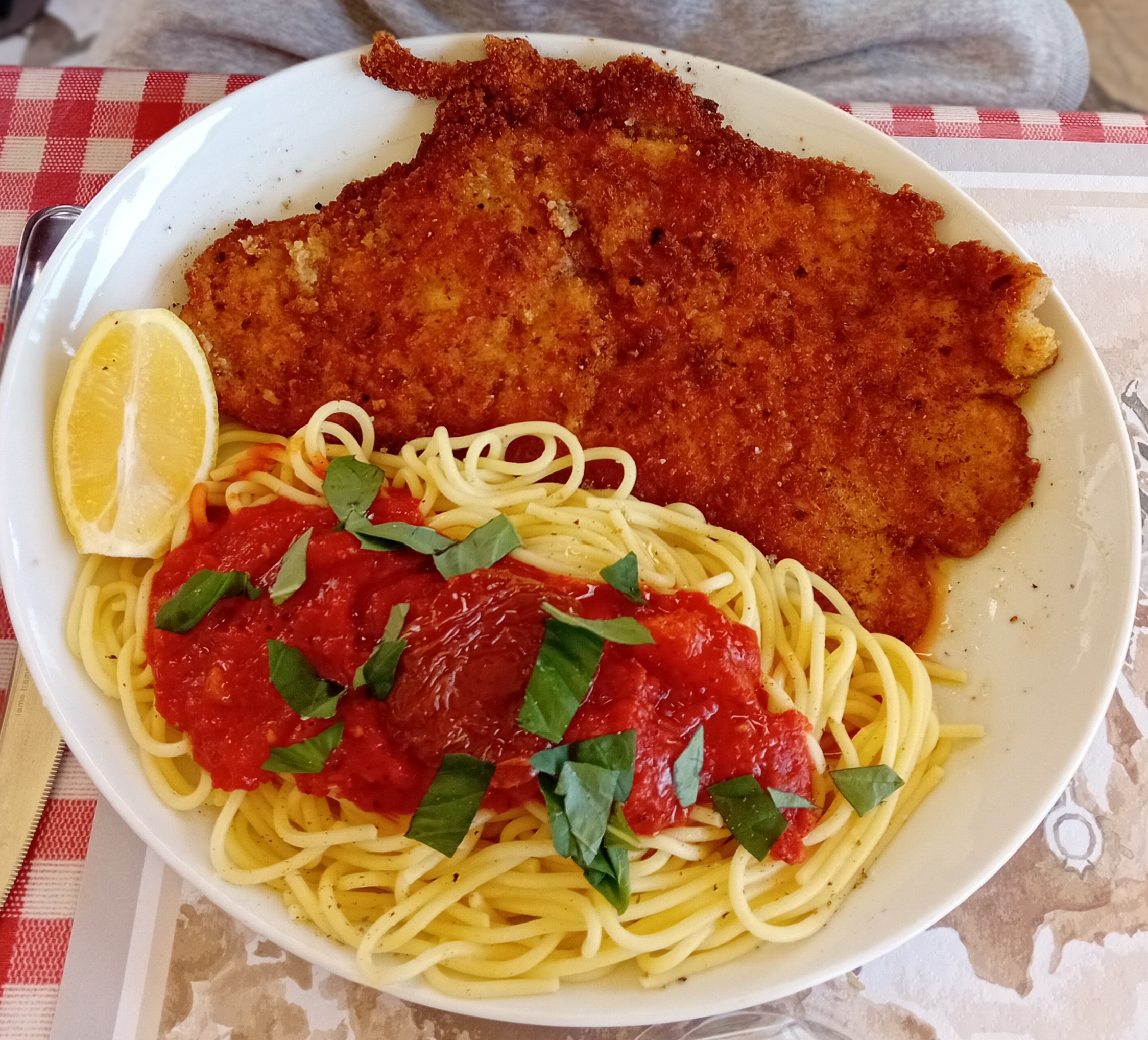 Assiette de saumon sur toasts à partager délicieux, escalope milanais avec sont accompagnement de pâte et sauce tomate maison excellente! Un dessert au au top, personnellement souriant et très professionnel, je recommande à 100% ( et le rosé servi dans des verres réfrigérer ) 👍