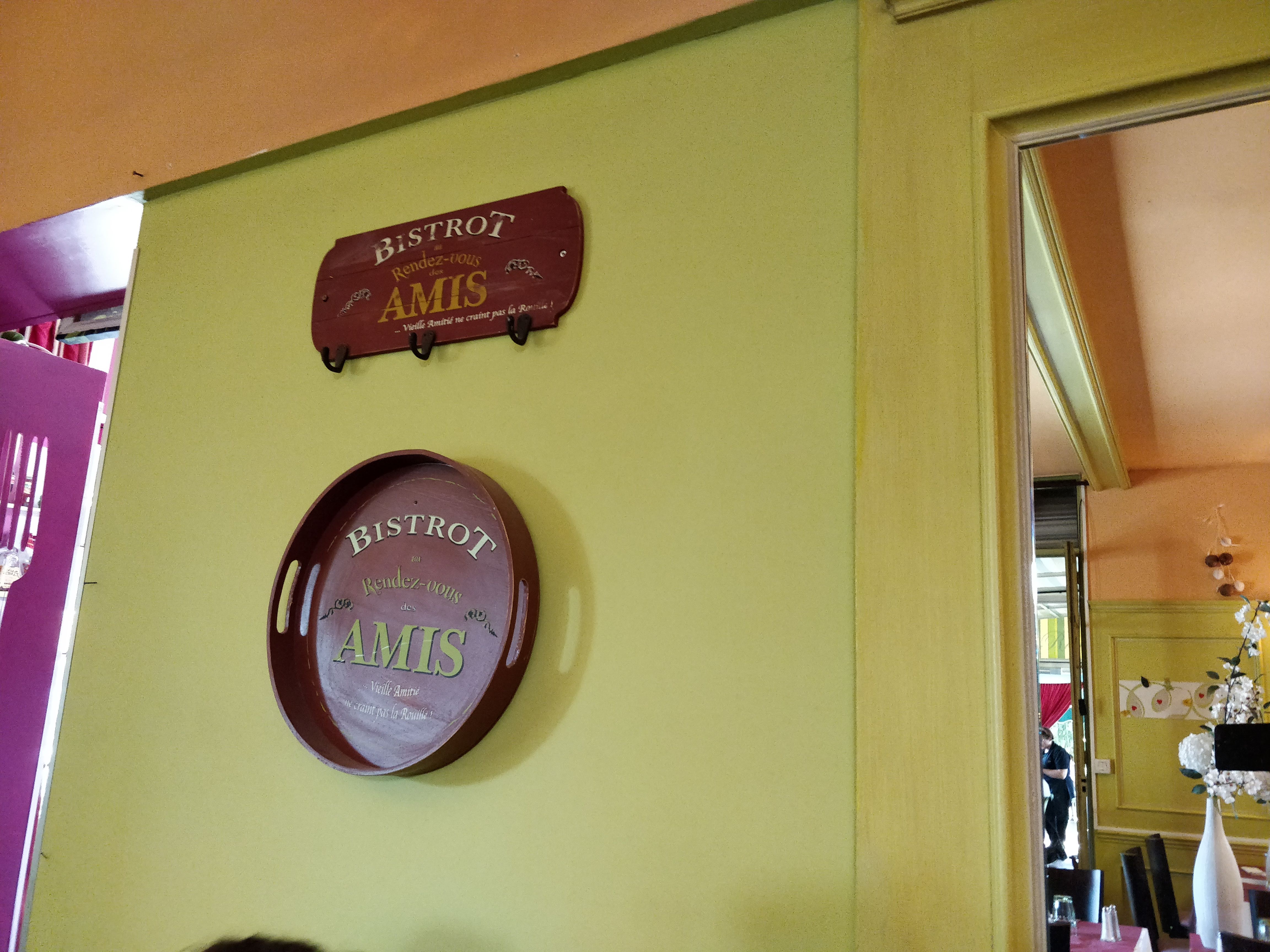 Au rendez-vous des amis est un restaurant gastronomique avec un tarif exceptionnel ! Nous l'avons beaucoup apprécié mon amie et moi. Et ce n'est pas un hasard si aujourd'hui il y a 2 baptêmes prévus pour la journée. D'ailleurs, nous participons au 1er (petit) baptême (malgré nous), rien de grave, au contraire c'est pour la bonne cause et c'est bon signe, ce restaurant est populaire pour sa sa qualité ! En pré-entrée, une petite coupelle d'olives pour patienter... J'ai adoré mon entrée : l'originalité et l'audace de la terrine d'artichauts accompagnée de sa salade aux parfums parfaits (huile de noix, pignons de pins, etc) et de sa tapenade tomate fûrent excellents... En plat principal, mon amie a choisie le Canard. Sa cuisson était juste parfaite, tendre et sa viande bien rosée. Un délice ! Simple mais efficace avec leur pommes de terre et sauté de champignons de Paris... Avec ma poêlée de légumes (artichauts, courgettes et gros haricots verts) pour mon civet de sanglier au vin rouge... c'était pourtant pas encore Noël, un régal ! Certes, j'ai trouvé les portions pour un appétit normal un peu juste, pour les affamés, prévoir un 2ème tour. Les desserts : un gâteaux au chocolat sublime, entre le gâteau, le fondant et la mousse accompagné d'une crème de bananes (ou glace de parfum à votre guise) fait maison et pralin, comment dire... une tuerie ! La mousse mascarpone de marrons comme autre dessert m'a beaucoup séduit aussi par son originalité. Au final, le service est rapide et le personnel très bien organisé, agréable, avec le sourire et la bonne humeur. Bravo ! Continuez comme ça !