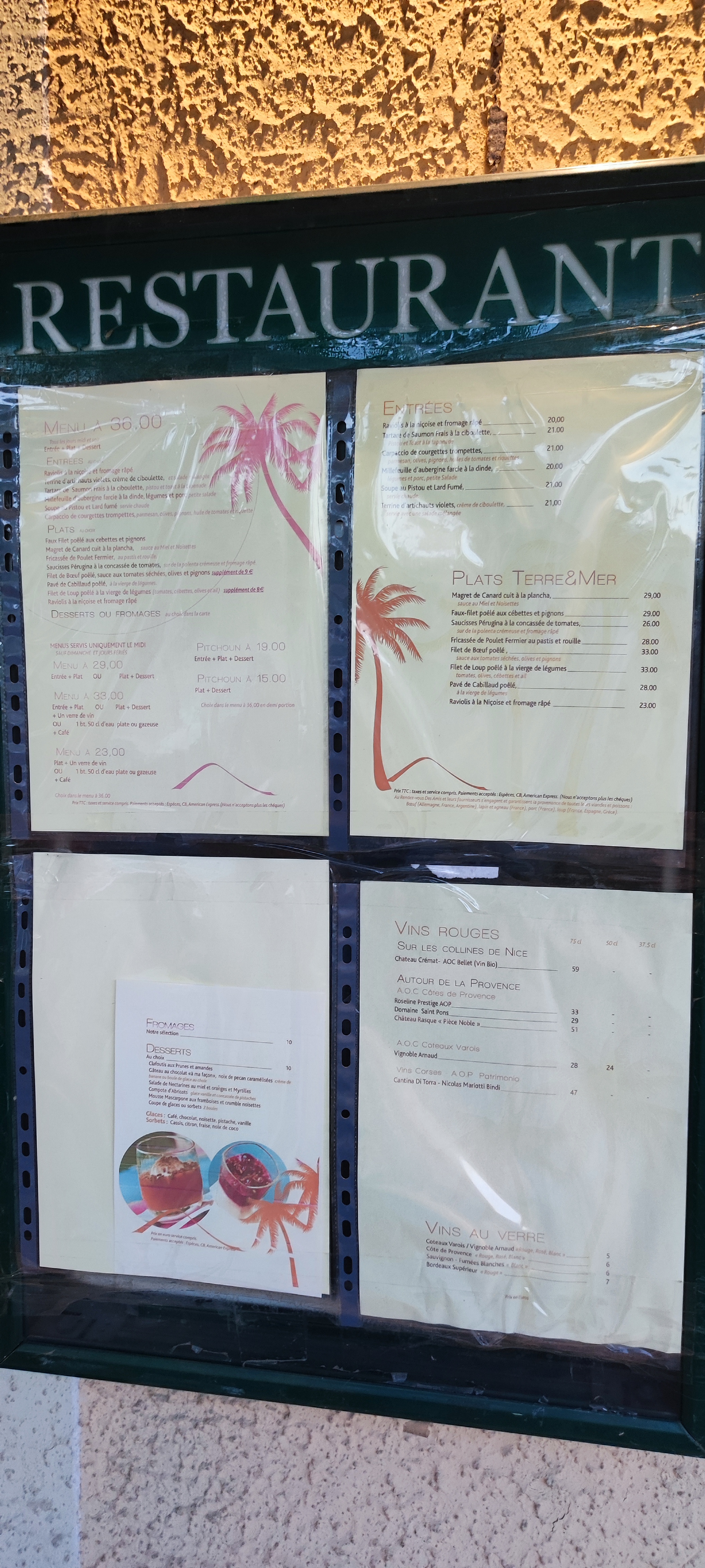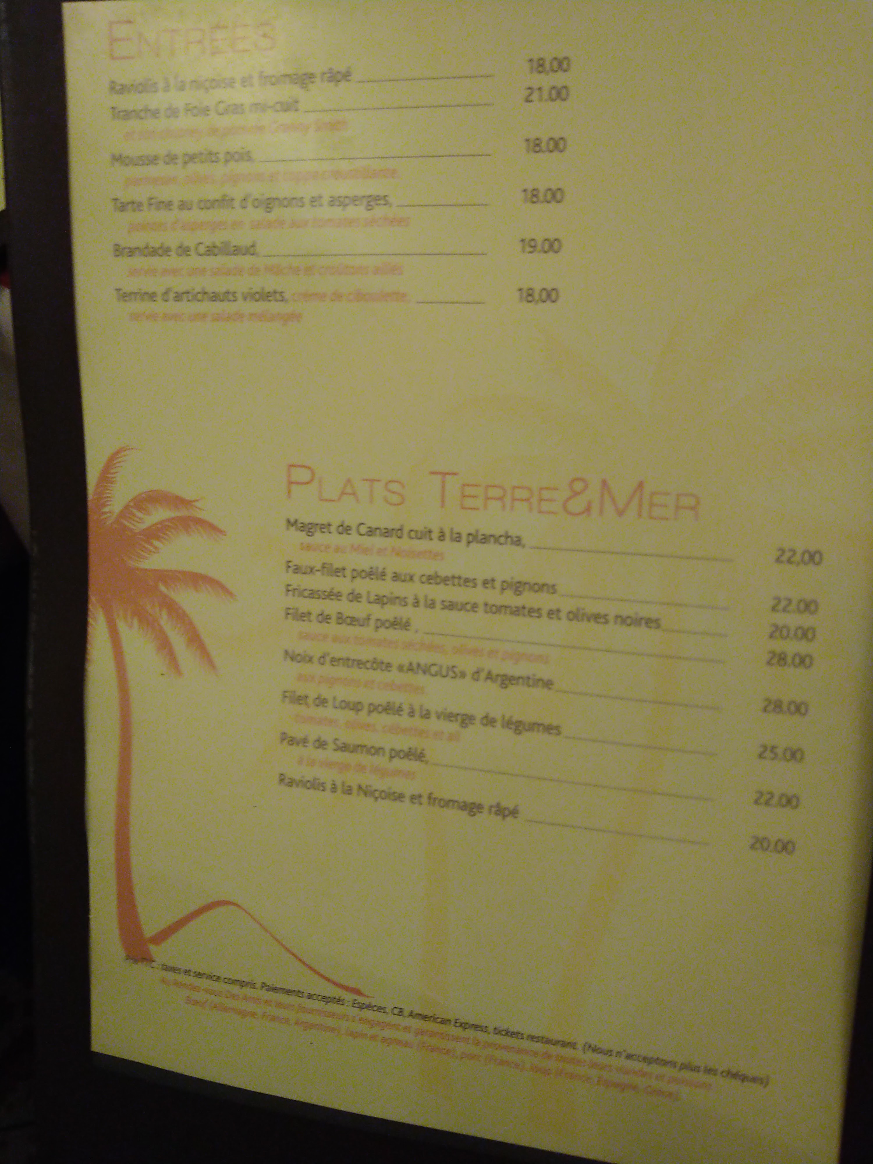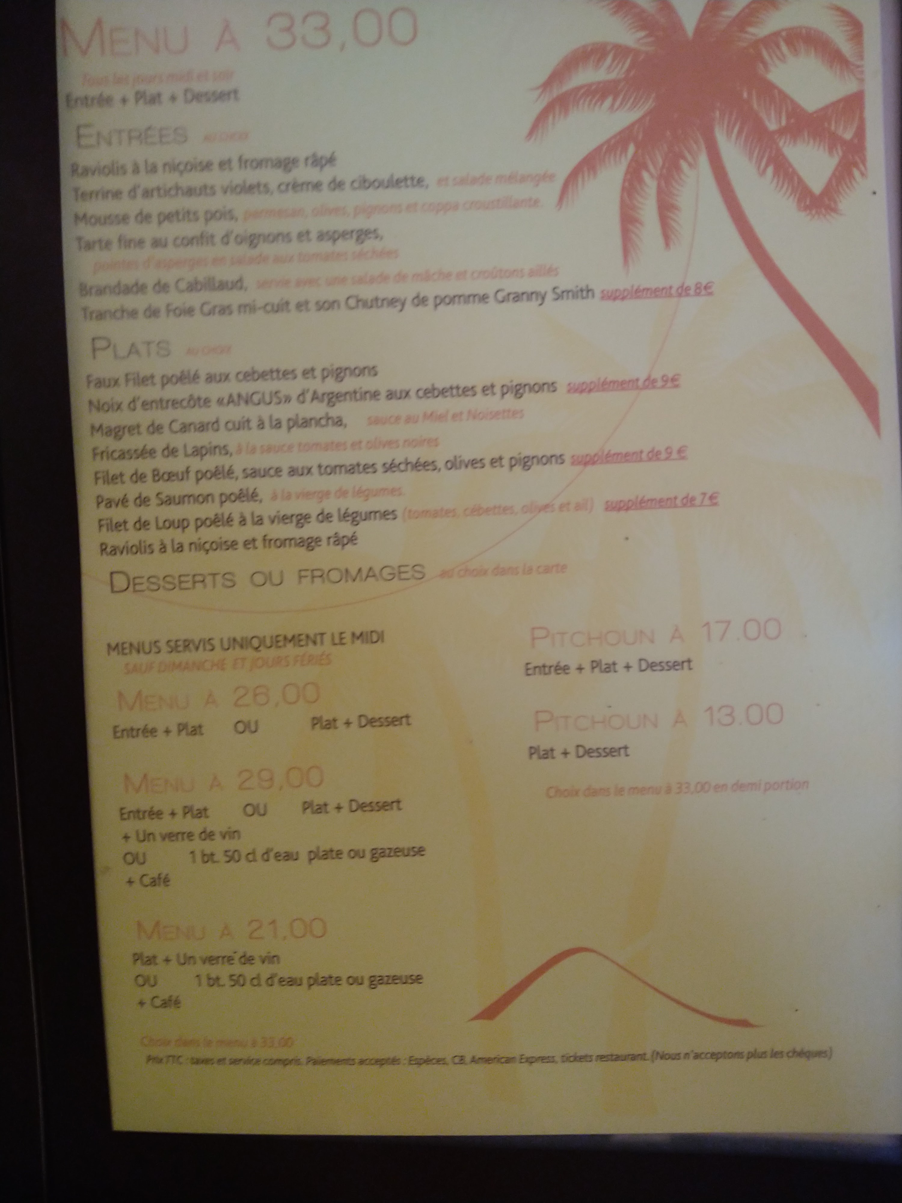 Carte typique nicoise, plats bons et copieux, cadre très agréable, et personnel au top