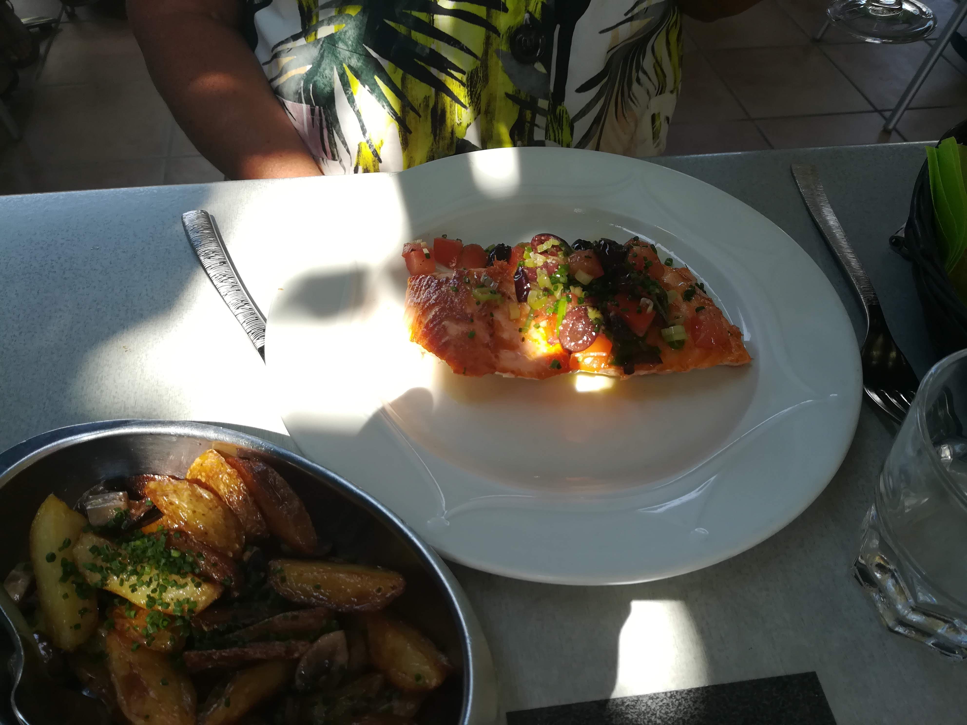 Différents plats très bons et appréciés par plusieurs personnes Personnel très professionnel et sympathique Terrasse très agréable en cette saison loin du bruit de la ville 🙂