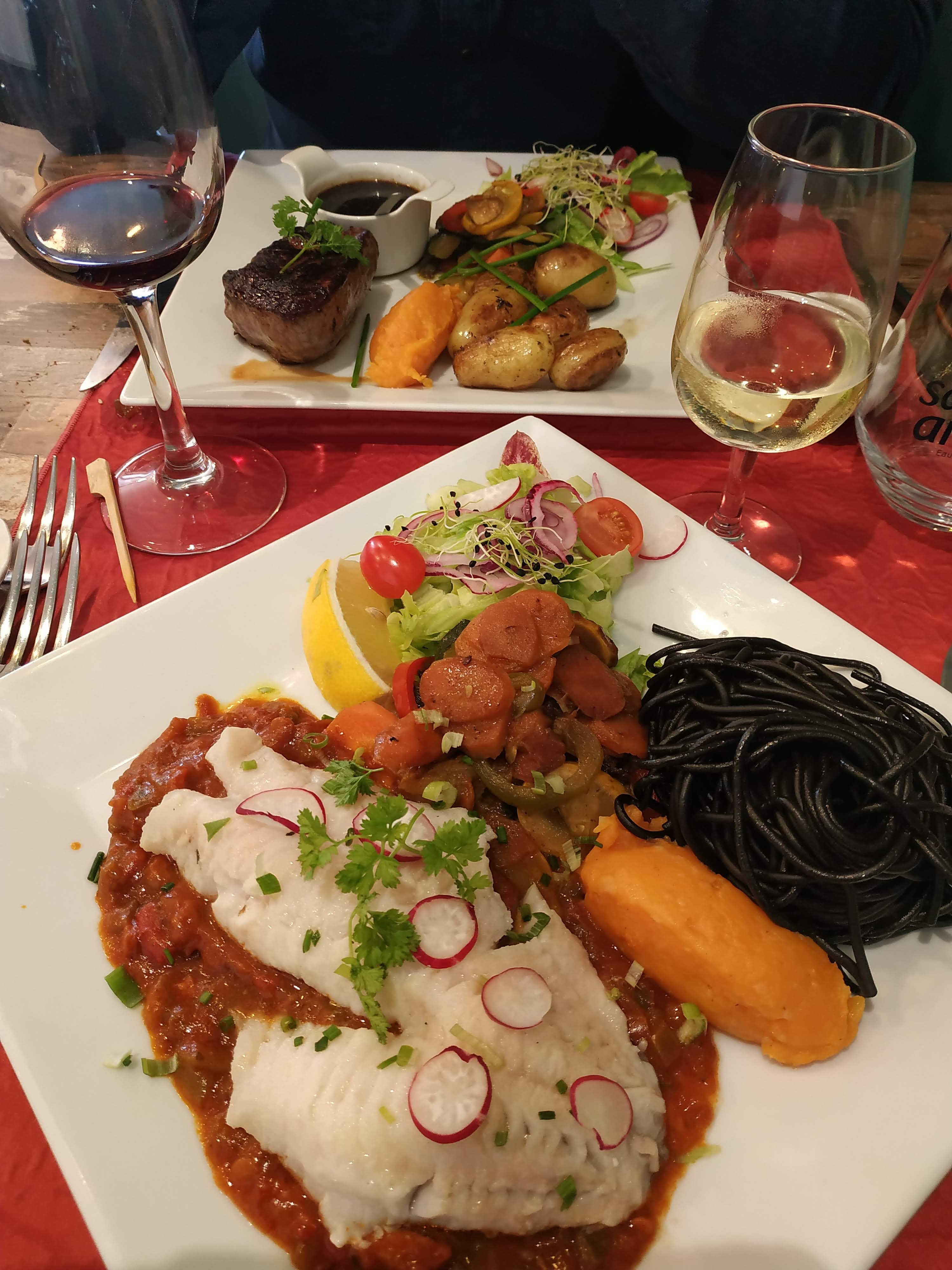 Waouh copieux, très bon, très jolis plats, des gâteaux apéritifs et une mini entrée dégustation offerte et très bonne, sympathique, très bon vin, joli lieu, waouh ! 👍👍👍 On a pris du poisson magnifiquement (si si c'était très bon) préparé et cuisiné 🐟❤️