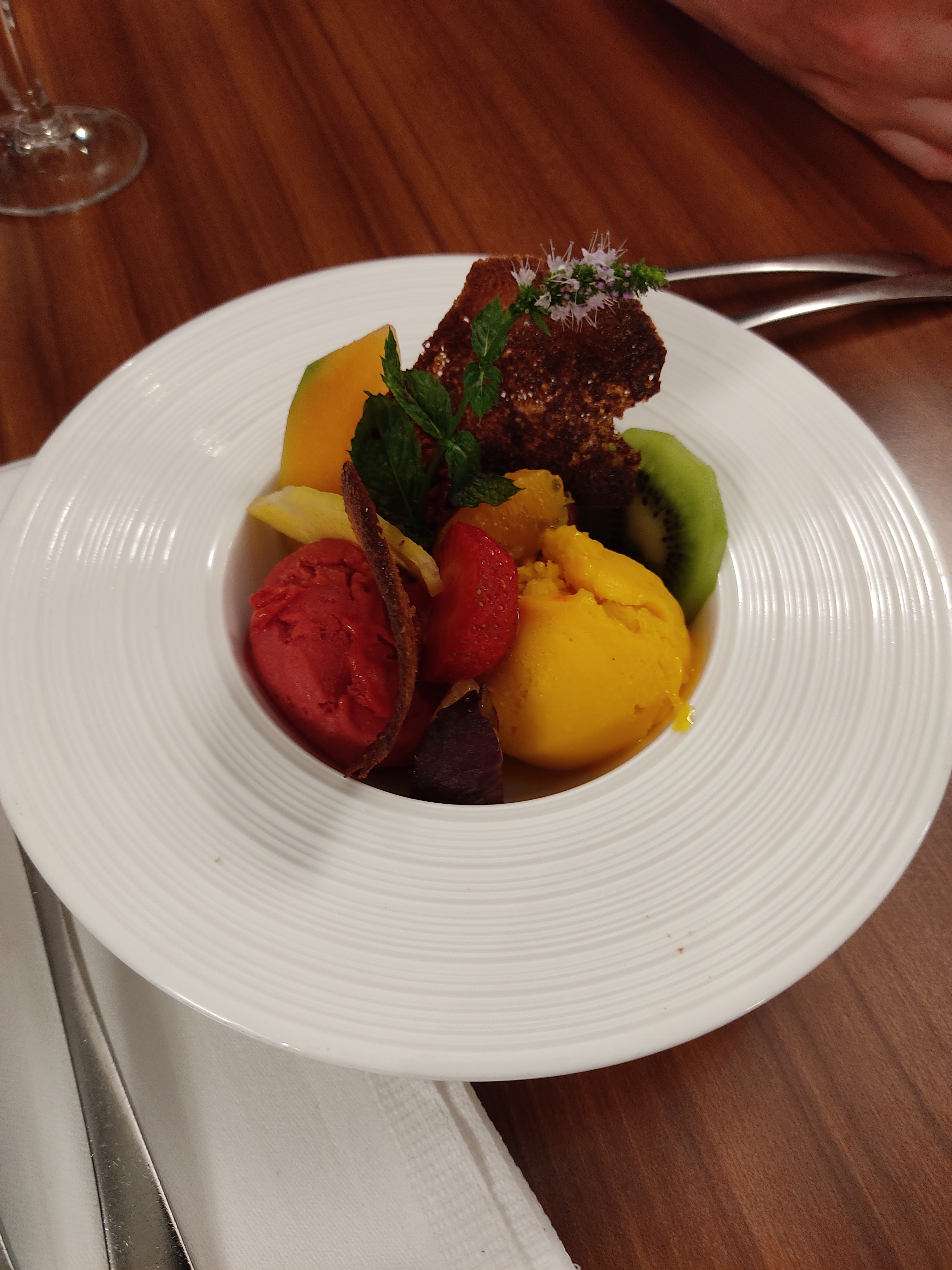Un peu décevant compte tenu du prix (mon compagnon a pris un menu terroir 28€ et moi à la carte). dans le menu: Plat poisson assez simple, peu de travail sur l'accompagnement et dessert fruit rouge glacé chocolat est en fait une boule de glace fruit rouge avec chocolat fondu et chantilly.. pour ma part la lotte était plutôt bonne et le dessert «fraise facon tiramisu à 9€50» était en fait une simple tarte au fraise sur un palet breton avec chantilly.. bref assez bon mais décevant pour le prix..
