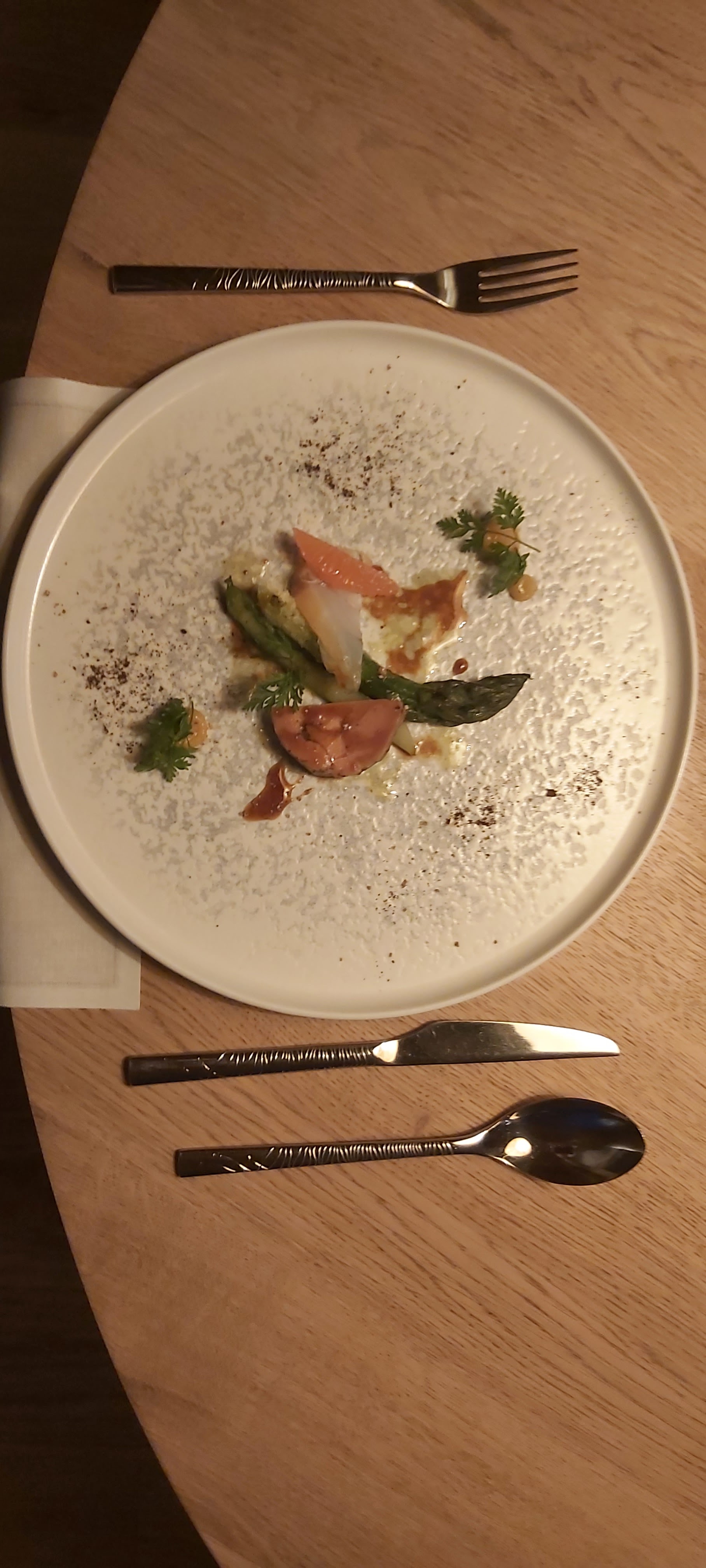 Tout est bien, original, surprenant, enfin de la cuisine. Le service est efficace, discret tout en étant convivial. La seule gêne est due à cette réglementation d'exception qui impose un étouffoir dans les déplacements. Mais bon l'étouffoir ne fait rien foirer.