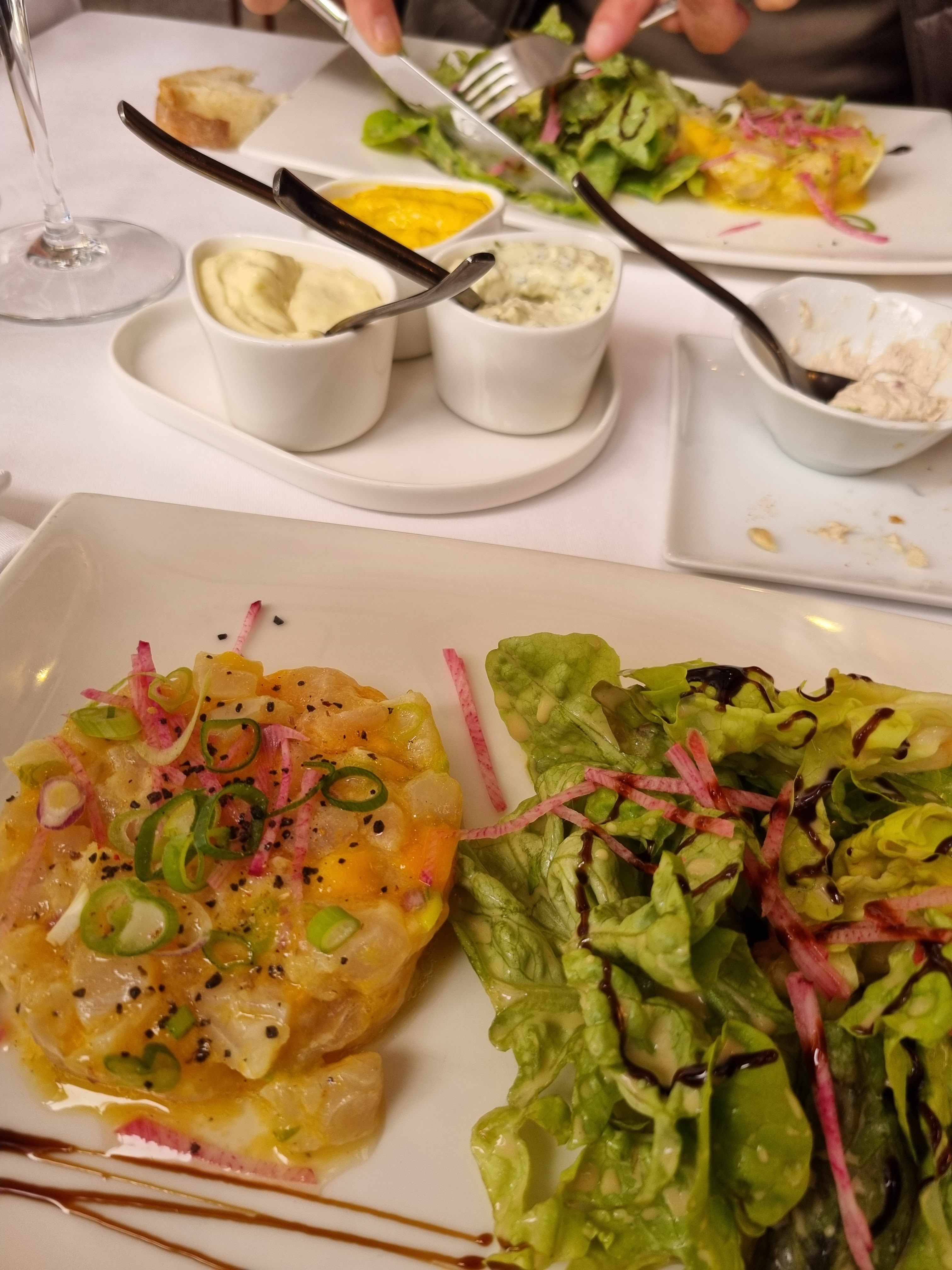 Un plat tartare poisson ...très bon...une friture réchauffée....dommage.. service très agréable...et vin inabordable...donc...à éviter...