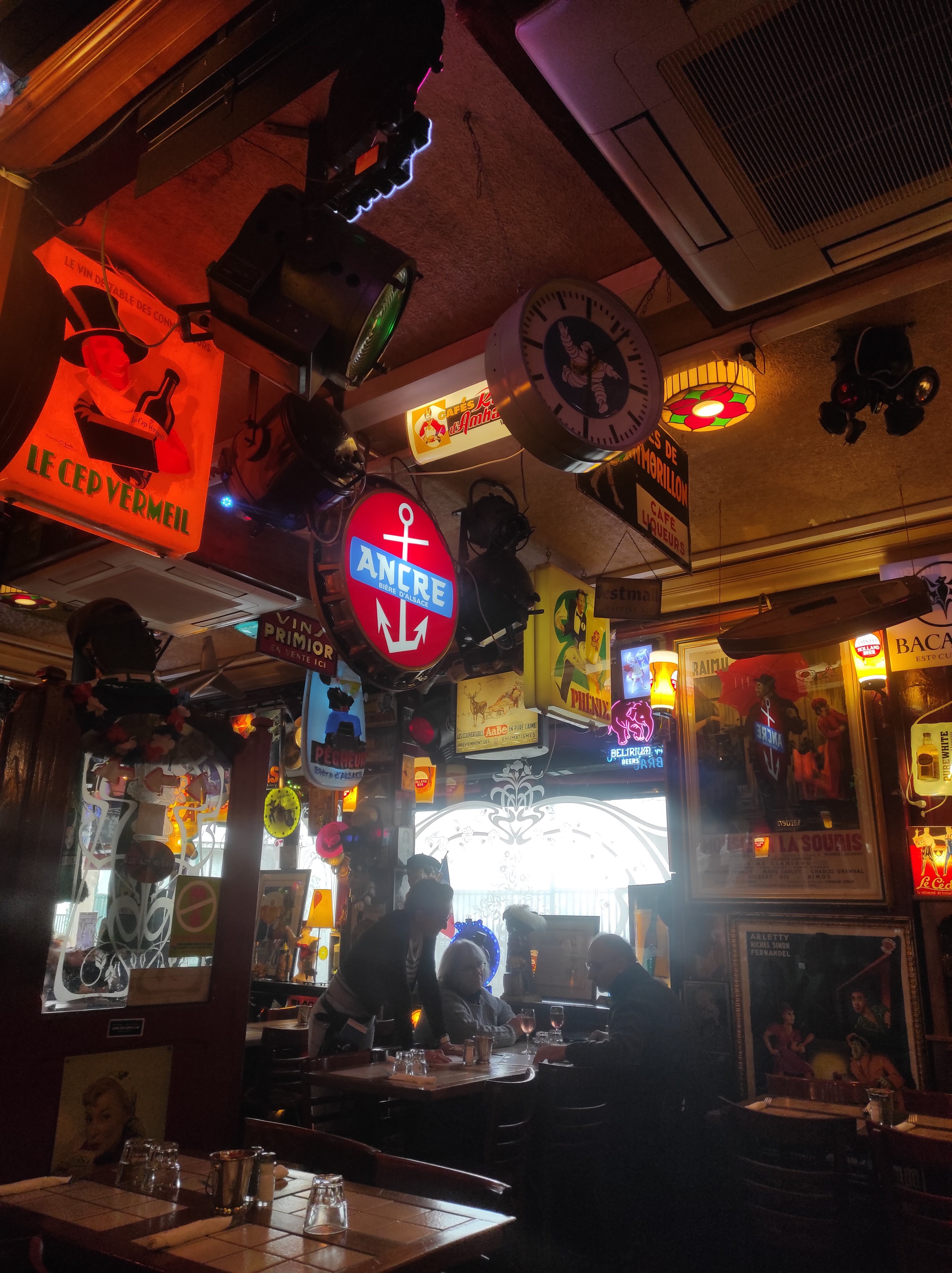 Endroit dans son jus comme on les aime (sinon vous pouvez aller ailleurs). Produits simples, vraiment bons : pavés de bœuf saignant super tendre. Patates frites, vin rouge au pichet, mousse au chocolat en dessert. La totale. Service dynamique et efficace. Lieu bien fun en termes de Deco bric à brac chargée. J’aime bien ++ Tarif très correcte.