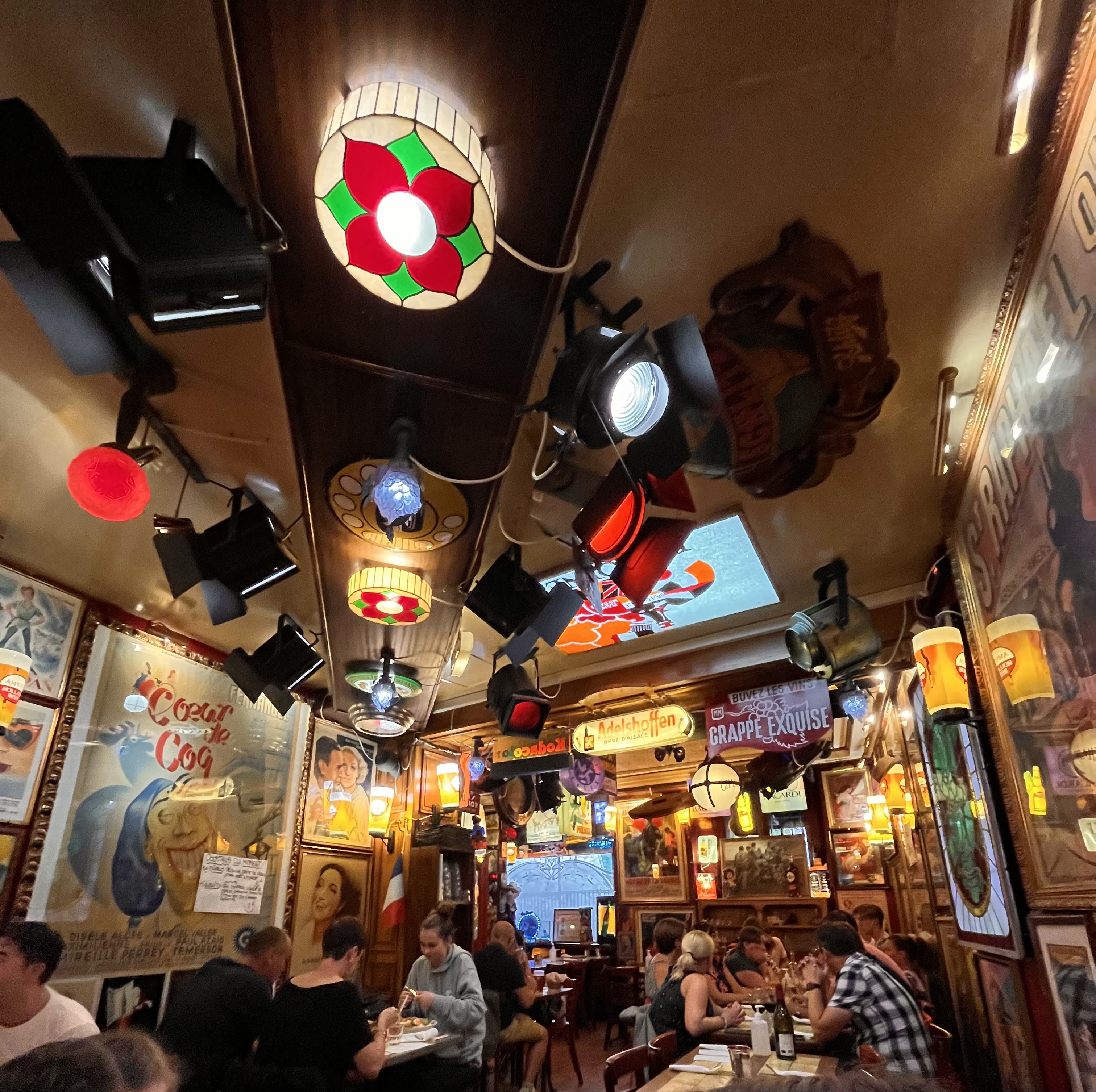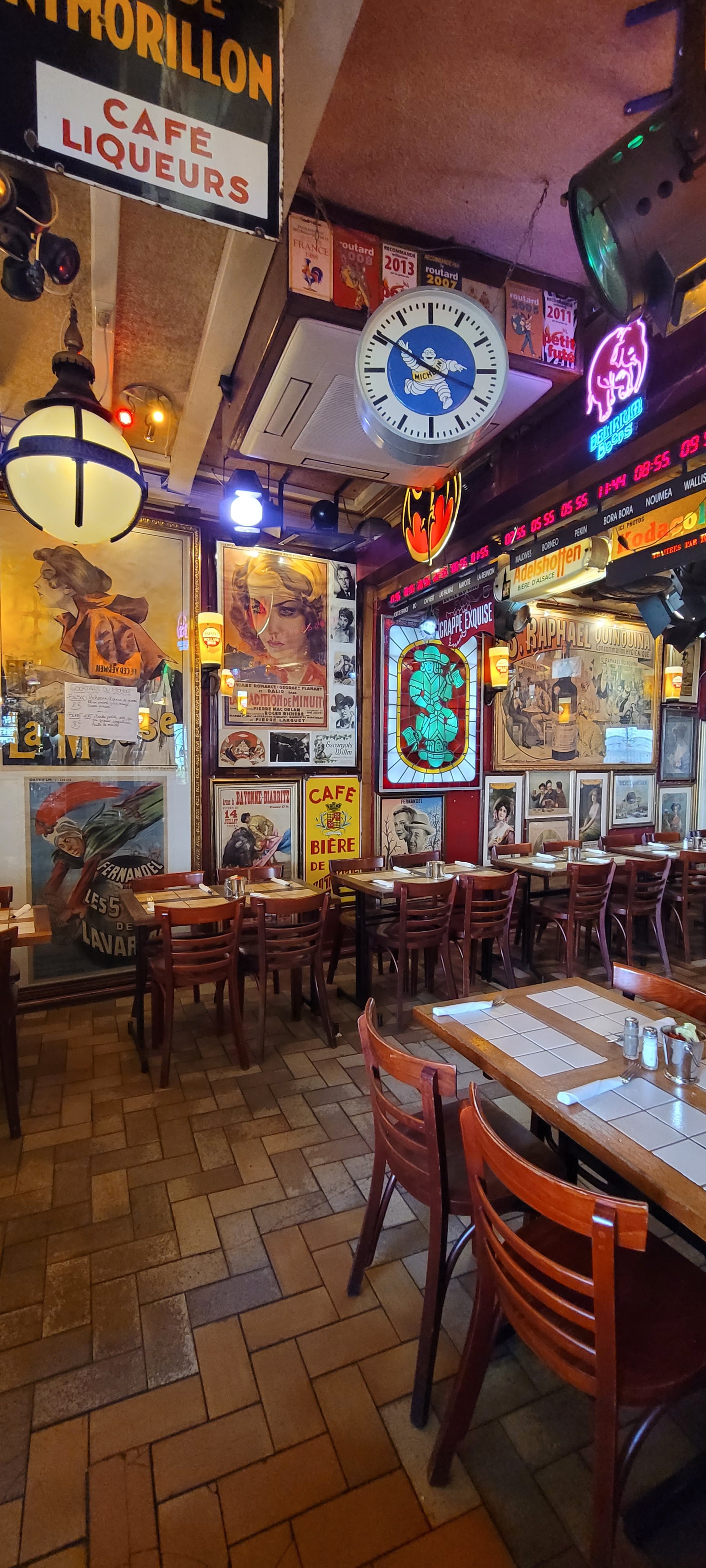 Restaurant qui se démarque par son ambiance particulière. Une décoration saturée d'anciennes affiches de cinéma et autres publicités! Son ambiance est vraiment sympa. Les serveurs(ses) sont agréables dans leur job. Côté plat, j'ai pris une andouillette. Rien à dire sur cette dernière et les légumes qui accompagnait. Je recommande d'y passer une soirée... en réservant!
