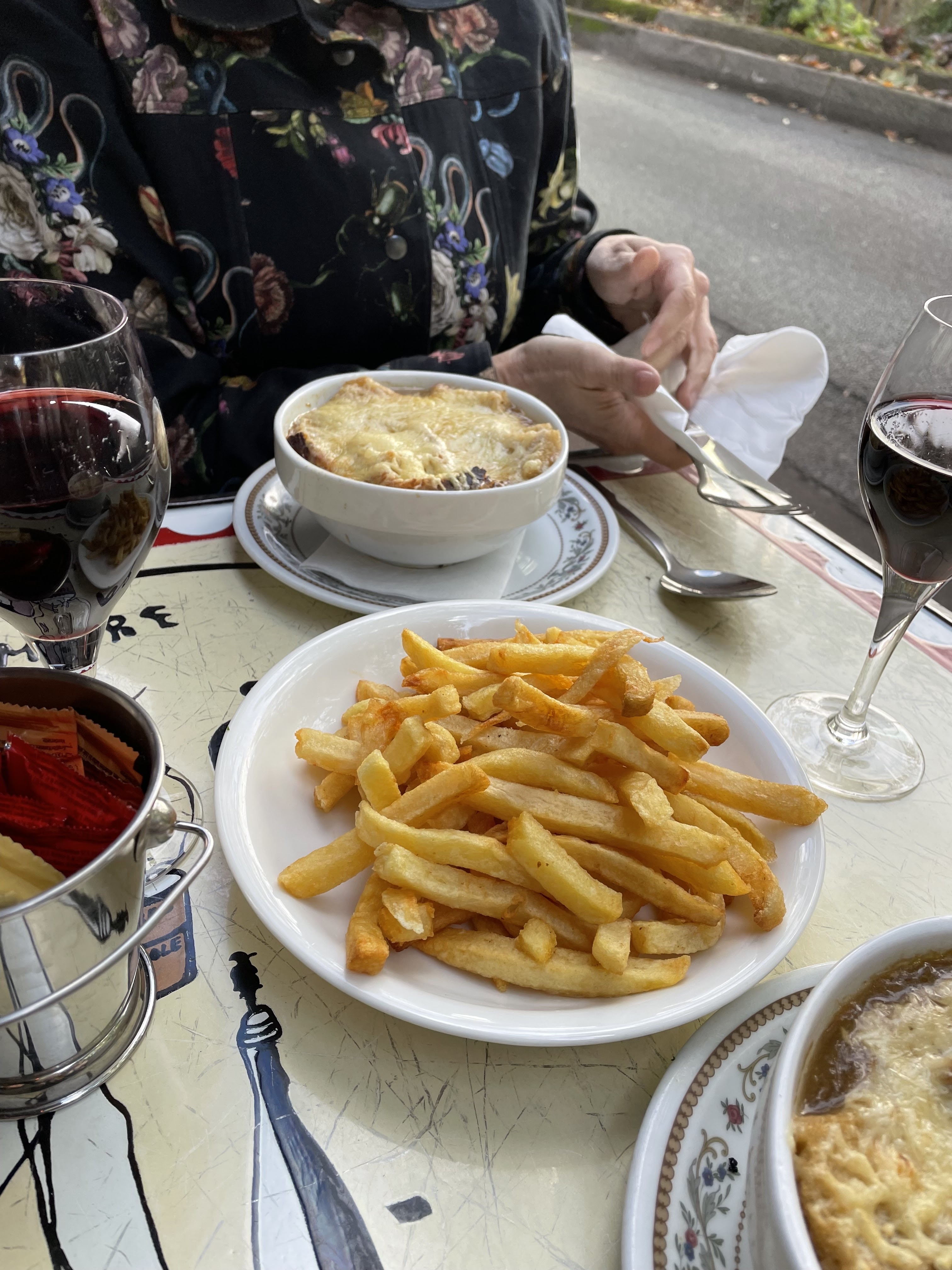 Nous logions localement, nous avons donc décidé d'explorer notre région au lieu de nous rendre au centre de Paris. Étant anglophones, nous n'avons eu aucun problème pour communiquer avec le personnel car ils parlaient un langage raisonnable (courant à modéré). Si vous venez, je vous suggère d’arriver le ventre vide ! Les portions ici sont absolument énormes ! La soupe à l'oignon est présentée dans un bol lavable à la main et figure au menu des entrées ; pas le plat principal ! Et un plat principal pourrait facilement nourrir 2 personnes. Les portions étaient si énormes que nous n'avions malheureusement pas de place pour le dessert, ce que nous avons habituellement. Côté nourriture, nous l'avons trouvé très fonctionnel. Les escargots étaient le point culminant car la sauce à l'ail était très savoureuse. le reste des repas comme la soupe à l'oignon, le jarret de livre et le bœuf avec des fois fres pour nous étaient nettement moyens Nous nous sommes bien amusés cependant. L'atmosphère est très arrangeante, nos serveurs étaient également chaleureux et amicaux. Cet endroit comble définitivement un trou Merci