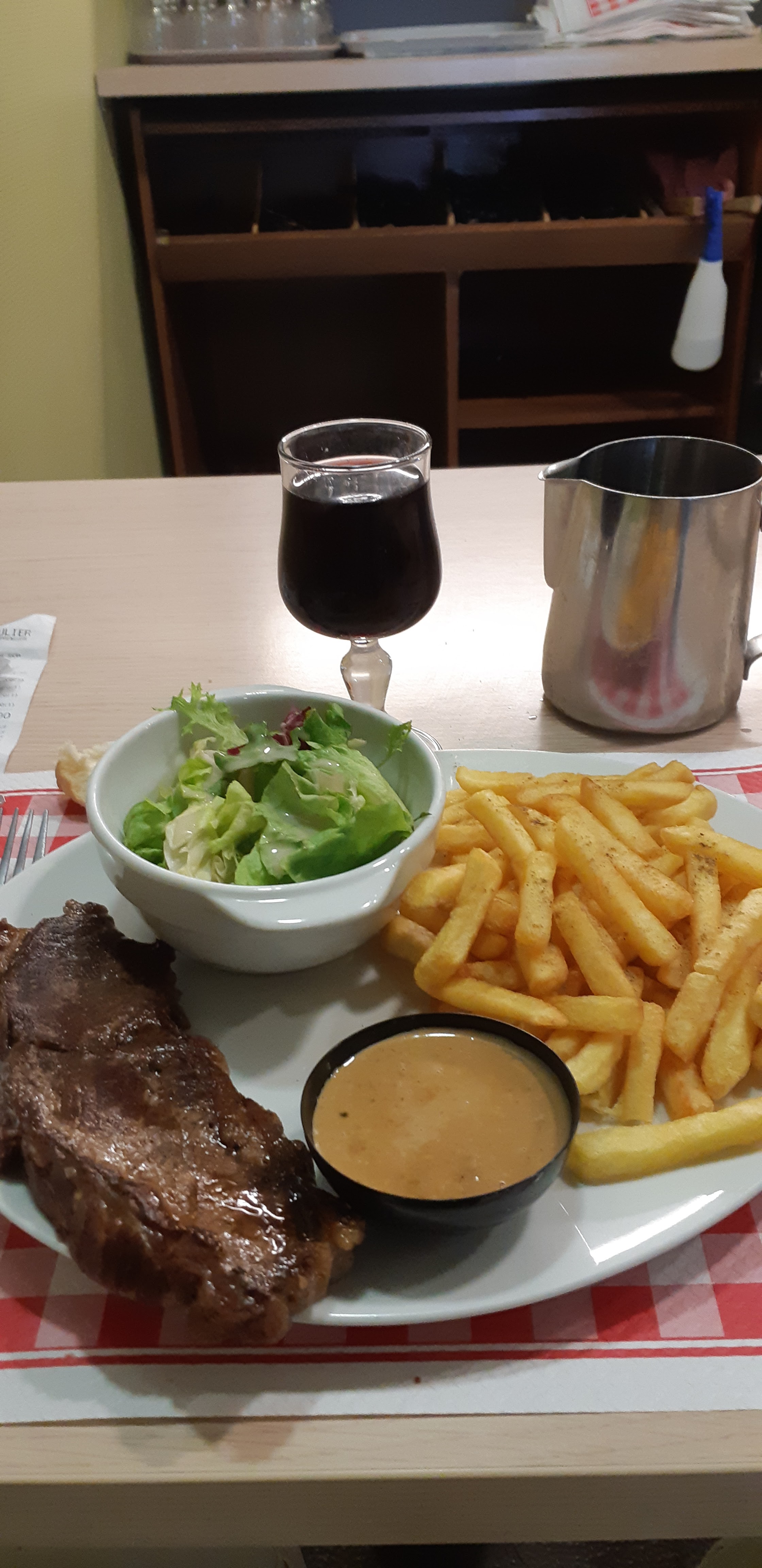 Excellent rapport qualité / prix pour 13 € Buffets très variés des entrées, des fromages et des desserts, tout le monde peut trouver son compte Plat du jour au choix : viande ou poisson, personnellement j'ai opté pour un big entrecôte super tendre (voir la photo)