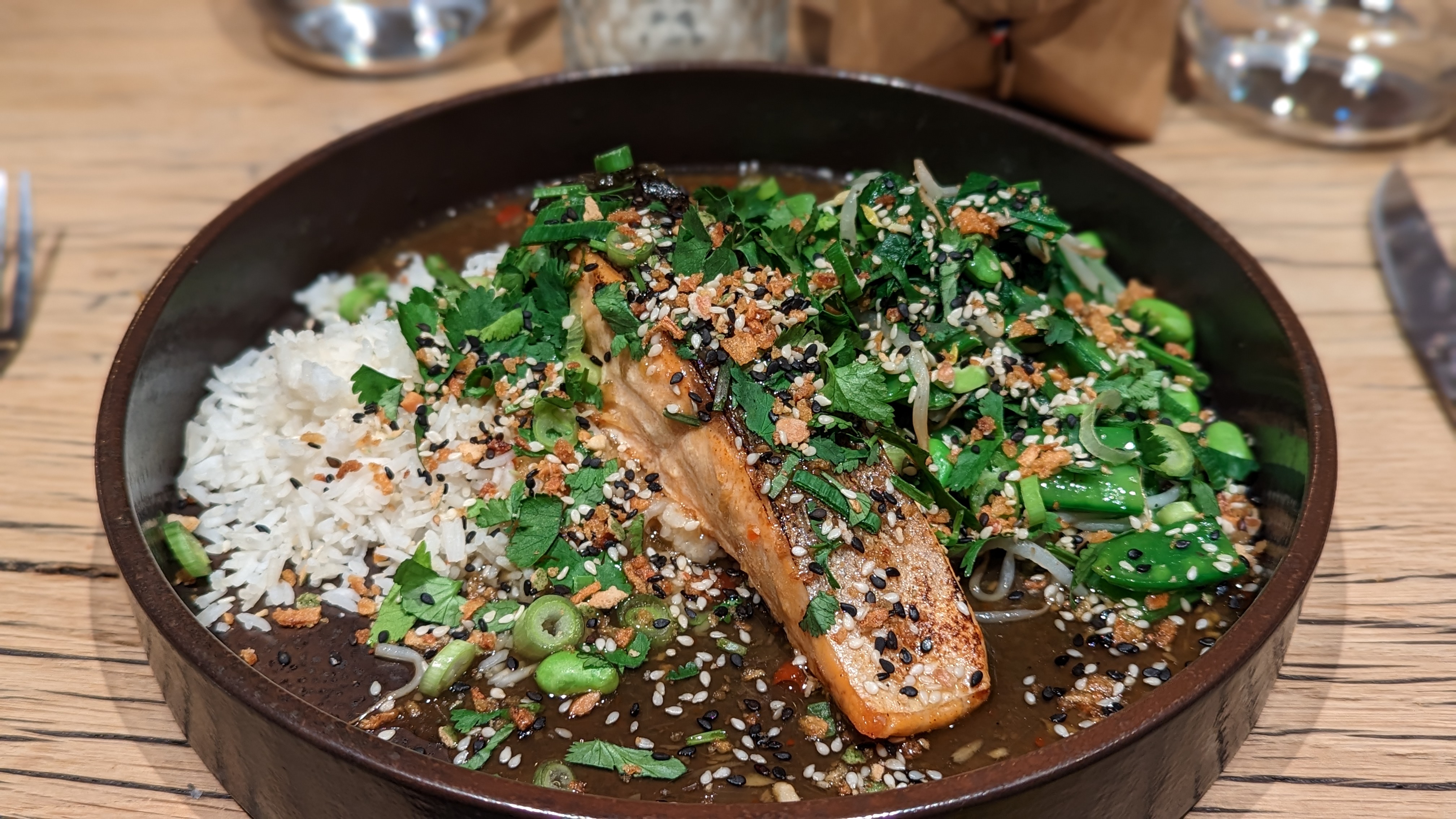En un mot : menu effroyablement paresseux et service malhonnête. Principales raisons : le « menu 100 % végétalien » promis avec enthousiasme par Gill n'a pas été livré ; Un serveur m'a agressivement sermonné sur le fait que le « ramen » est du riz trempé dans une soupe aqueuse, semblable à un plat de curry végétarien figurant sur leur menu. Il a insisté sur le fait que la description du plat indique que ce plat de ramen est principalement composé de riz et non de nouilles. (Il était clairement malhonnête, comme vous pouvez le voir sur la photo du menu). Tout autre commentaire serait une perte de temps. Conseil : A éviter.