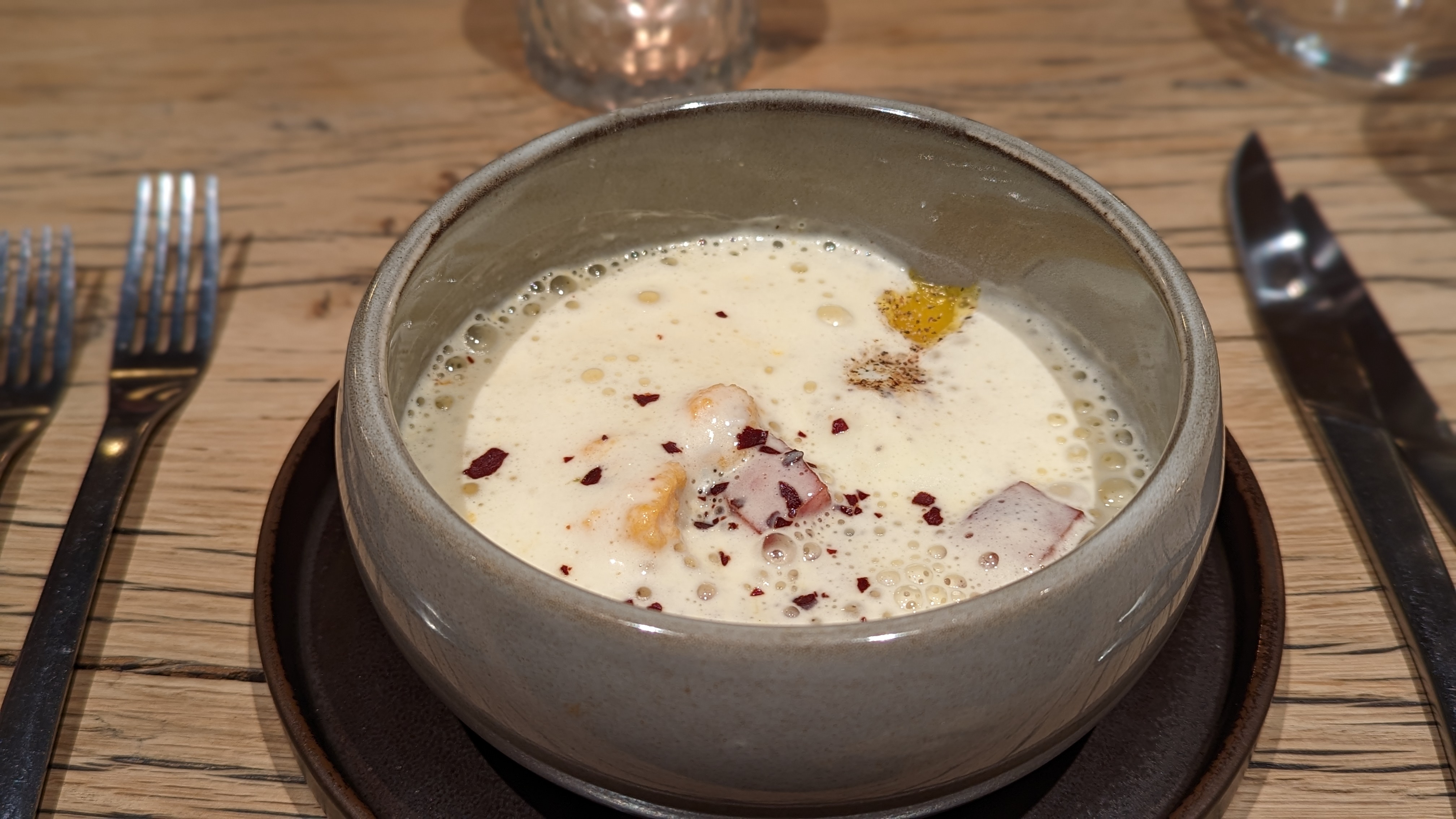 Nico bolo serveur incroyable du début à la fin on a eu le droit à l’histoire de la frite belge petit clin d œil ! 4 entrées commandées à partager juste folles et succulentes, l équipe dans ce lieu 4 étoiles reste simple et pro , une belle cantine encore merci !
