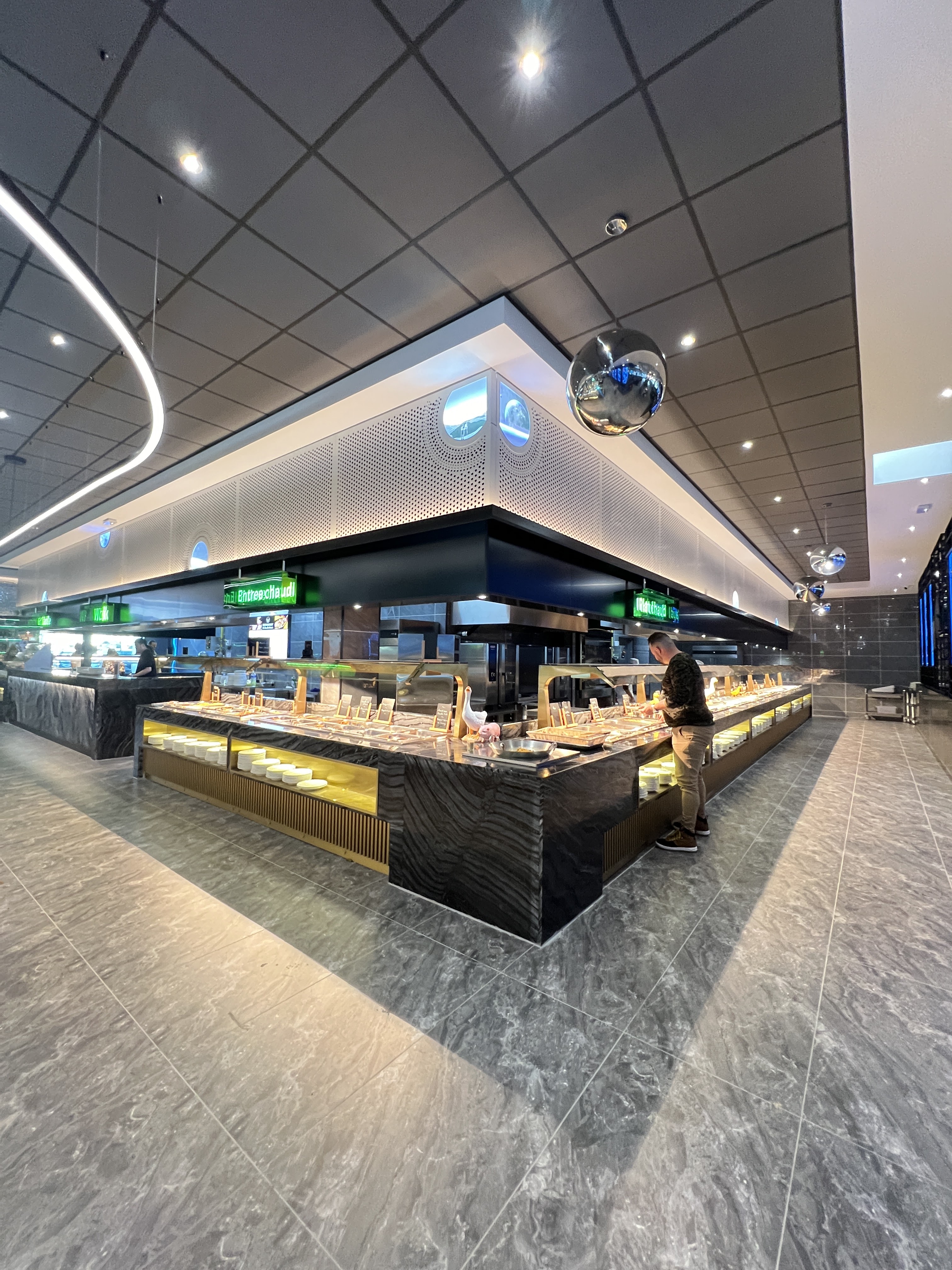 Un très grand choix de produits ! La présentation est soignée et les aliments sont bons. Il y a des salles sur les côtés pour les petits groupes, une salle de jeux (payants) pour enfants et un salon fumeur