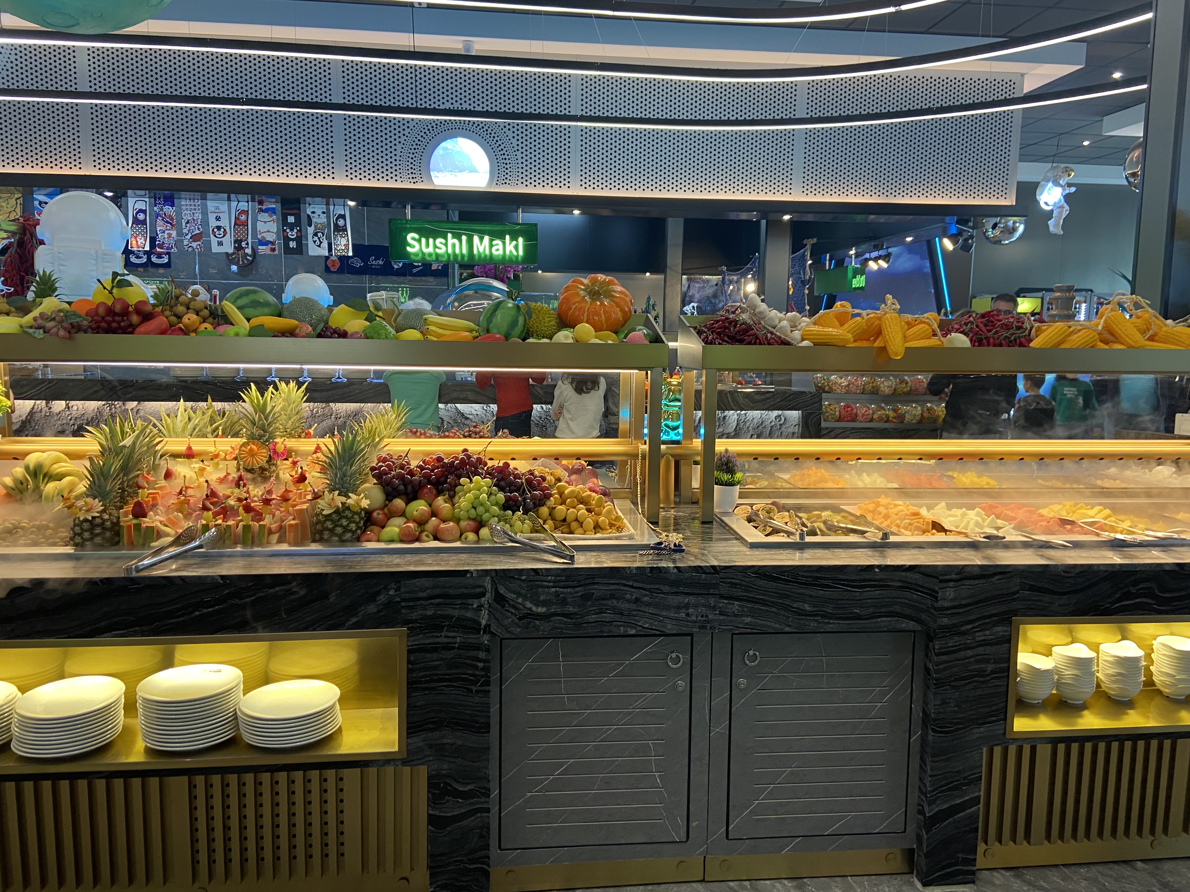 Wok avec un décor très original ! 2 petits robots pour servir les boissons. Beaucoup de choix asiatique ou + français comme jambon, foie gras... Les amateurs de fruits de mer peuvent s'y régaler ! Le rayon pâtisserie est gigantesque... Un pur régal