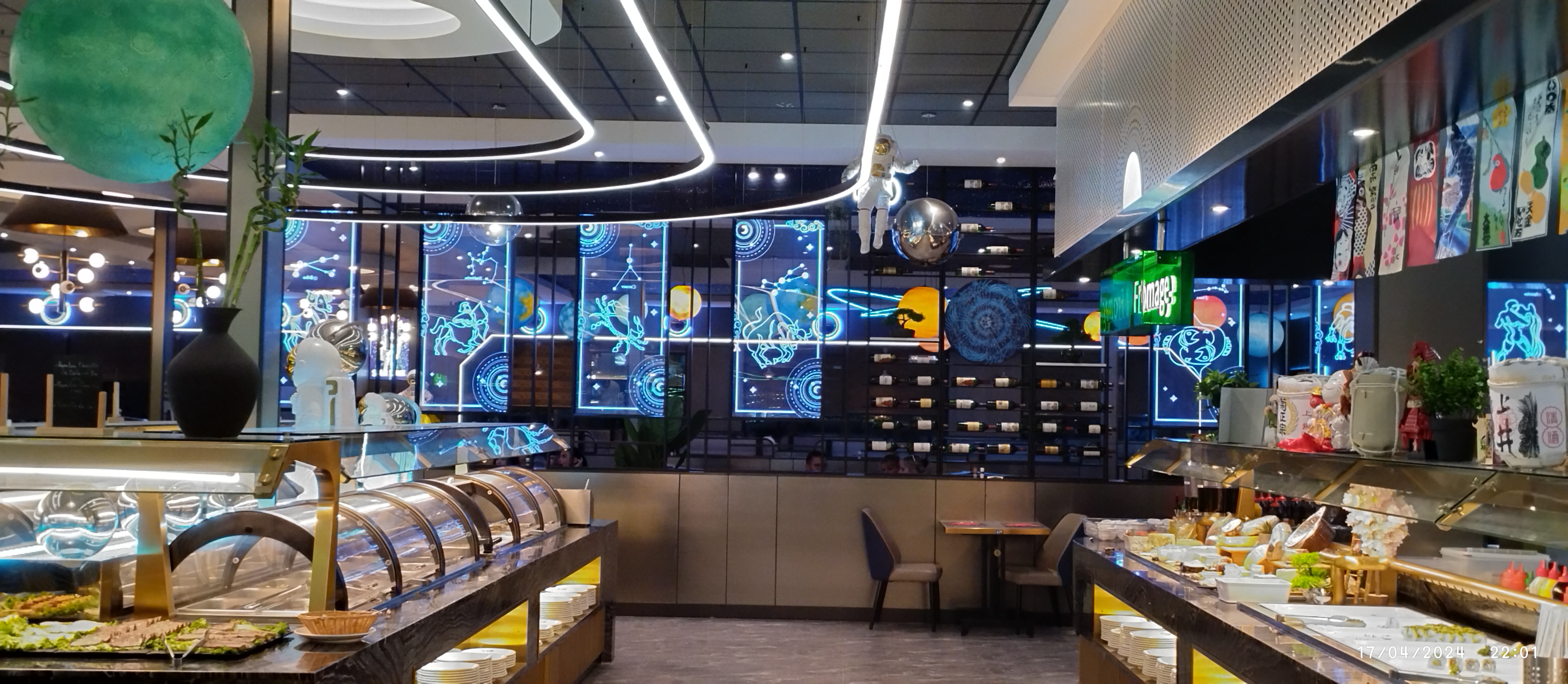 Un buffet à volonté en taille XXL et absolument somptueux côté déco (planètes, signes du zodiaque, astronome). Côté plats, un choix incroyable pour tous les goûts et délicieux. Ambiance chaleureuse et feutrée. Fauteuils confortables. Seul petit bémol, les tables sont trop serrées les unes des autres, mais ce n'est qu'un détail. Merci à vous. Signé de la part de clients fidèles aux buffets de Besançon et de Chalezeule