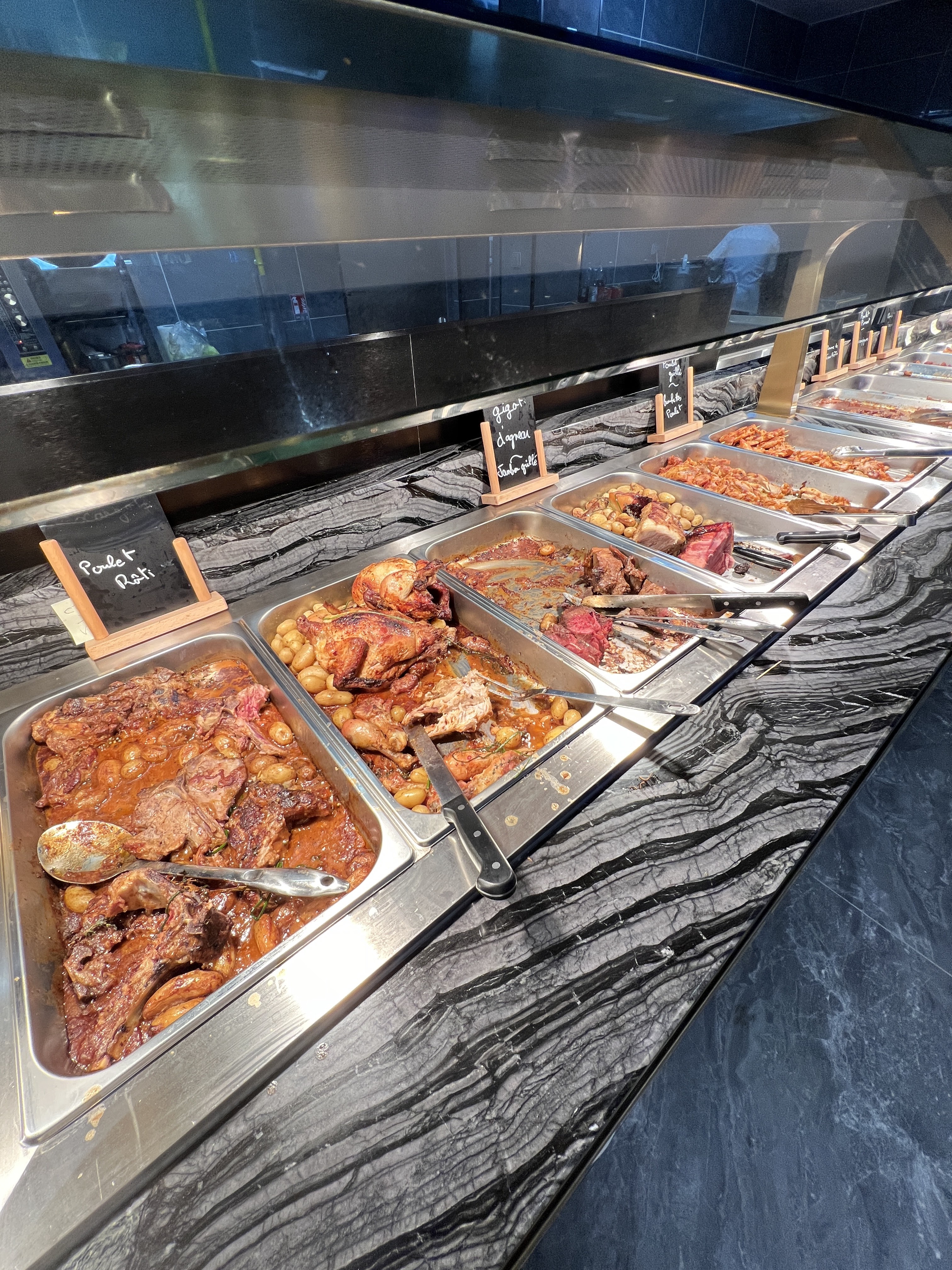 C'est le plus grand buffet jamais vu. Énorme choix asiatique (sushi nem ...) et divers ( gigot poulet roti gratin dauphinois..) un choix immense. Impossible de ne pas trouver son bonheur.