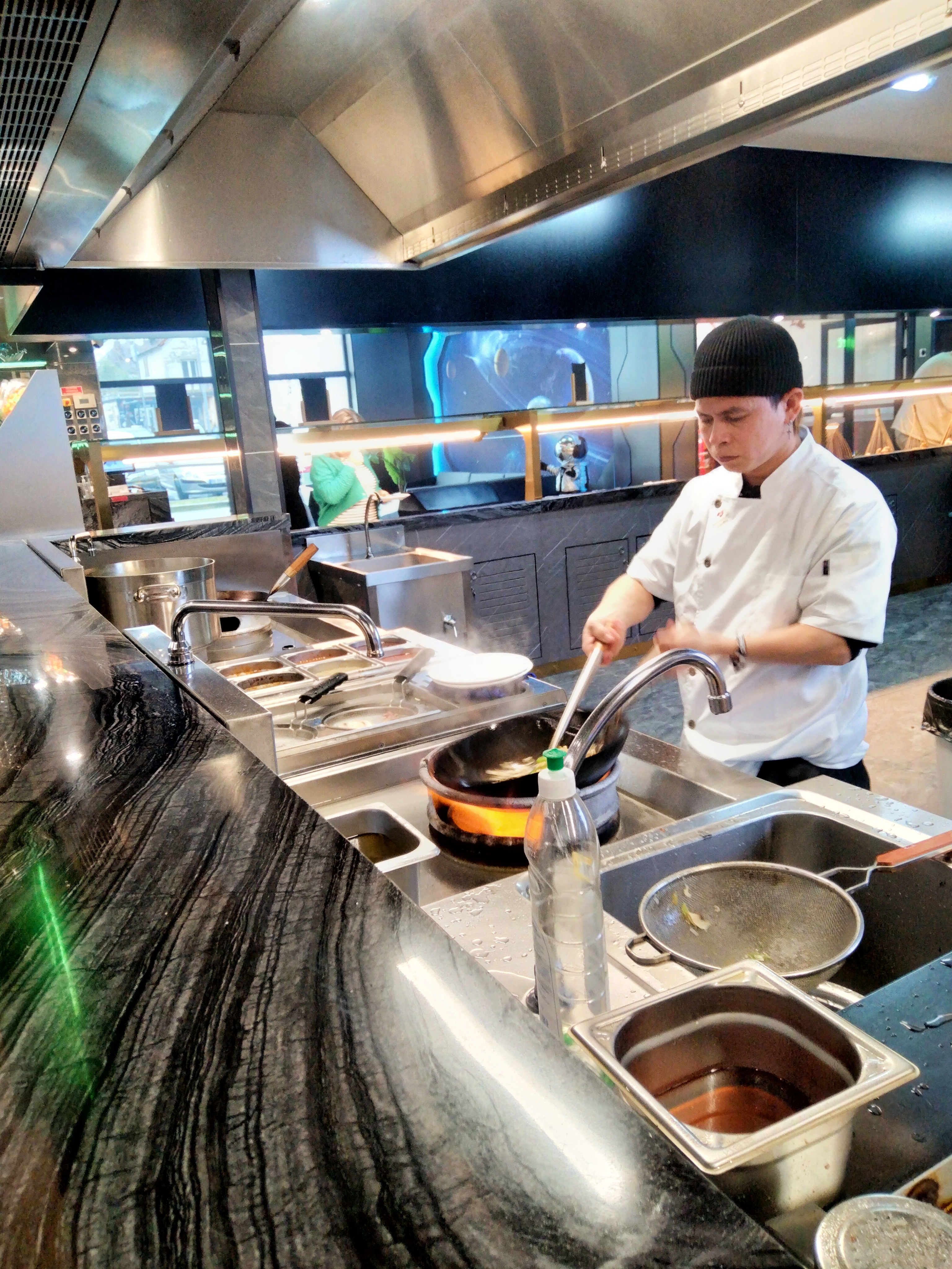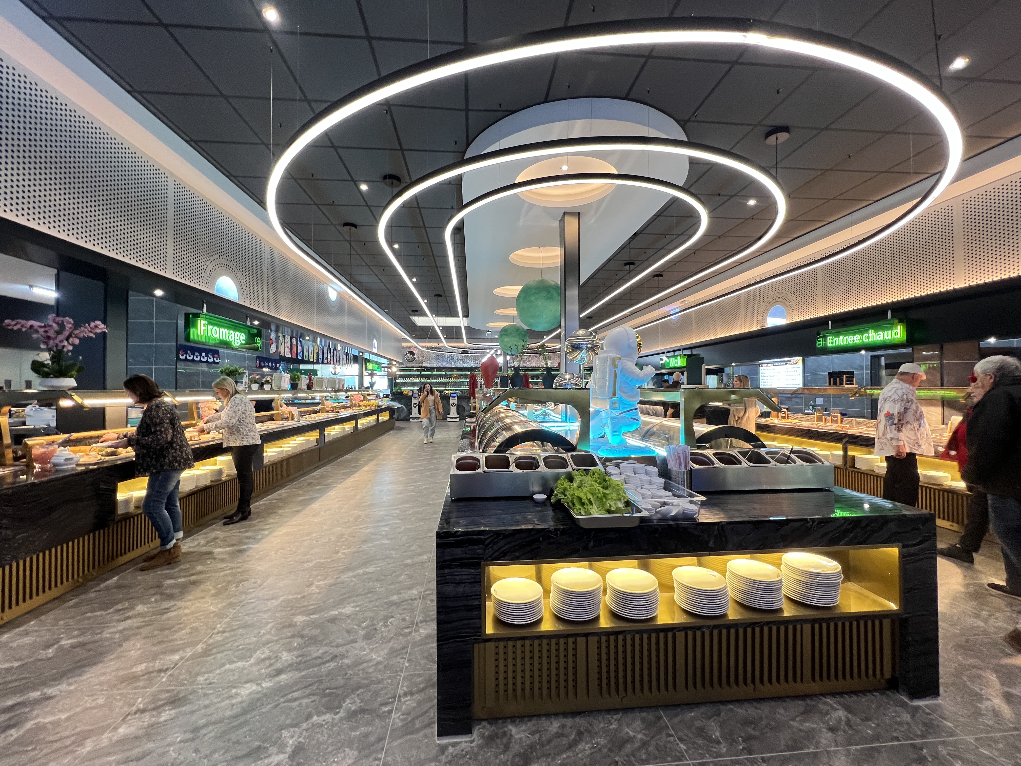 Un lieu grand (gigantesque?) moderne, lumineux, matériaux de qualité un vrai effet Waouh quand on rentre, les buffets à volonté s'étendent sur plusieurs mètres linéaires. Le choix est phénoménal bien que majoritairement axé sur les spécialités asiatiques, on trouvera aussi des plats européens. De petits robots vous servent les boissons ce qui amusera les plus petits. La qualité est convenable. le rapport qualité prix correct pour les grosses faims (17€ à midi) beaucoup plus cher le soir. Le point faible sont les desserts 100% industriels sans intérêt qui ne permet pas de terminer le repas sur une bonne note. Le personnel (impersonnel) donne plus l'impression d'être dans une usine à victuailles que dans un restaurant convivial, certains de part leur tenue vestimentaire ne donnent même pas l'impression de faire partie du restaurant (habits de football) on le découvre quand ils nous servent ou débarrassent. Un lieu plaisant à découvrir mais qui doit s'améliorer au niveau de la chaleur de l'accueil pour donner envie d'y retourner.