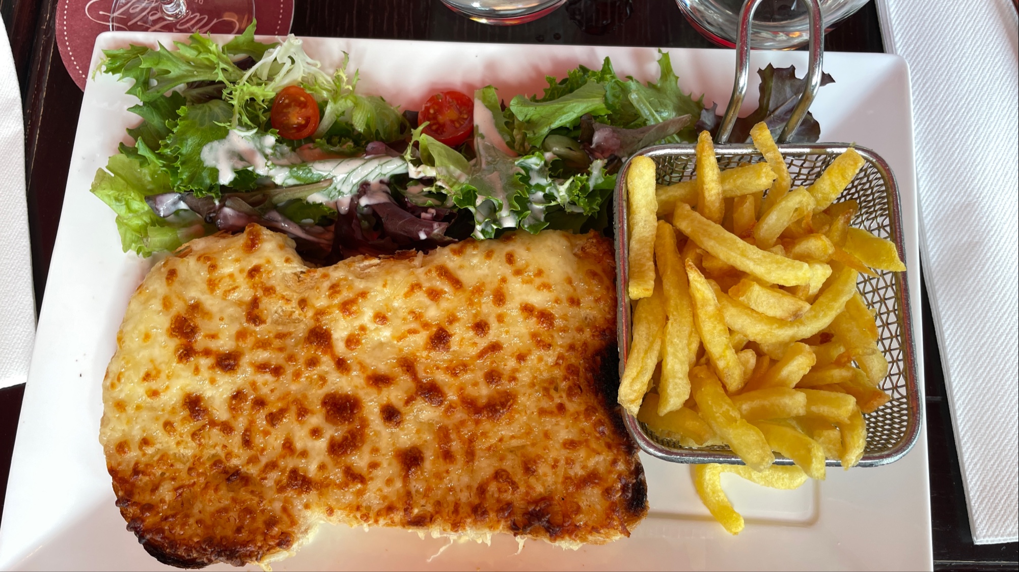 Nous avons profité de l’offre Paris City Pass. Nous avons eu un grand toast avec des pommes frites, de la salade et une coupe de champagne. Tout était délicieux et c'était une bonne chose pour un déjeuner. Le personnel est très occupé et un peu confus.