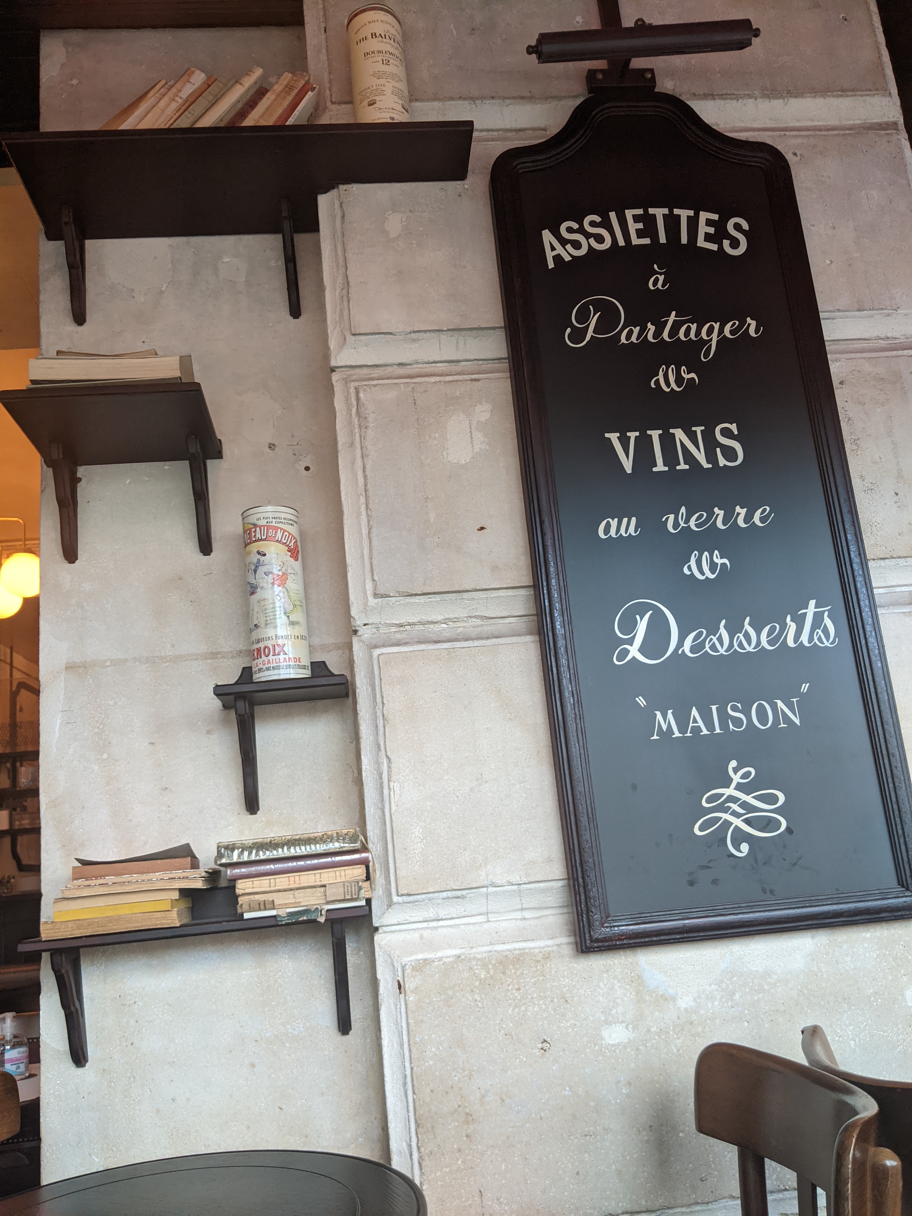 Des endroits mignons et proches à voir absolument. La première chose que j'ai remarquée a été la fantastique sélection musicale... Comme si elle était organisée par le DJ Garth Trinidad lui-même. Je suis venu au Happy Hour et j'ai dégusté un verre de vin à un prix intéressant avec un délicieux dîner. Les serveurs m'ont réprimandé en plaisantant sur mon mauvais français et n'ont pas plané, mais nous sommes disponibles chaque fois que j'avais besoin de quelque chose. Mon serveur m'a fourni de précieux conseils sur les éléments du menu et était incroyablement sympathique. (Pour les normes françaises des serveurs) Pour le prix, l'emplacement et la commodité, je reviendrais absolument et essayerais de m'asseoir à l'extérieur lorsque le temps est meilleur. Merci BDS !