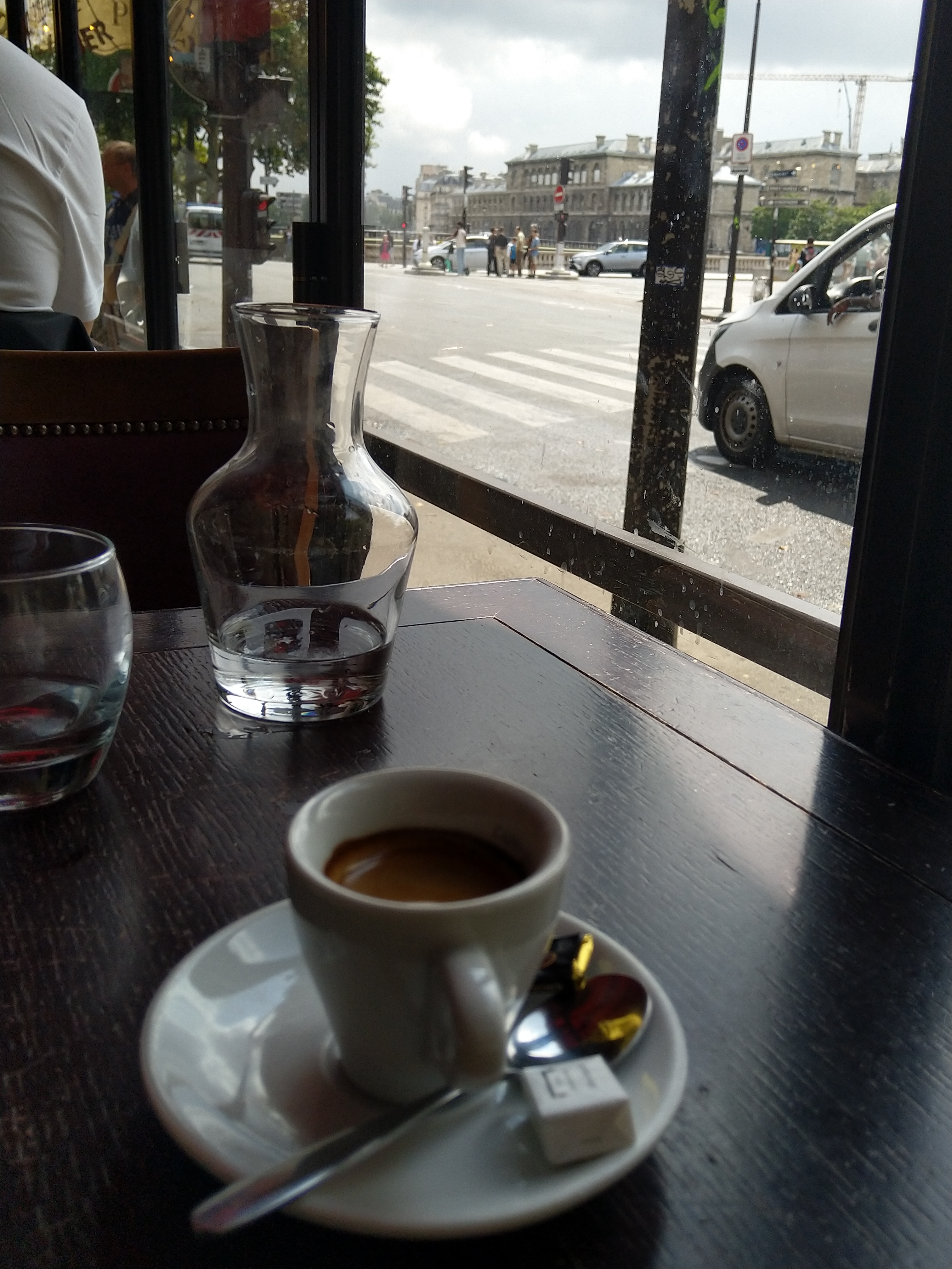 Nous avons pris là bas un petit déjeuner avec vue sur Notre Dame (quelques heures avant l'incendie...). Tarif un peu cher mais dans la moyenne du quartier (9 euros pour le classique, dans les 15 euros avec des œufs). Tout était très bon, pain frais , beurre et confiture de qualité, jus d'orange frais, et un bon point pour les œufs bio, vraiment délicieux. Serveur efficace et sympathique finalement malgré un abord un peu revêche (tradition brasserie !)