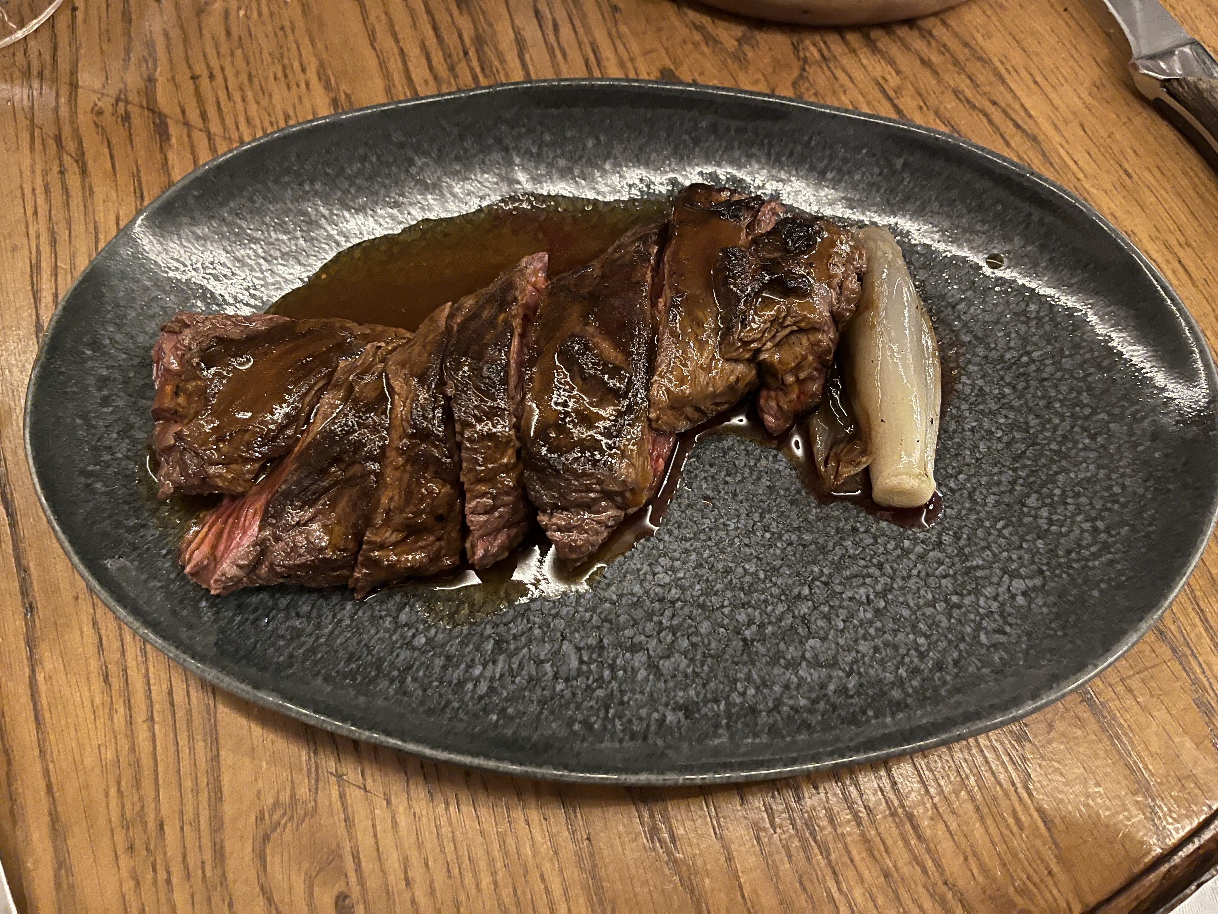 J'ai commandé une entrecôte comme recommandé par la serveuse. Ce qui était réellement servi n'était pas une entrecôte mais un jarret de bœuf bon marché. C'était trop dur à mâcher, donc je n'ai pu en finir qu'une moitié. C'était mon dernier jour à Paris et je ne voulais pas gâcher ma journée, donc je ne m'en suis pas plaint.