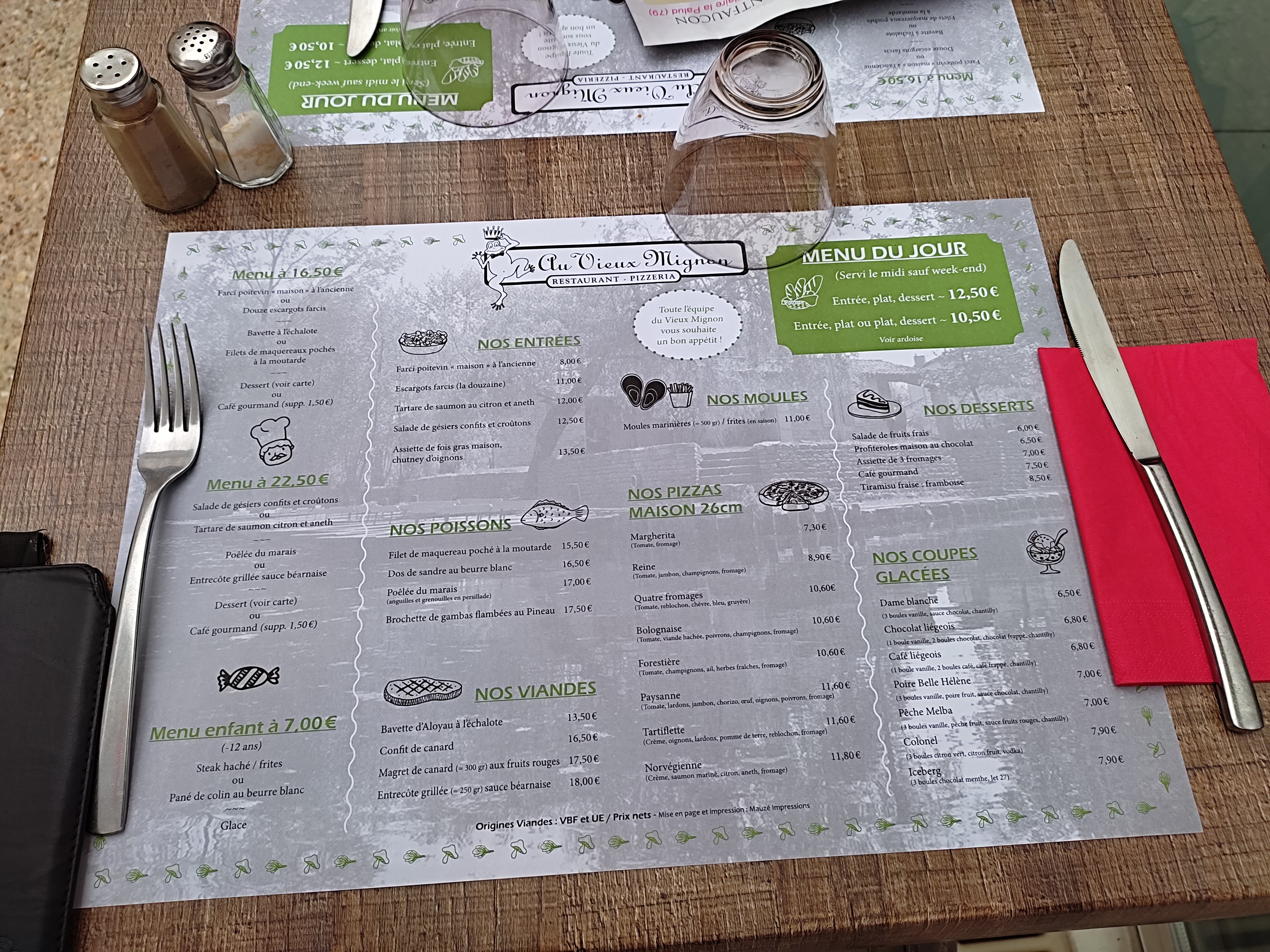 Pour se restaurer si vous êtes à côté. Services correct, prix bon marché, nourriture correcte. Nous nous sommes arrêtés pour se restaurer après avoir fait un tour en barque dans les marais. Nous avons pris un menu du jour à 13€50, un menu à 16€50 et deux pizzas. Pour le menu du jour c'est correct pour le prix ! Petite salade avec du saumon cuit. Pour le plats, de la poitrine marinée grillée, plutôt à la mexicaine légèrement épicée. Le menu à 16, entrée le farcis poitevin, beaucoup d'épinards et très peu de viande. Le plat, maquereau sauce moutarde, un seul filet avec une sauce assez transparente (peut-être normale, pénurie de moutarde et restriction d'eau). Les pizzas, la savoyarde beaucoup trop, salée, à revoir. Les desserts, les profiteroles, ne casse pas trois pattes à un canard. Le tiramisu fruits rouges, comme beaucoup de restaurateurs, arrêté d'utiliser l'appellation tiramisu pour tous vos desserts qui n'en sont pas. Celui ci, fruits rouge très bon avec crème fouettée + appareil + biscuit. Je précise qui est difficile de trouver d'autre restaurant aux alentours.
