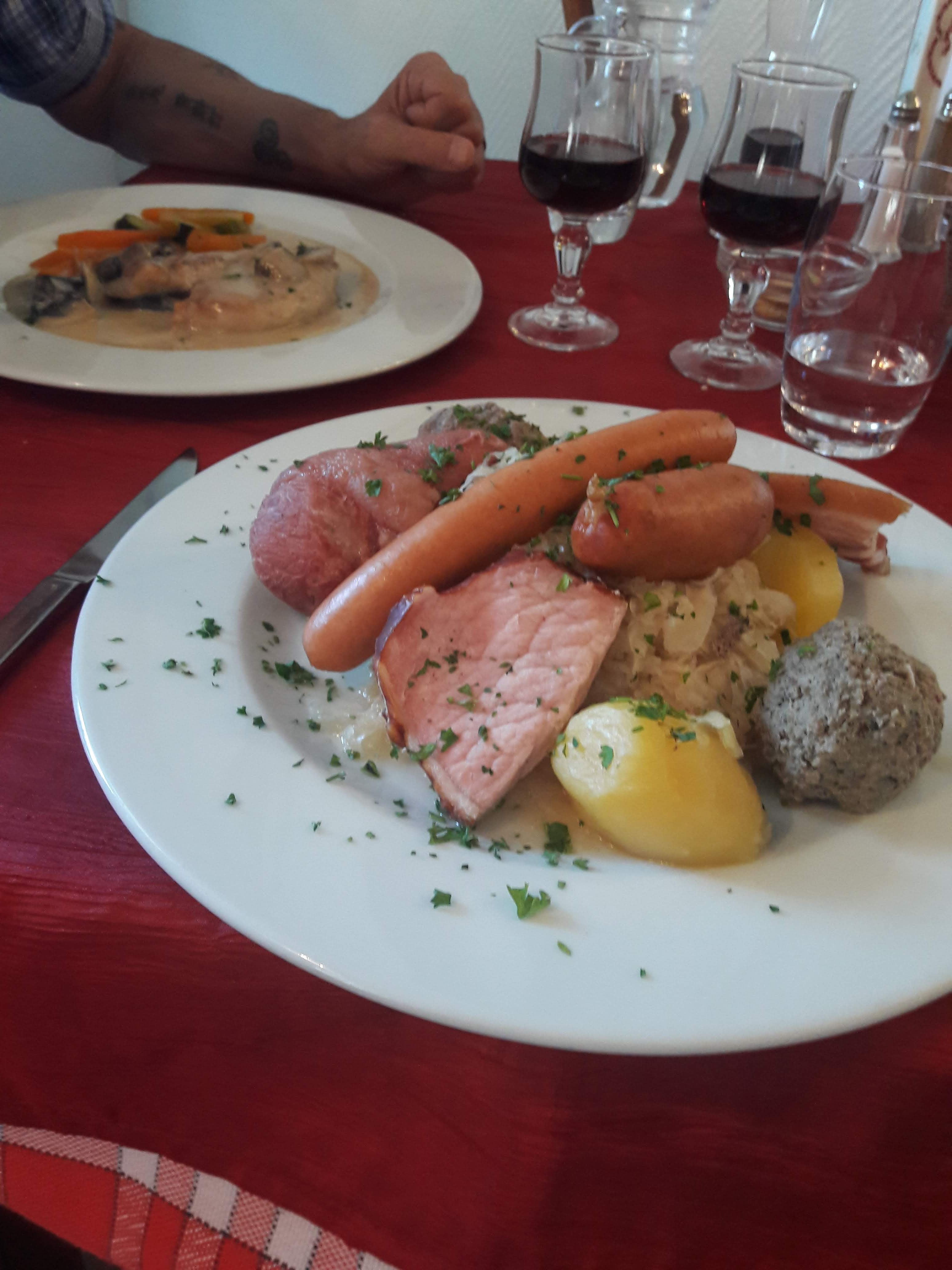 J'ai pris une choucroute royal et mon mari un menu 23e Ma choucroute manquait de goût la viande käesler trop sèche ainsi que le lard le reste moyen les boulettes de foie ont été excellentes ... pour le menu à 23 e un paté et ses crudités il met un 2.4 sur 5 Pour le dessert c était une tarte aux mirabelles d un avis en commun je dirai qu il manquait le nappage un peu fade tt de même restaurant moyen le décor sympa.. si on veut manger une bonne choucroute allez en Alsace le décors et la choucroute sont au top ça vaut le déplacement