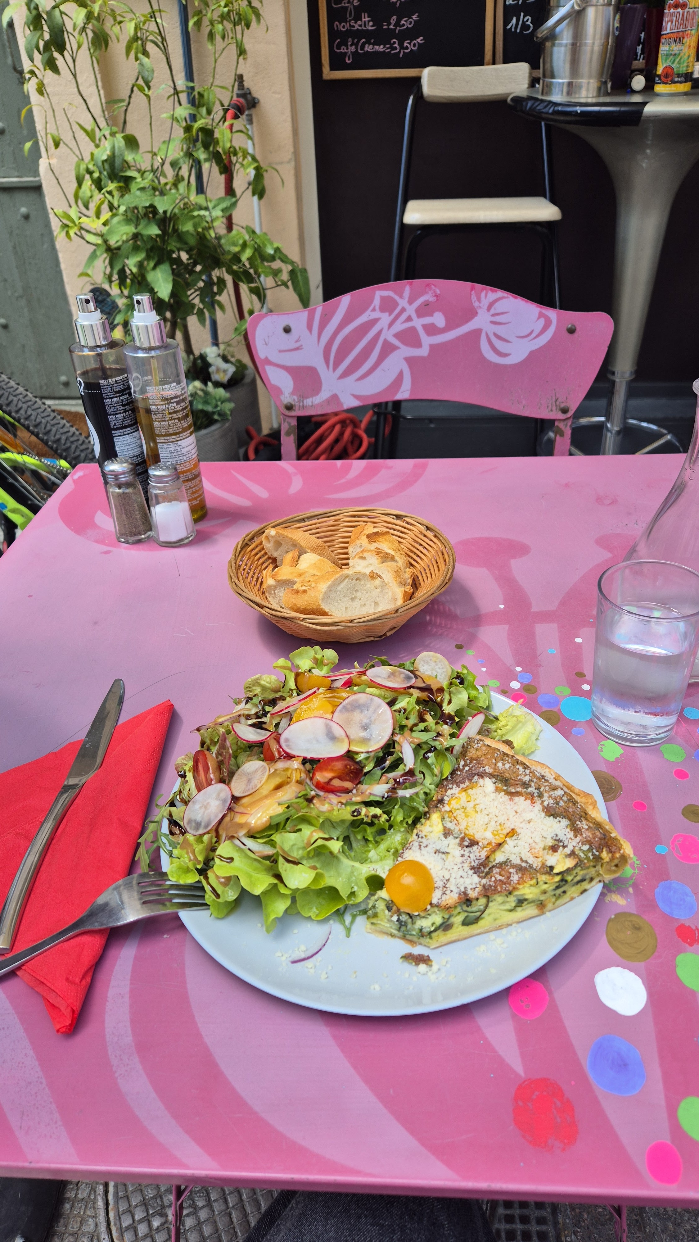 Cuisine simple mais si bonne ! Legumes frais, salade croquante... la tartine pesto mezzanine et la tarte courgettes sont délicieuses !