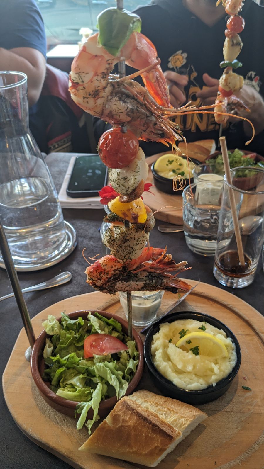 Cadre sympa Entrée : oeuf cocotte assez bon un peut trop de crème à mon goût Plat brochette gambas, st Jacques très bonne la st Jacques est bien cuite et les gambas décortiquer servi sur planche à la verticale avec en accompagnement un écraser de pommes de terre. Dessert planche gourmande 2 petits desserts correct.