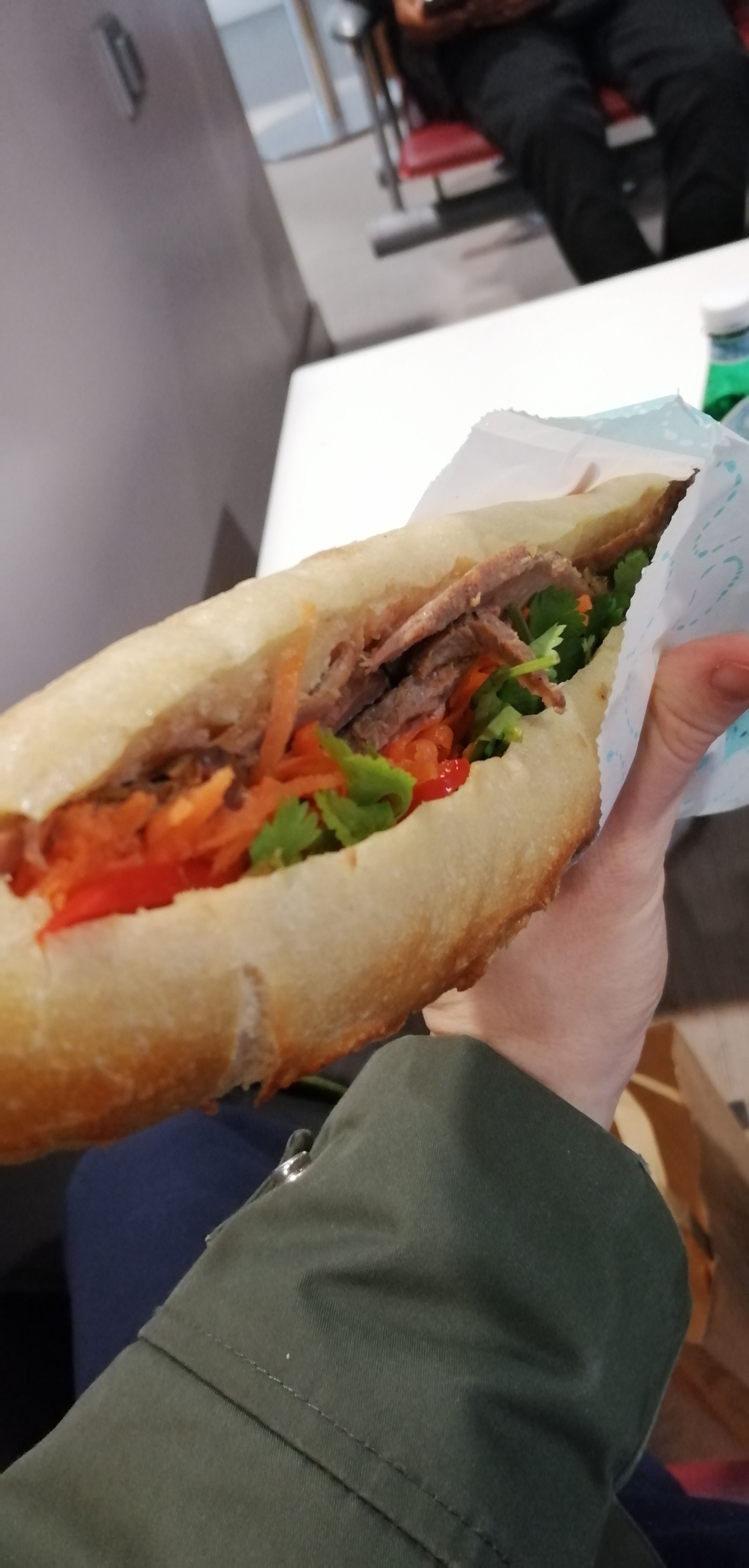 Très bon Bahn mi : bon pain, carottes, concombres et piments bien marinés, bon bœuf citronnelle. Pas de soja inutile pour blinder le sandwich Bon prix (formule) Meilleur plan du coin pour attendre un bus ou un train