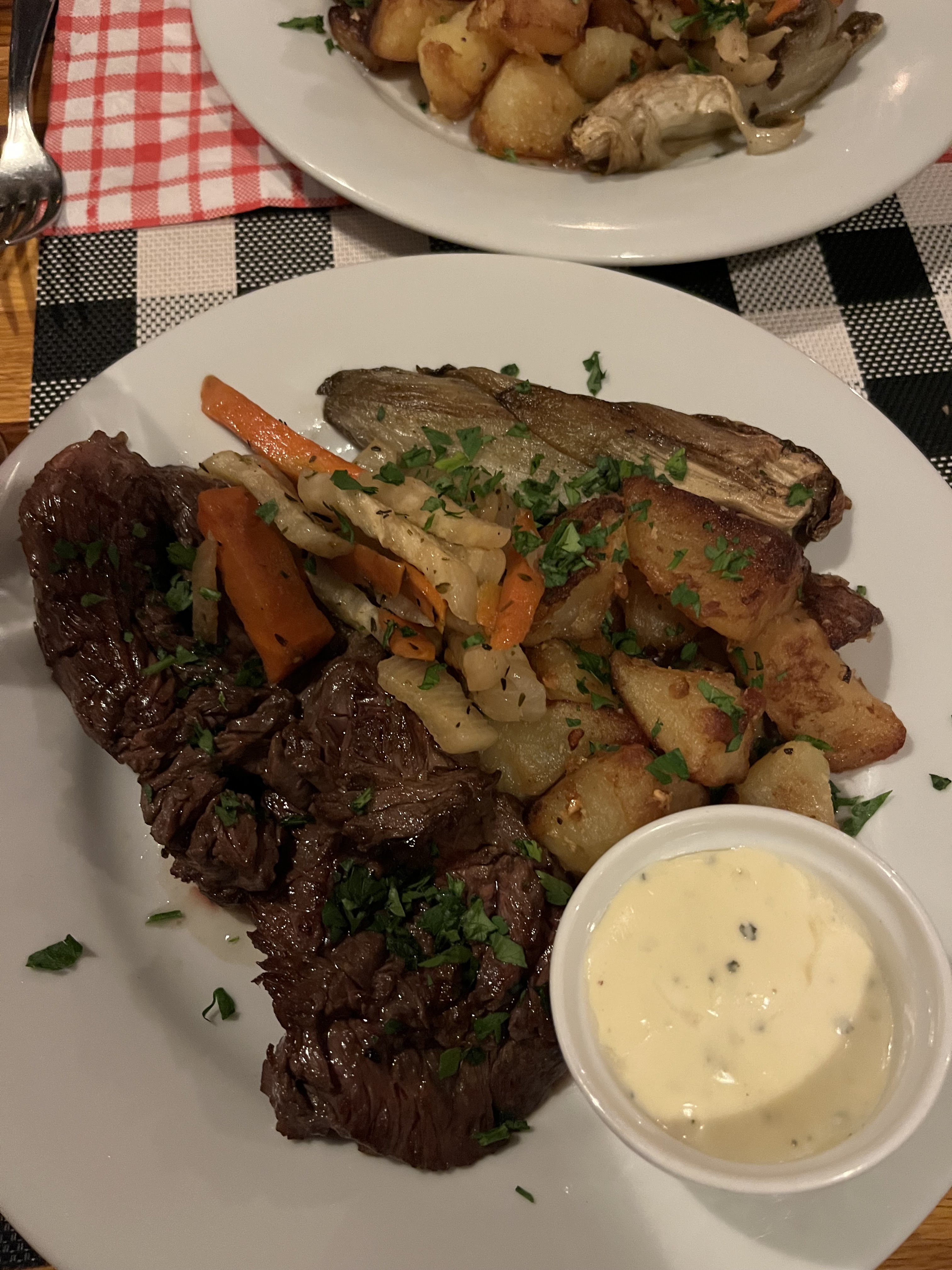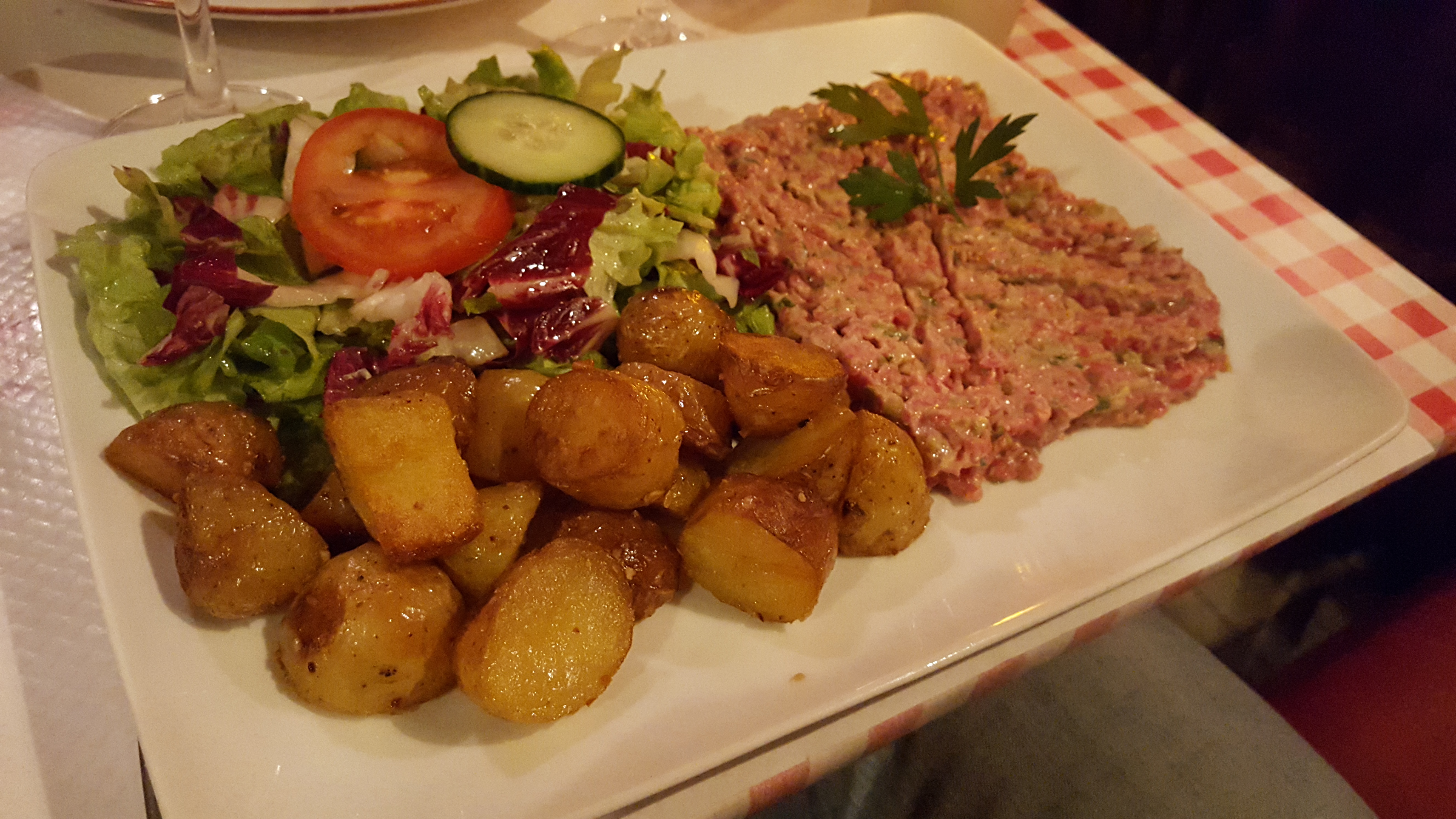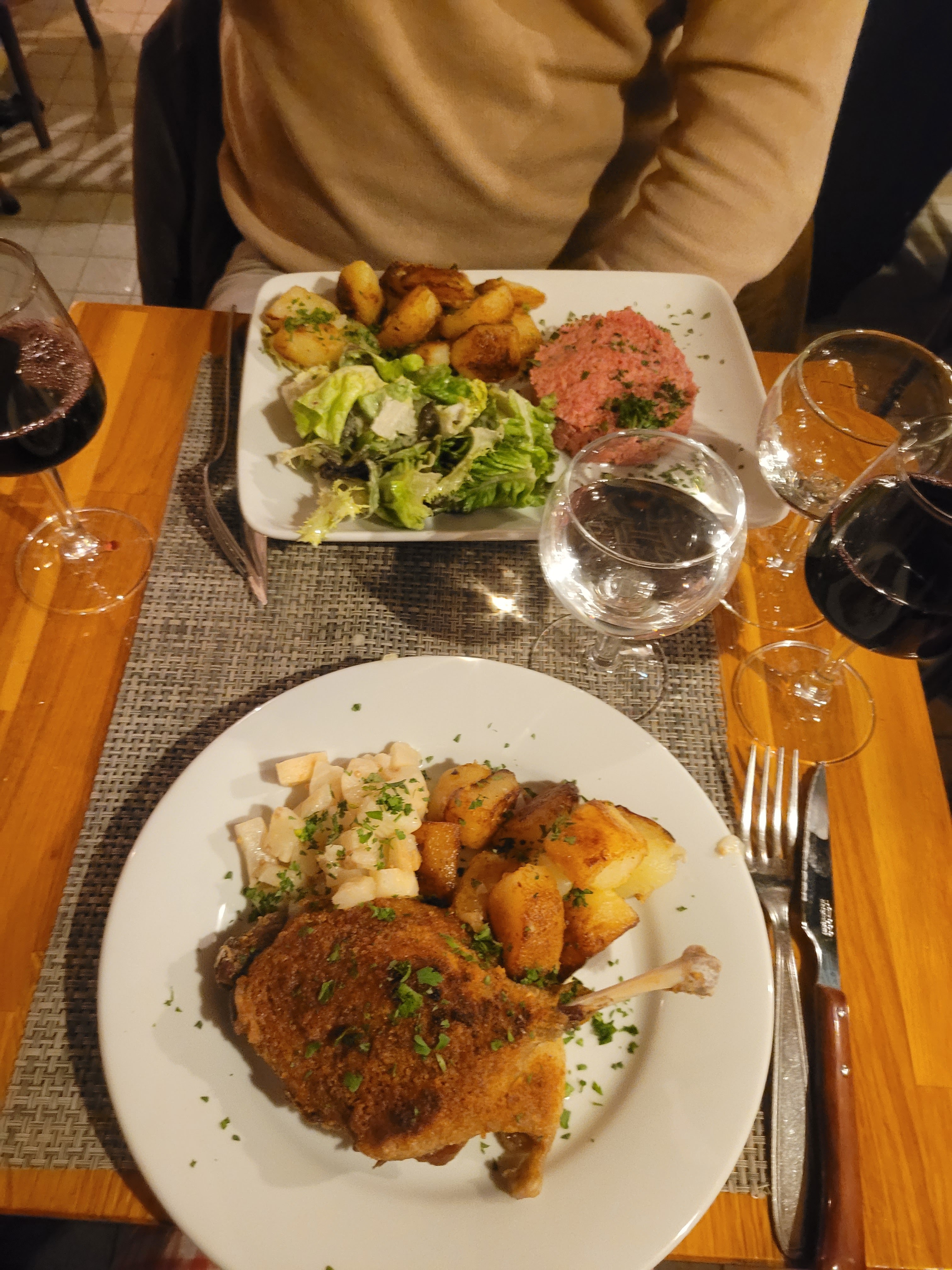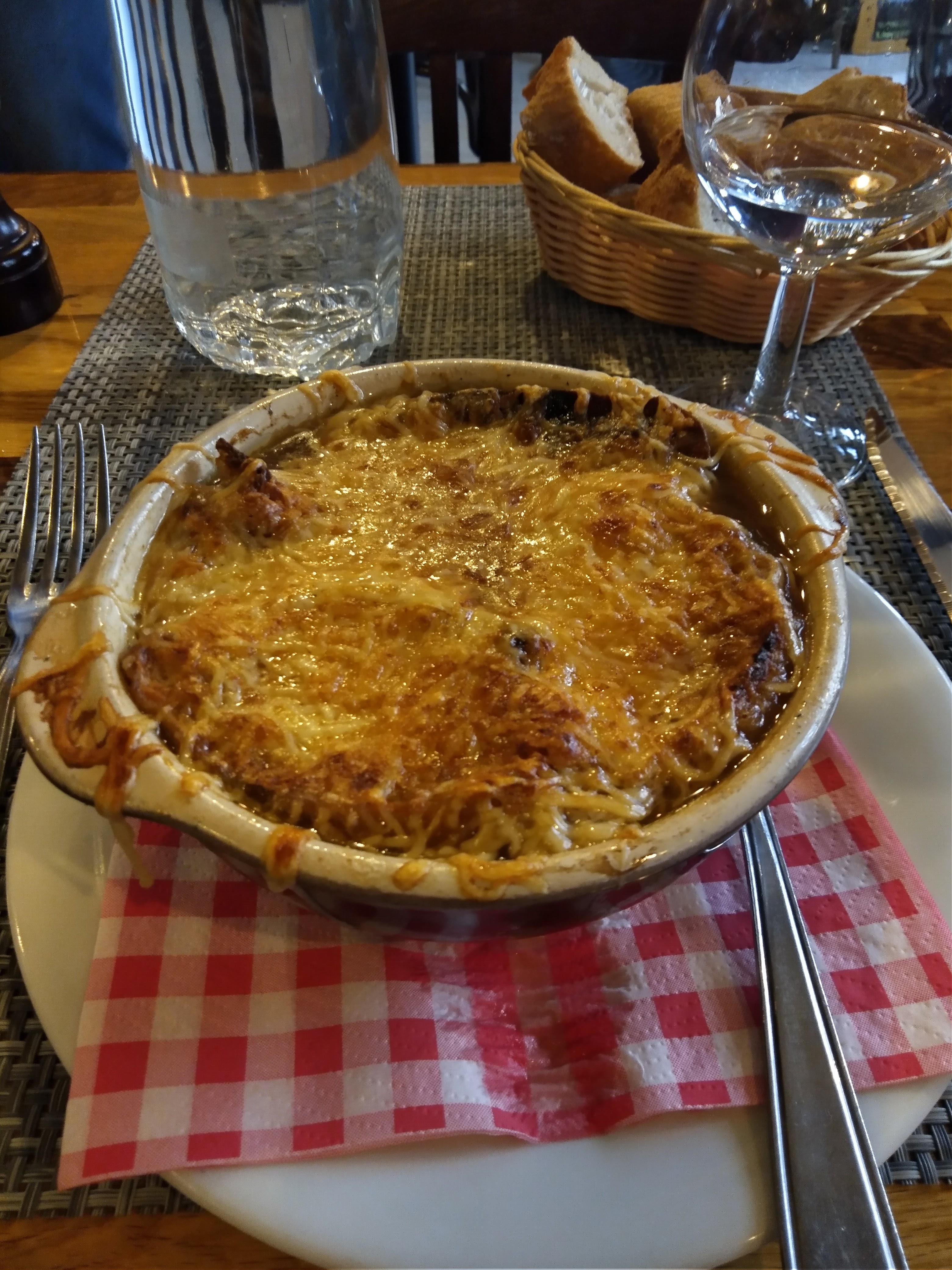 Restaurant typiquement français, petit, informel, accueillant et personnel sympathique. Deux entrées gratinées d'oignons et croûtons de fromage et deux assiettes de magret de canard et bœuf bourguignon, cruches bourguignonnes, le tout délicieux et copieux. Des prix en adéquation avec la qualité des plats. Informé.