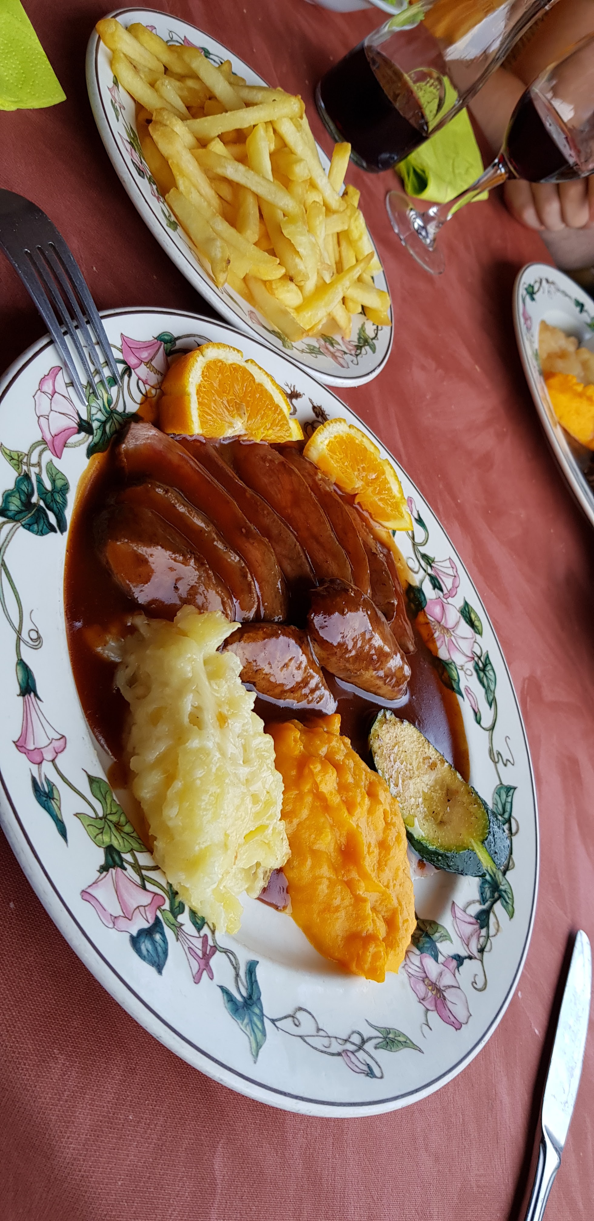 Deux agréables terrasses et un service tout aussi agréable, la soirée commence bien, malheureusement cela ne va pas durer. En effet, les clients arrivent et parmi eux de très nombreux groupes venant de la Pfalz toute proche et malheureusement très bruyants. Nous avions toujours espoirs de bien diner, mais là aussi, déception. La présentation des plats nous a fait faire un voyage dans les années 70 et la qualité servie n´était pas à la hauteur des commentaires que l´on peut lire sur cet établissement. Les frites sont des surgelées, les sauces ont l´air industrielles, le chateaubriand était en réalité un émincé de bœuf servi avec une cuisson très rosé alors que nous avions demandé à point et pour finir le strudel était tout droit sorti d´une usine et sa pate était sur le fond si dure que cela en devenait immangeable le tout accompagné d´une crème chantilly de chez Métro ou autre fournisseur. En résumé, nous sommes repartis déçus de cette cantine qui je le pense doit ravir une clientèle qui se satisfait de se remplir l´estomac dans un cadre idyllique. Dois-je ajouter qu`à l´apéro on nous a proposé un Mojito sans alcool pour ma femme et notre fille et que lorsque j´ai voulu commander un Mojito à mon tour mais avec du rhum cela n´était pas possible ! Heureusement par ailleurs car là aussi il s´agissait d´un produit industriel qui leur a été servi. Pour couronner le tout, alors que nous sommes en Alsace qui pour autant que je sache est plus que connue pour ses bières, ici les seules disponibles sont Allemandes !!!