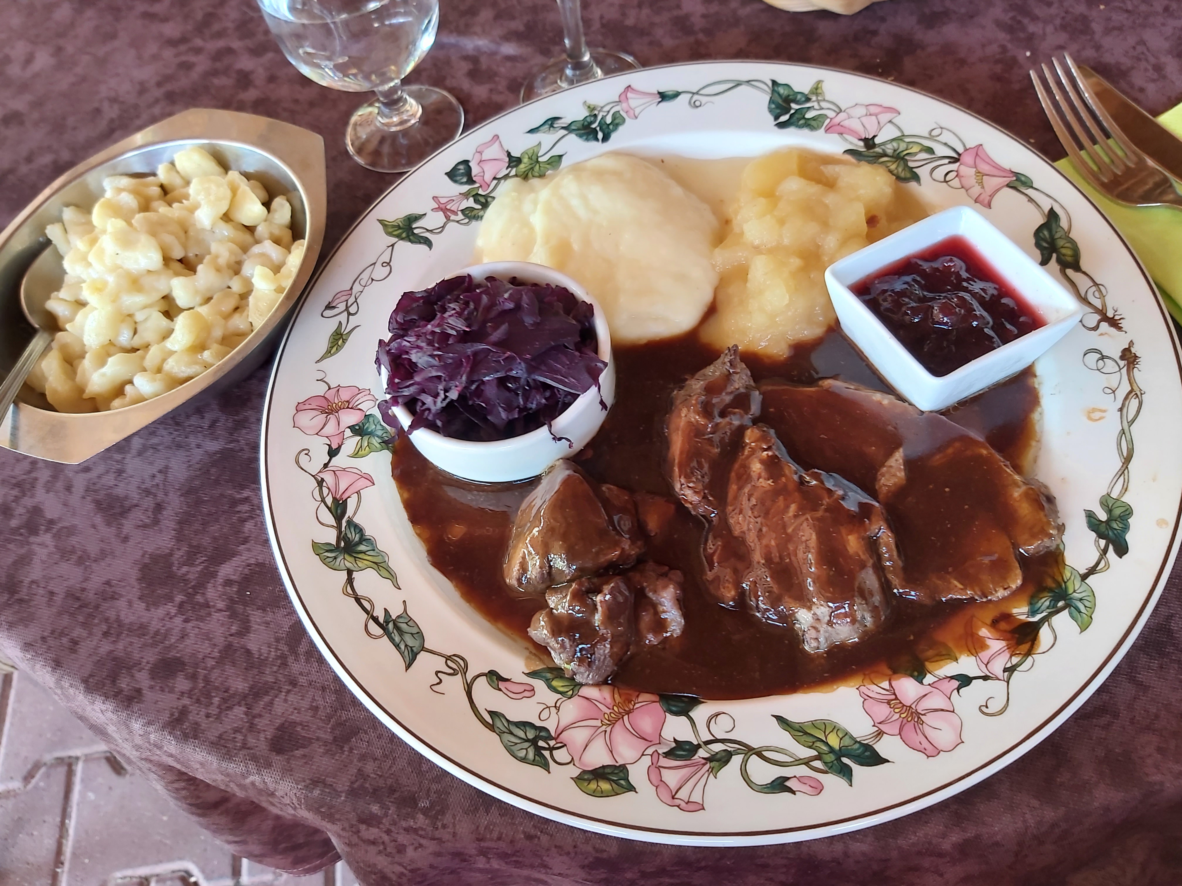 Très bonne nourriture fraîchement préparée et service agréable à un très bon rapport qualité-prix. Malheureusement, l'espace extérieur avec une grande terrasse couverte ne semblait pas aussi accueillant que l'espace intérieur. Après une longue randonnée vers les nombreux châteaux de la région, mais ça va toujours. Mais cela pourrait aussi être dû au fait que la haute saison n'avait pas encore vraiment commencé au moment de notre visite. Je lui donnerais donc 4,5 étoiles car il y a encore une petite marge d'amélioration dans l'ambiance extérieure.
