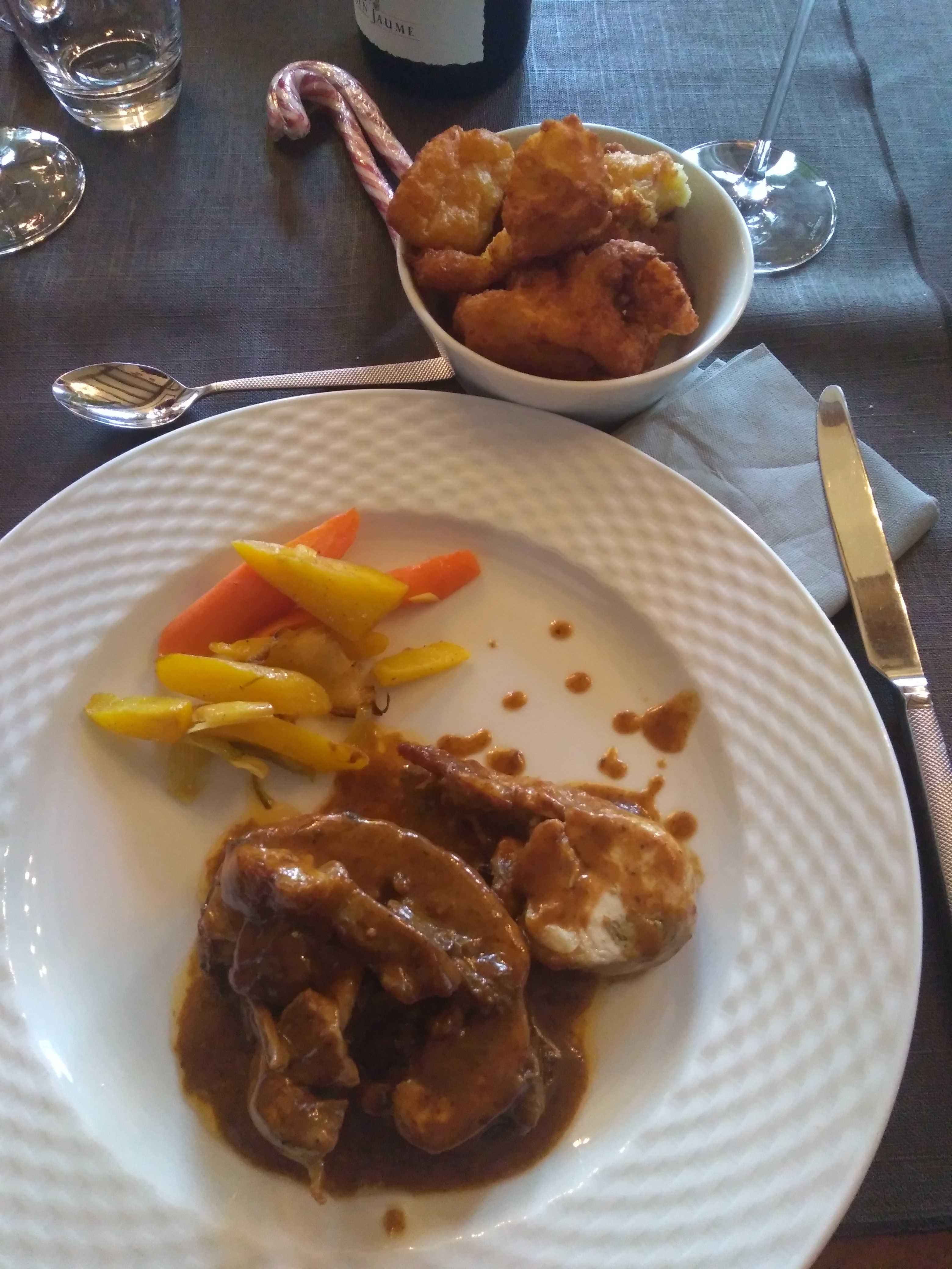 Un repas de noël facturé à un prix qui ne le vaut pas. Un manque de goût et de qualité Une triologie de foie gras que dans un esprit trop sucré Un sorbet entre pas digestif du tout trop sucré en plus servi dans des verres à vin blanc Pommes dauphines sucrés une ballantine bof , en attendant les frites tout à refroidi même pas une proposition de sauce chaude dommage Et le dessert sans commentaire Je vous souhaite juste du courage et de la persévérance